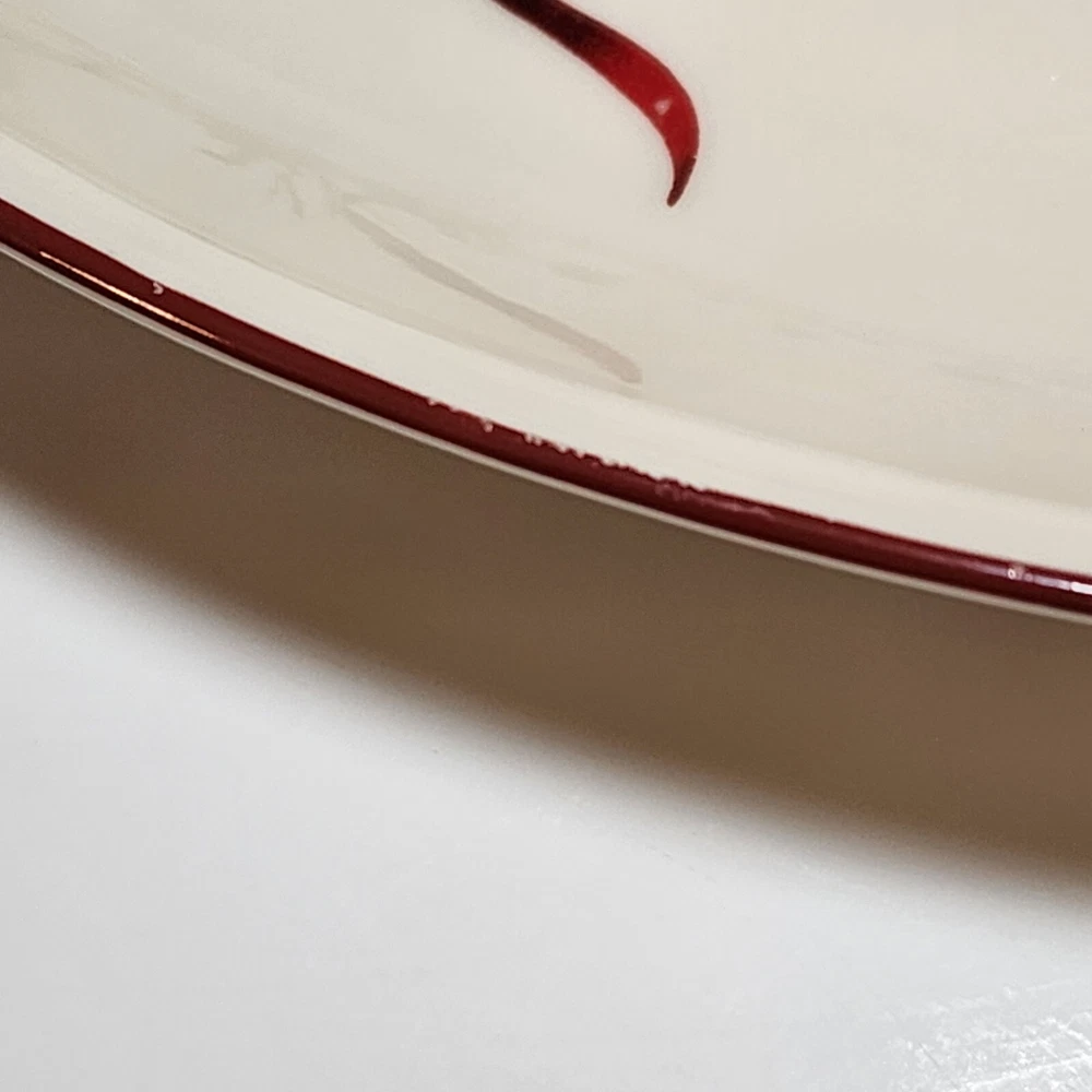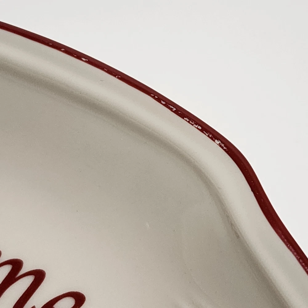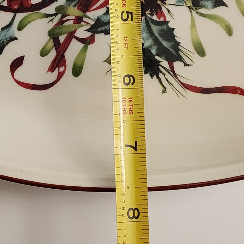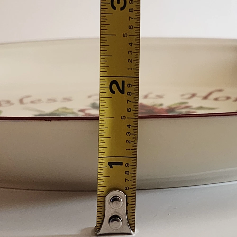 The Lenox American Winter Greetings "Bless This Home" 11-inch Oval Platter is made of porcelain and features a Beige color with a glossy finish. It has a Holiday Cardinals theme and a printed backstamp. This platter is part of the Winter Greetings product line by Lenox and is dishwasher safe. Measuring 11 inches in length, 7.25 inches in width, and 1.25 inches in height, this oval platter has one compartment and weighs 2 lbs. It is a charming piece for serving and displaying during the winter season. Lenox American by Design Winter Greetings, Bless This Home 11” platter with a beautiful red cardinal sitting among a holly, pine cone and ribbon background. Red trim has minor wear as indicated in photos. Beautiful accent piece for serving appetizers, decorating, or gift giving.