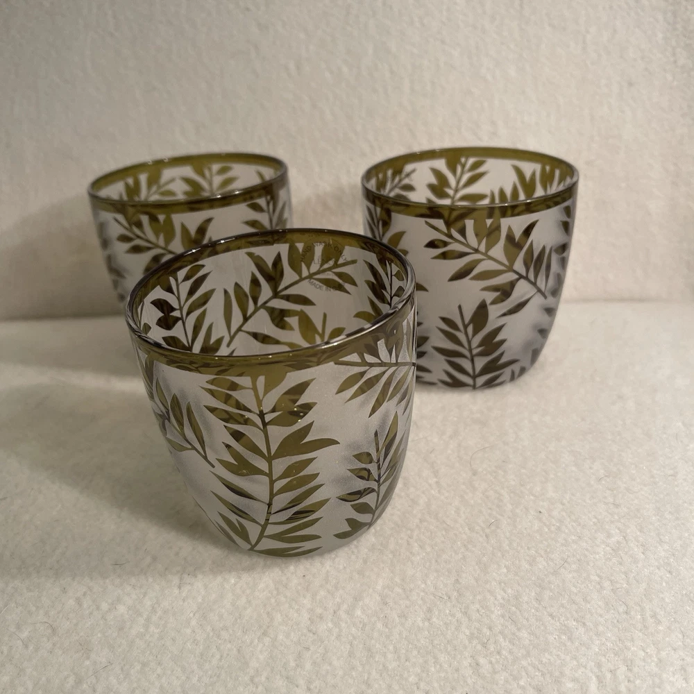 The Lenox Botanical Boutique Green Fern Frosted Votive Candle Holder Set features a modern design with a round shape and a decorative frosted finish. Each glass candle holder in this set of 3 is adorned with a green fern pattern, making them suitable for all occasions. Standing at 3 inches tall and wide, they are designed to hold mini candles and weigh a total of 1.1 lbs. These original Lenox candle holders from the 2000s are perfect for adding a touch of elegance to any space. Excellent condition. New with tags.