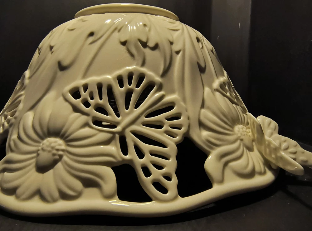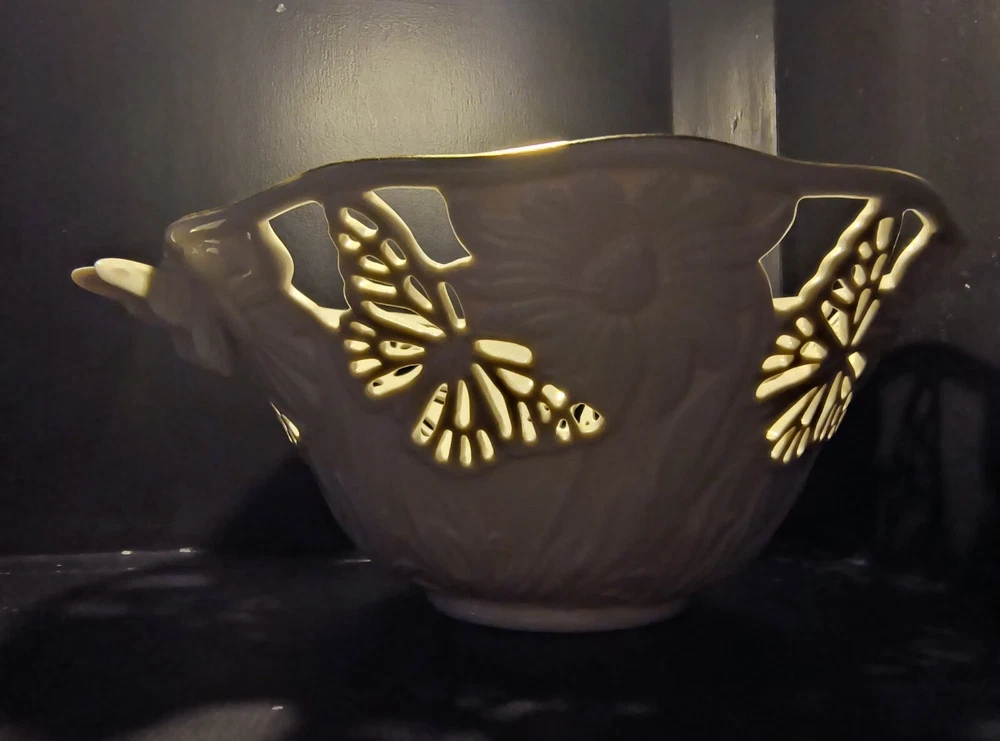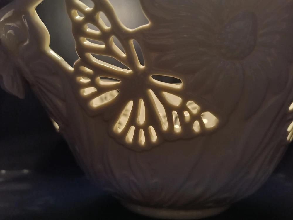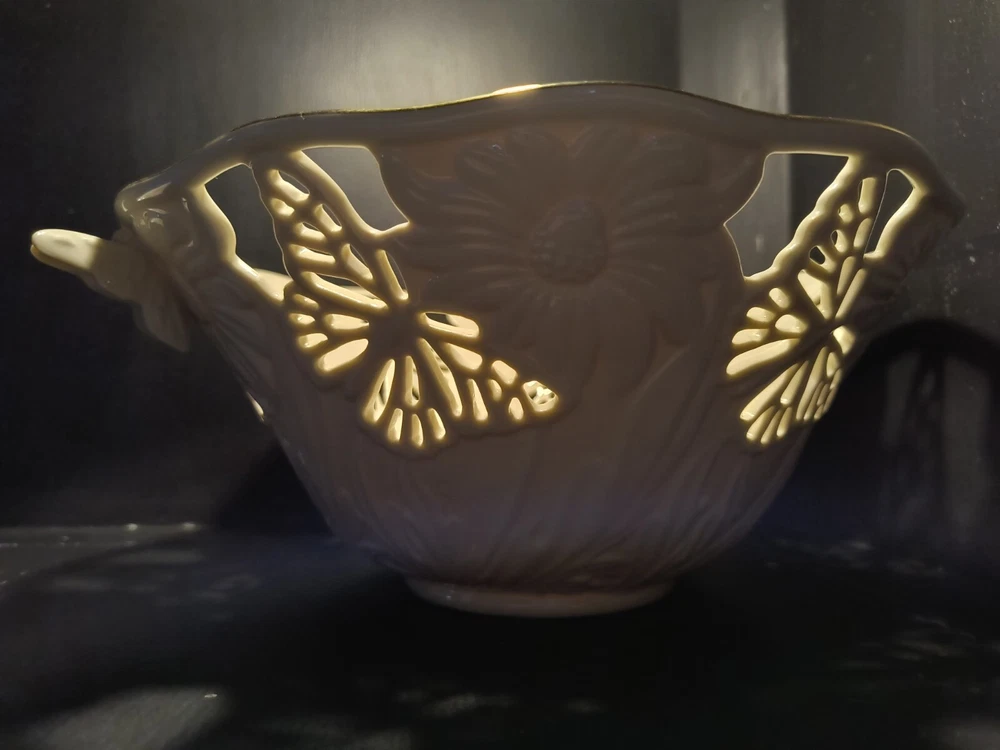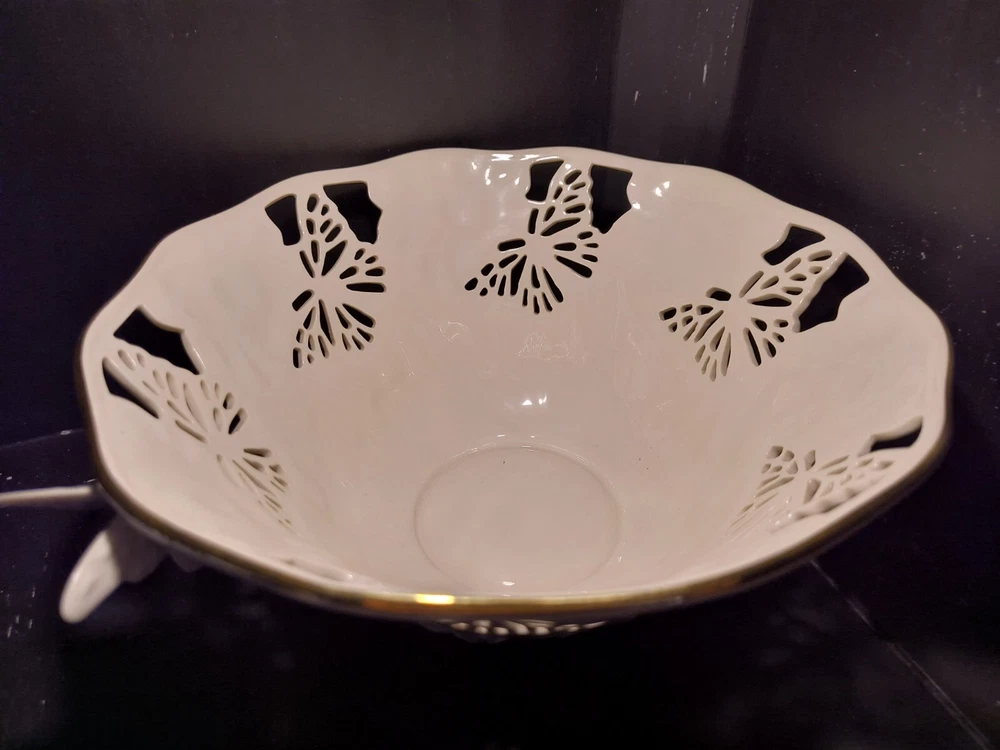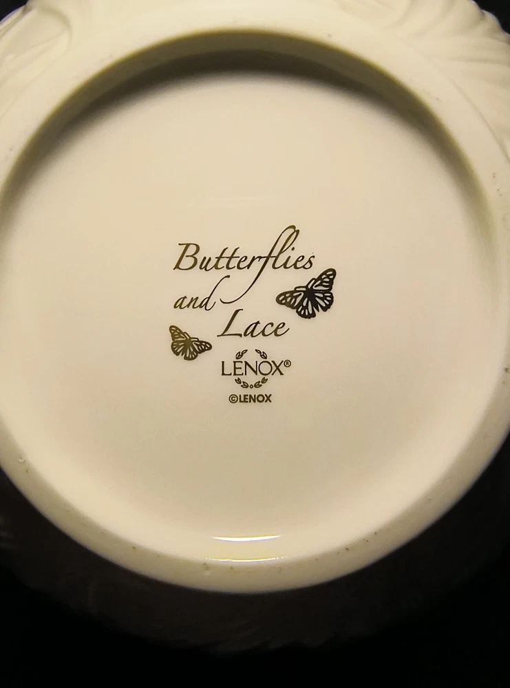 The Lenox Butterflies And Lace Bowl is a 9" cream-colored serving bowl made of porcelain. It features a design with butterflies and lace, inspired by a garden and floral theme. Perfect for collectors or for use in the kitchen or dining room, this bowl adds a touch of elegance and nature-inspired beauty to any table setting.