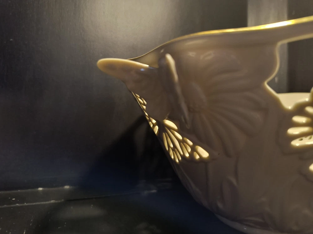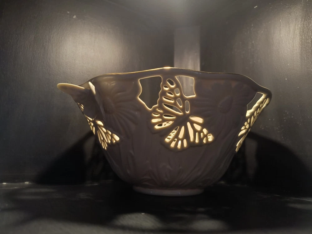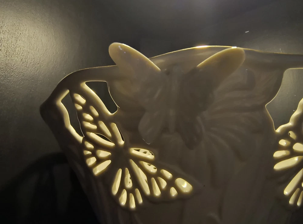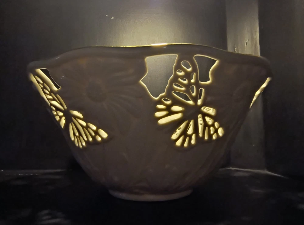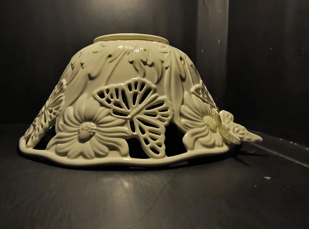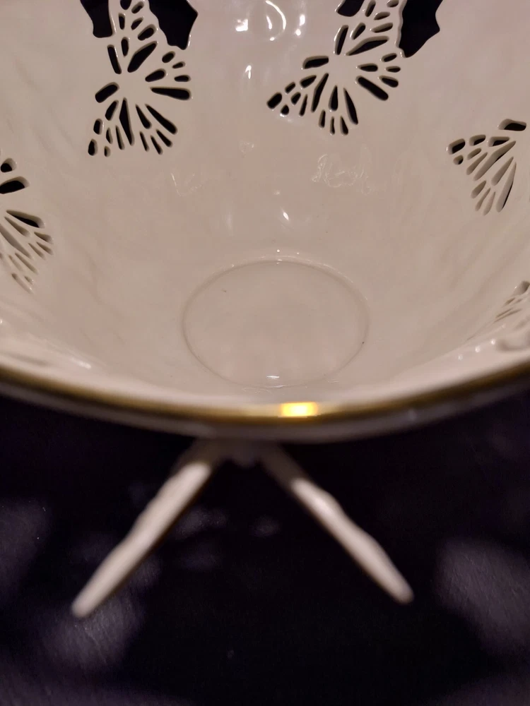 The Lenox Butterflies And Lace Bowl is a 9" cream-colored serving bowl made of porcelain. It features a design with butterflies and lace, inspired by a garden and floral theme. Perfect for collectors or for use in the kitchen or dining room, this bowl adds a touch of elegance and nature-inspired beauty to any table setting.