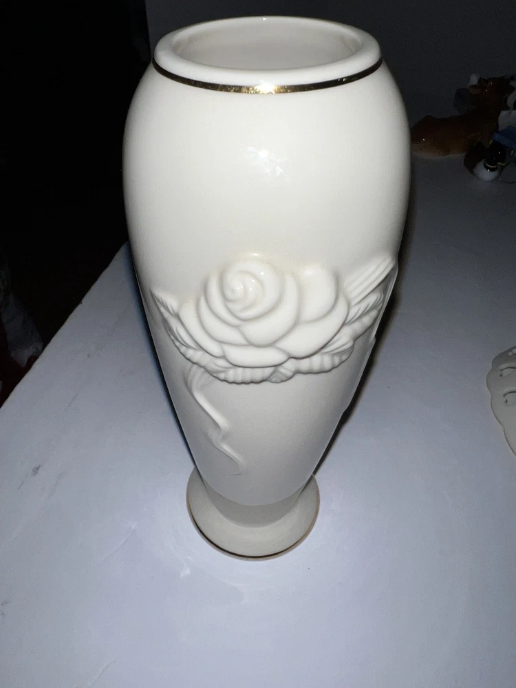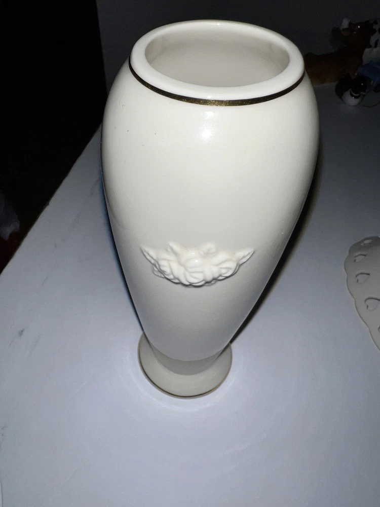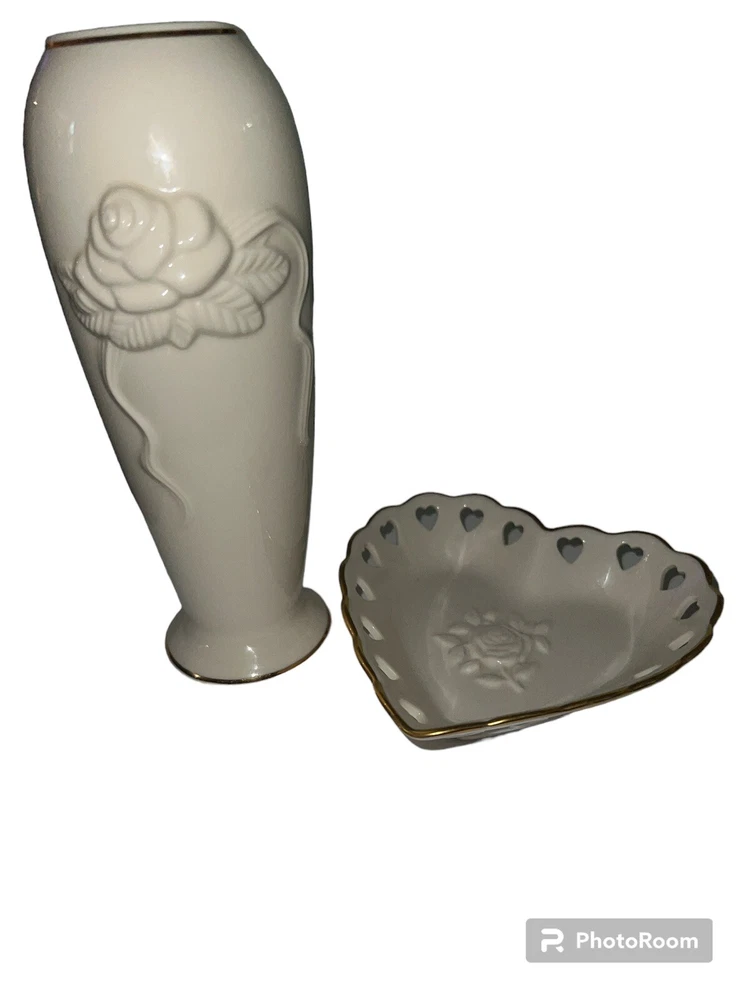 Vintage 2 Piece Set Of Lenox Hearts And Embossed Rose Cream Vase Bowl Set. Bowl made in USA Vase height is 6" made in Thailand.