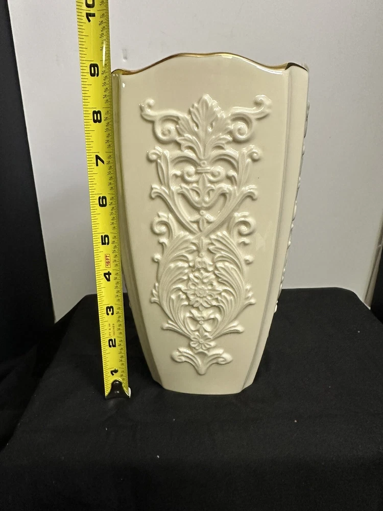 Add a touch of elegance to your home decor with this stunning Lenox Eros Porcelain Vase. Crafted with the finest materials, this vase features a glossy finish and 24K gold trim that adds a touch of luxury to any room. Measuring 9x5 inches, this large vase is perfect for displaying your favorite flowers or as a standalone decorative piece. The white color of the vase complements any interior and makes it an ideal addition to your collection of decorative collectibles. Whether you're a vase collector or looking for a statement piece for your home, this Lenox vase is sure to impress. Excellent condition, no chips or cracks.