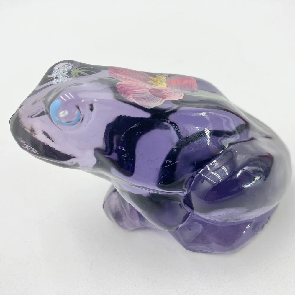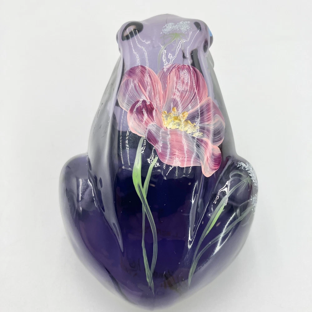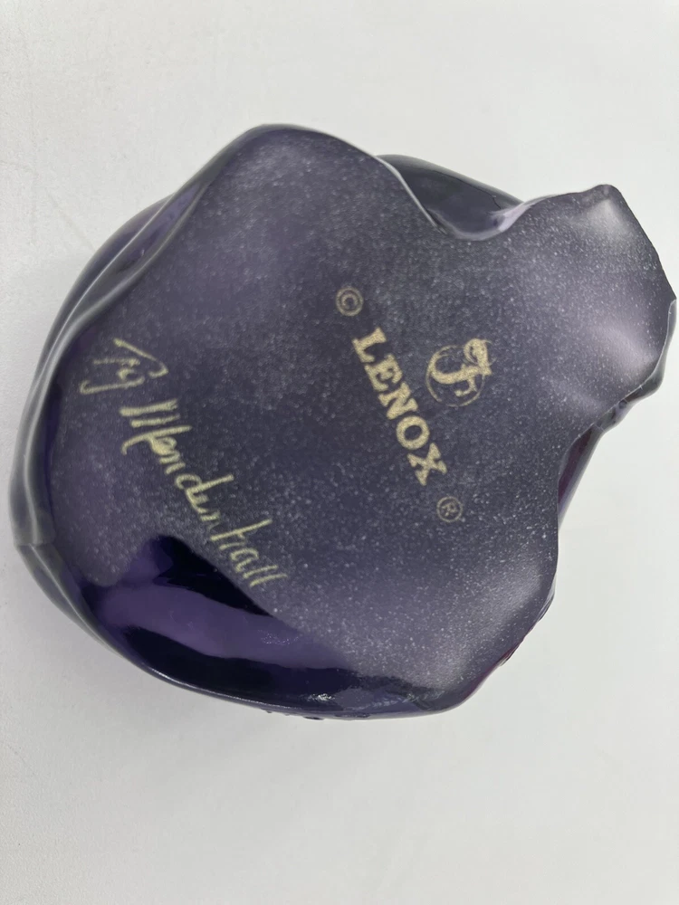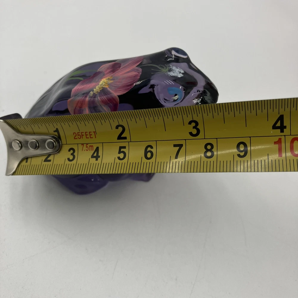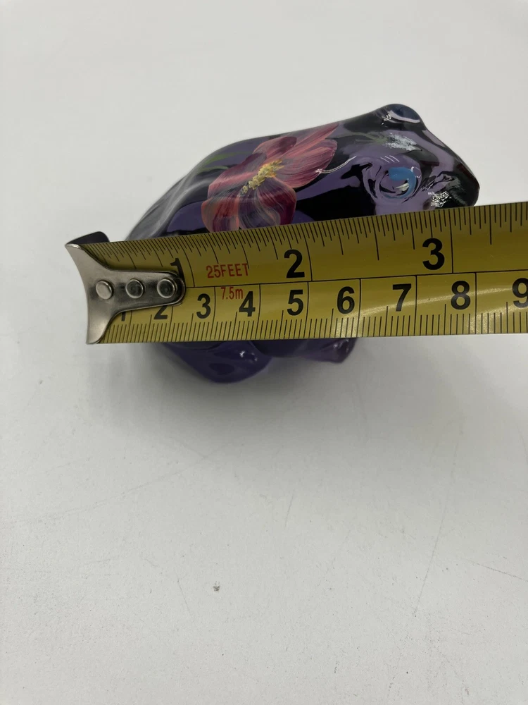 This exquisite figurine of a frog is a stunning addition to any collection. Hand-painted with intricate floral patterns, this LENOX FENTON LILA figurine is made of glossy fused glass and boasts a beautiful purple color. Measuring at 4 inches in length and 2.5 inches in height, this original piece is a perfect representation of the nature-inspired theme of frogs and flowers. The figurine is signed and comes with a backstamp impressed from the production style of art glass. Produced in 2005 in the United States, this decorative piece is a part of the Lila The Little Purple Frog product line. It is a perfect item for those who love animals, nature, and beautiful art glass. CONDITION: Pre-owned in good condition. No chips, cracks, damage. Comes with original sticker. ****SHIPS NEXT BUSINESS DAY***