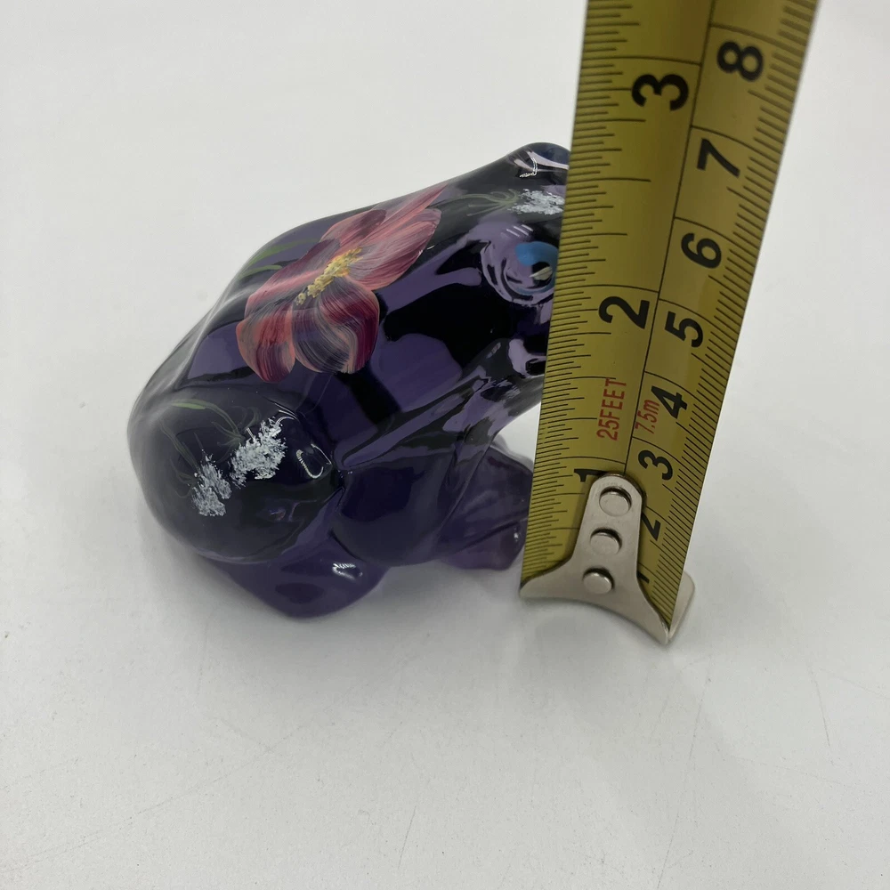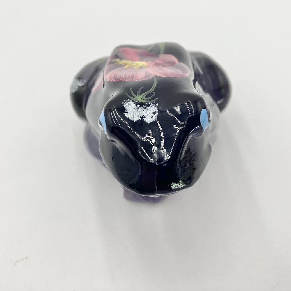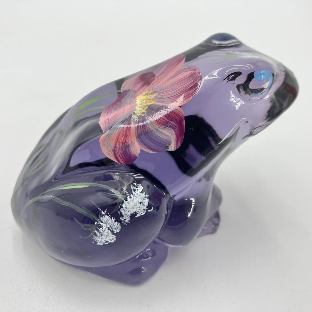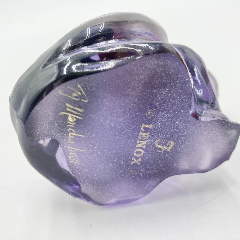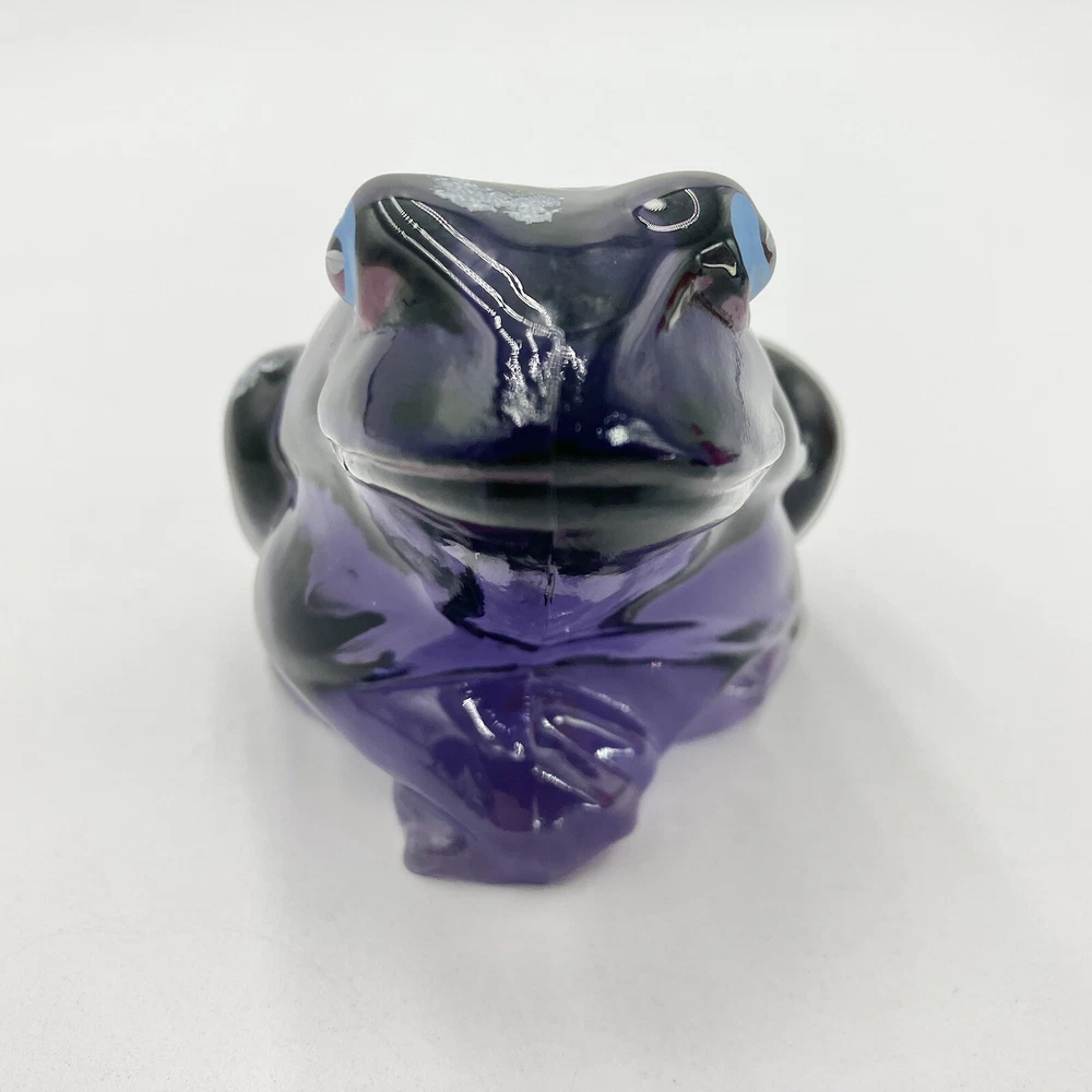 This exquisite figurine of a frog is a stunning addition to any collection. Hand-painted with intricate floral patterns, this LENOX FENTON LILA figurine is made of glossy fused glass and boasts a beautiful purple color. Measuring at 4 inches in length and 2.5 inches in height, this original piece is a perfect representation of the nature-inspired theme of frogs and flowers. The figurine is signed and comes with a backstamp impressed from the production style of art glass. Produced in 2005 in the United States, this decorative piece is a part of the Lila The Little Purple Frog product line. It is a perfect item for those who love animals, nature, and beautiful art glass. CONDITION: Pre-owned in good condition. No chips, cracks, damage. Comes with original sticker. ****SHIPS NEXT BUSINESS DAY***