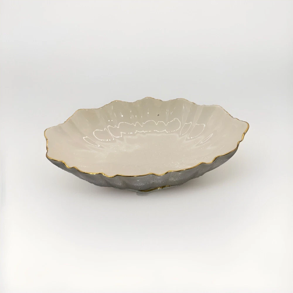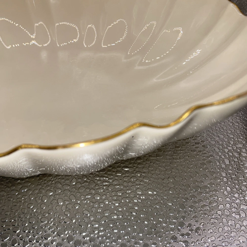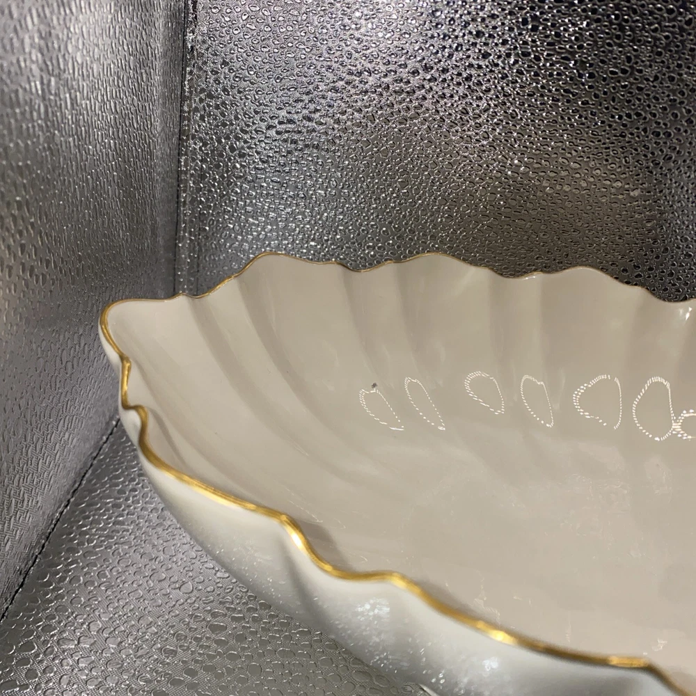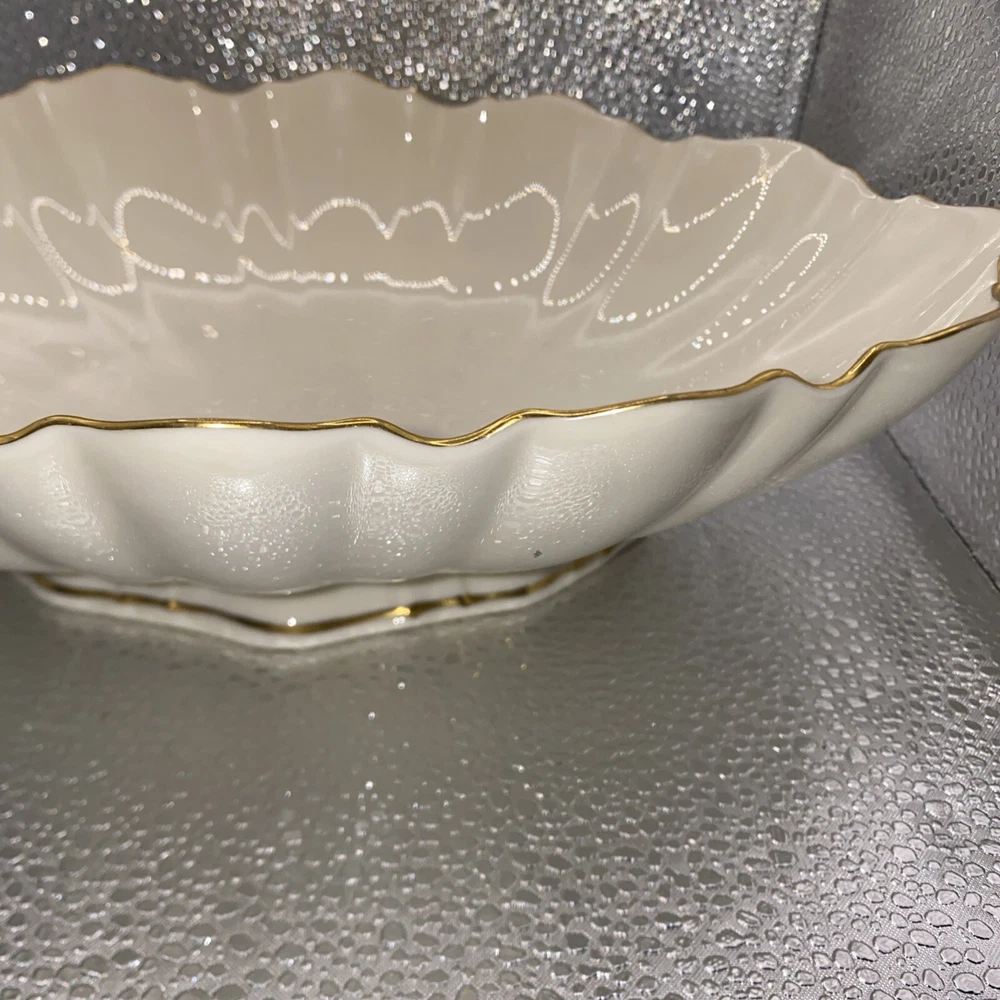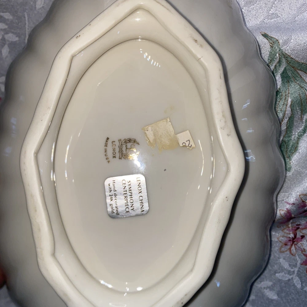 This beautiful Lenox centerpiece bowl is a stunning piece of art pottery from the Symphony product line. The scalloped pattern and glossy finish make it look like a vintage piece from the 1990s, but it was actually made in the United States. The bowl is made of porcelain and has a printed backstamp. Measuring 10.75 inches in length, 7 inches in width, and 3 inches in height, this bowl is the perfect size for any room. It has a contemporary style and can be used as a vase, candy dish, or to hold nuts and other small items. The 24k gold trim adds a touch of elegance to this center piece.