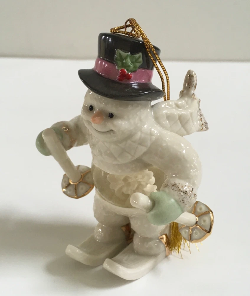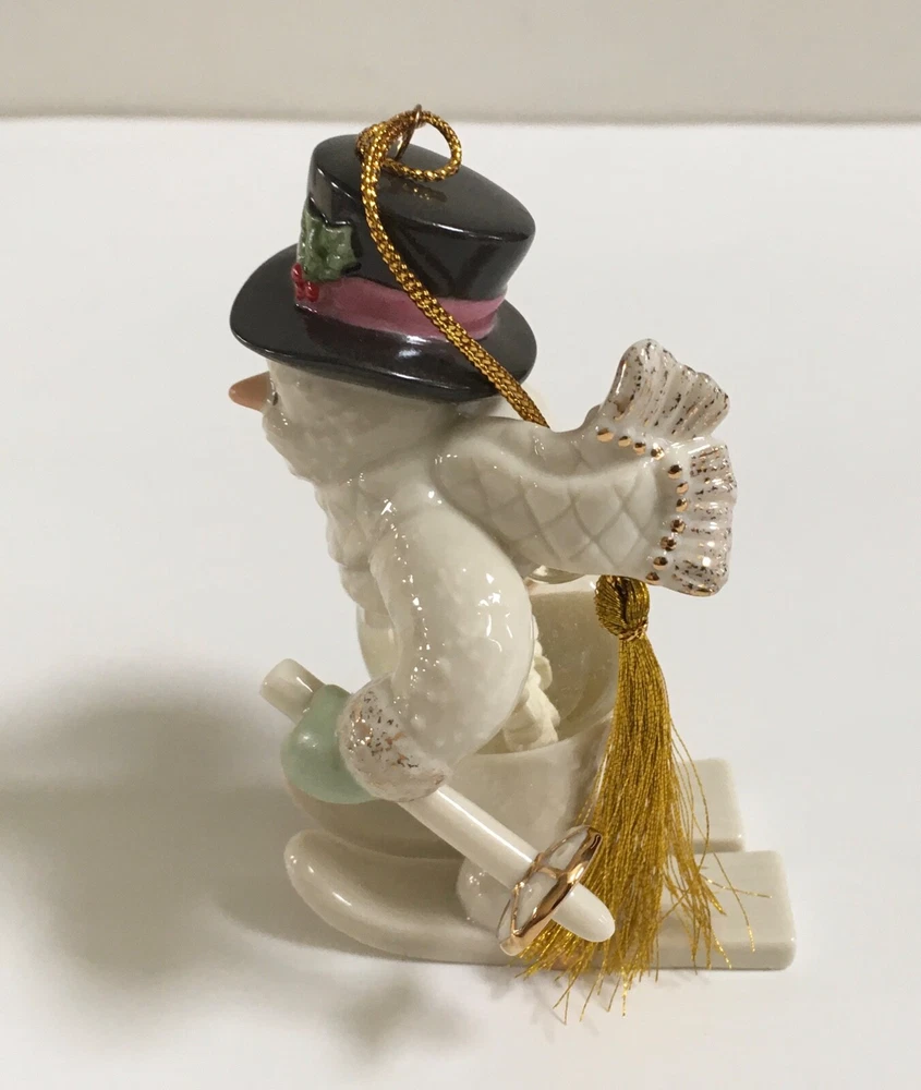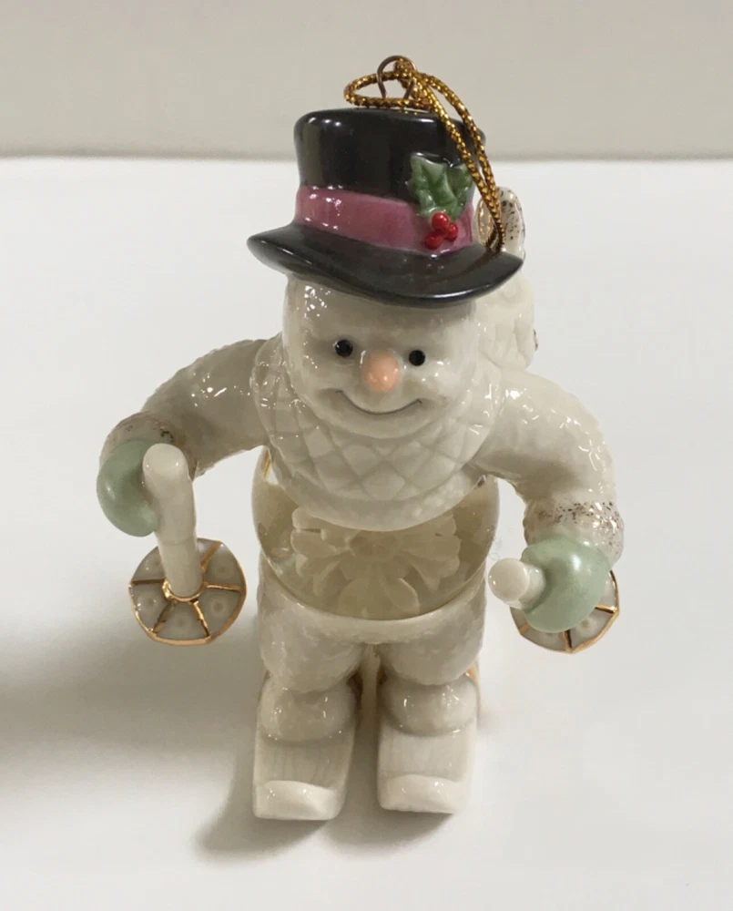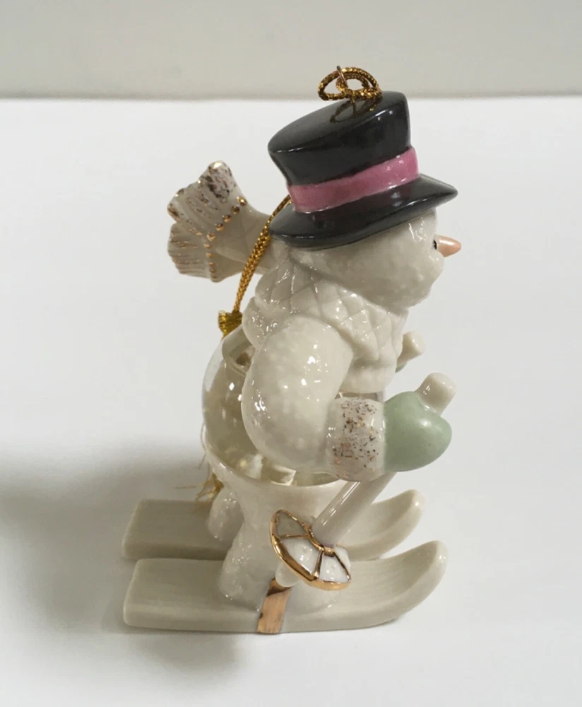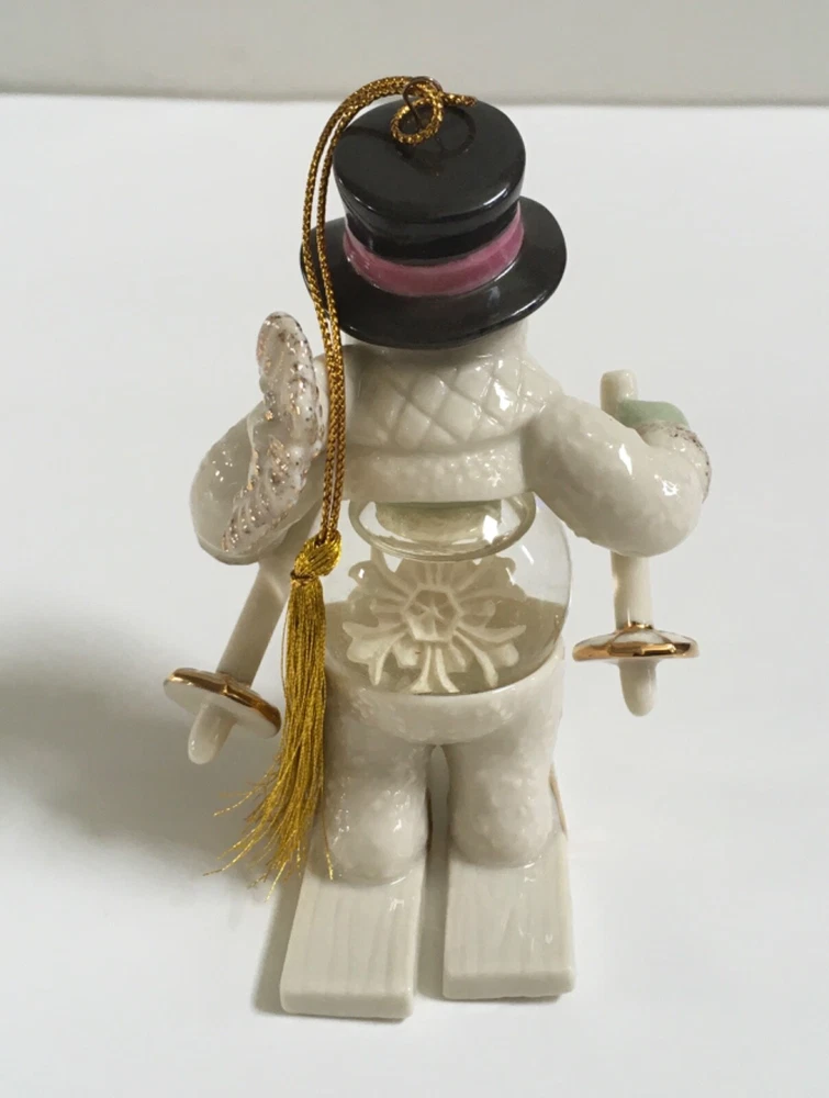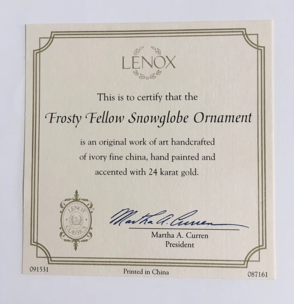 Lenox Frosty Fellow Snowman Snow Globe Ornament Crafted of hand painted ivory fine china, accented with 24 karat gold. The ornament bears the Lenox hallmarks. The height of ornament is about 4 inches. New in box. The box has some minor wear due to storage. Please see photos closely for more details and condition. Pictures are part of the description. Thank you for looking.