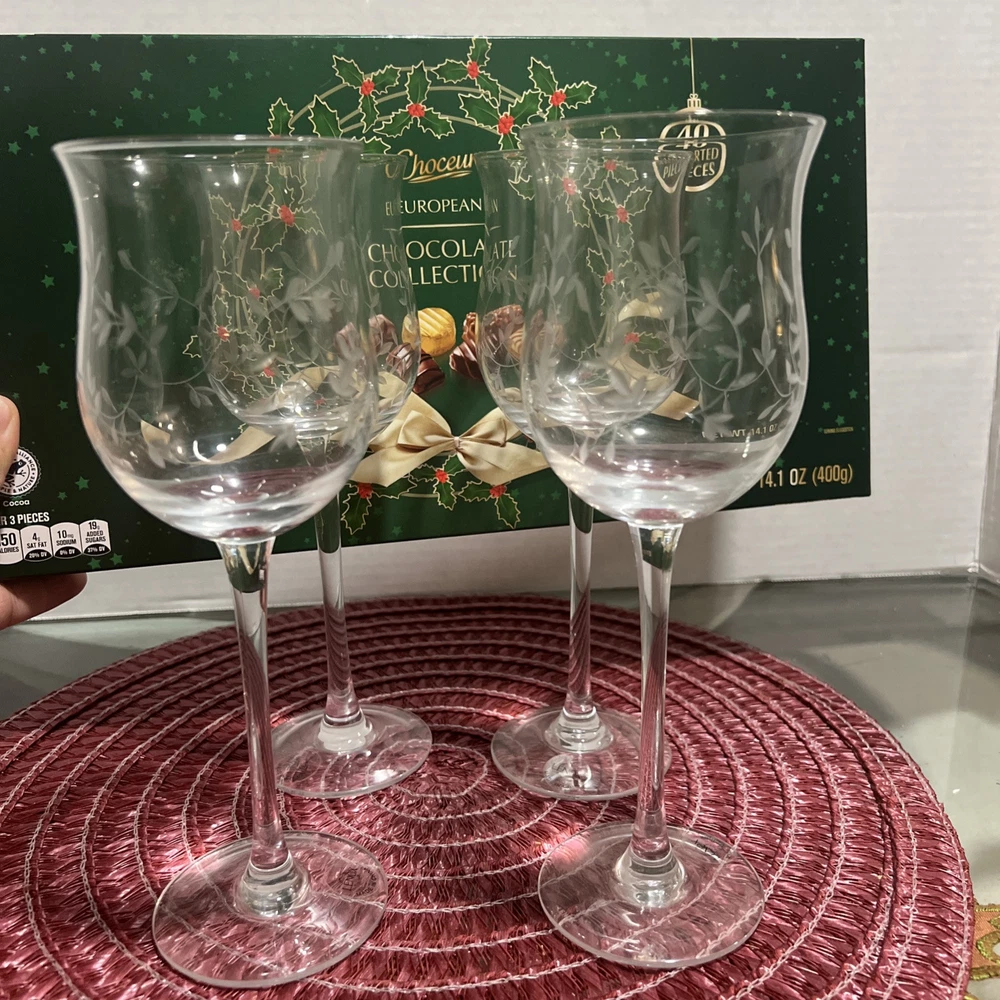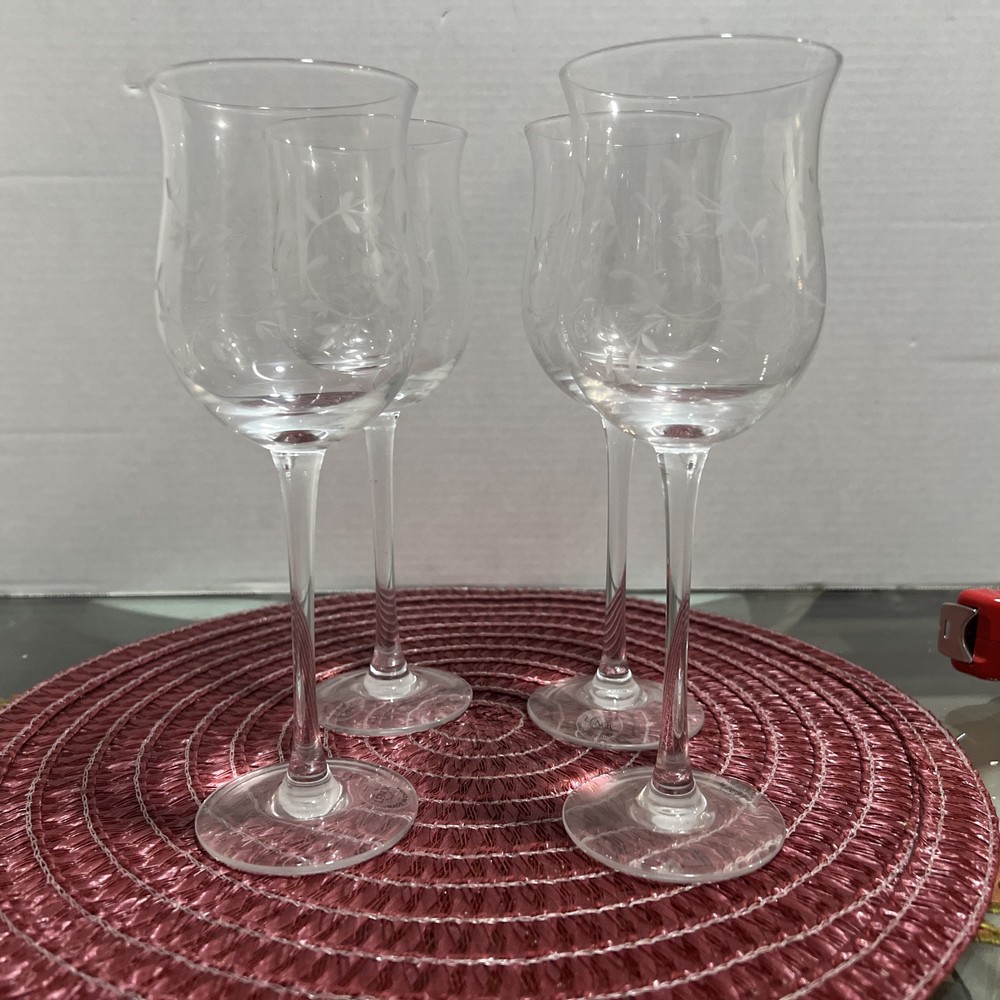 This set of Lenox Heather Tulip Wine Glasses features a four piece design made of clear blown crystal. Each glass is signed, with a smooth stem and measures 8 7/8" tall. The elegant design is perfect for all occasions and showcases a classic Heather pattern. Made in the United States using traditional glassmaking techniques. No chips or cracks , color looks Great Look at the pictures before making your purchase