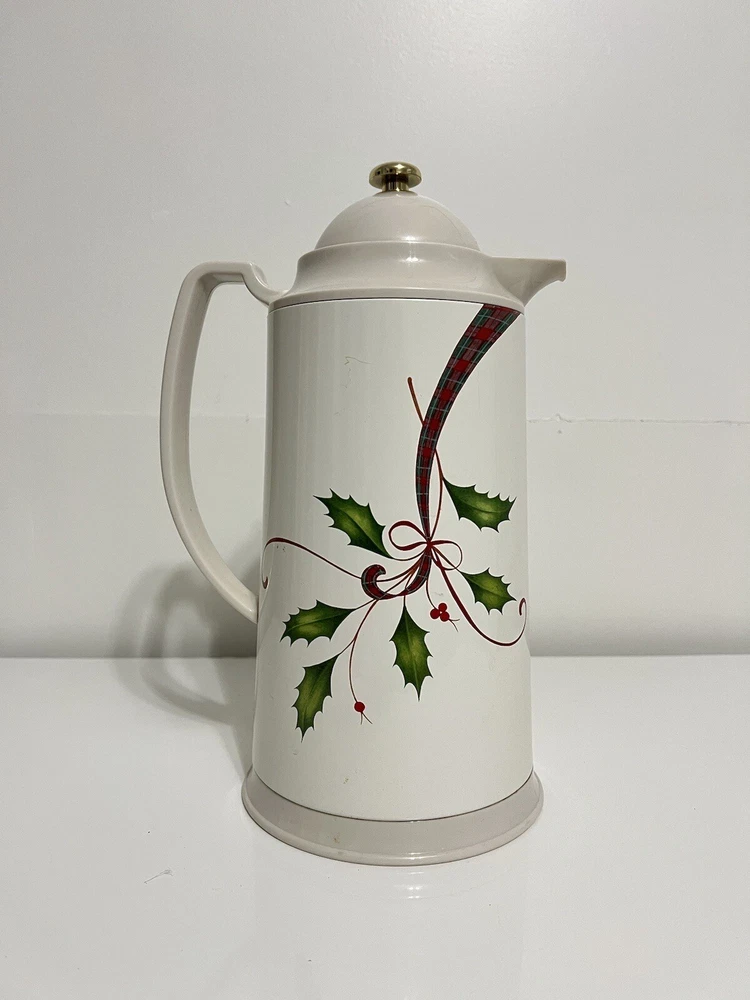 This Lenox carafe/pitcher is perfect for serving drinks during the holiday season. The gold accents and holly berry pattern add a festive touch to any occasion. Made of high-quality thermal plastic, this carafe is durable and can keep beverages at the desired temperature for a longer time. It is ideal for serving hot or cold drinks and can hold a generous amount of liquid. The contemporary design of this carafe makes it a must-have for any home during the holiday season.