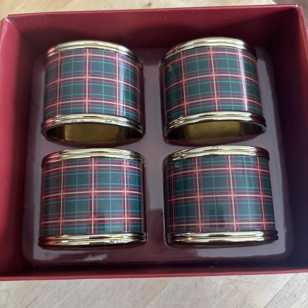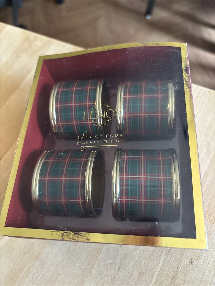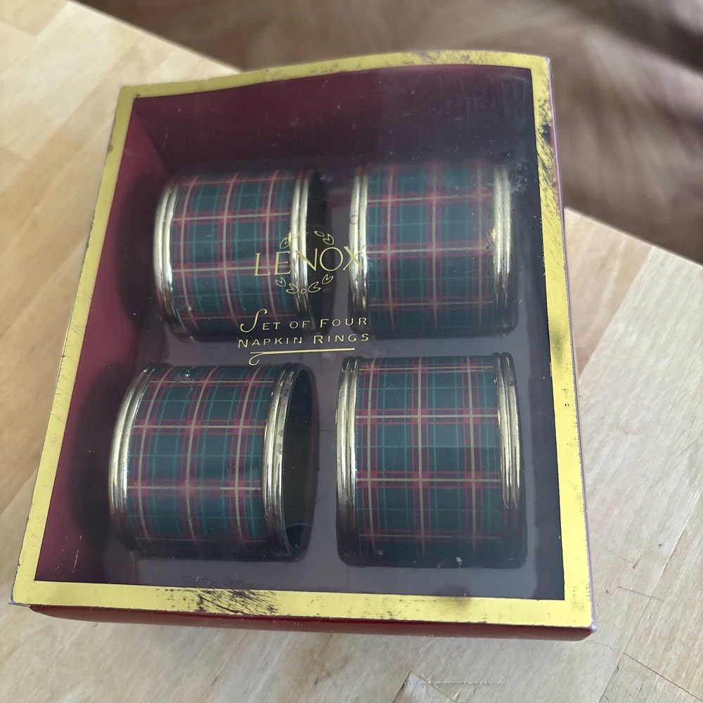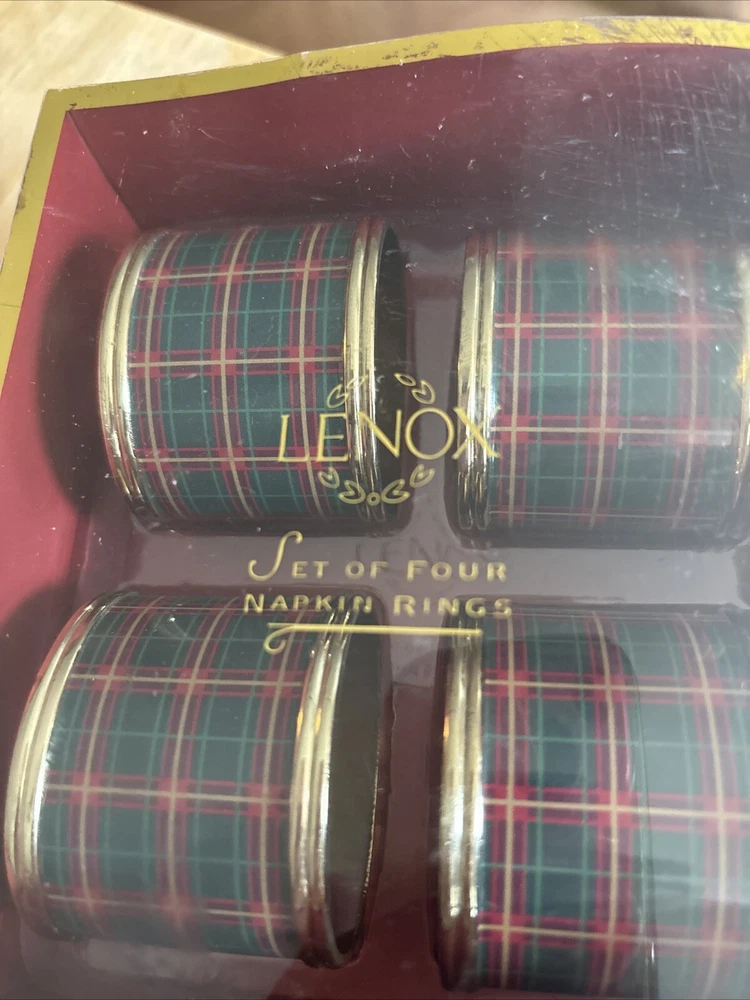 Lenox set of four plaid napkin rings. These napkin rings are perfect for use during meals with family and friends, and are sure to impress your guests. The set is a must-have for those who appreciate fine dining and want to add a touch of sophistication to their table setting. Pre-owned