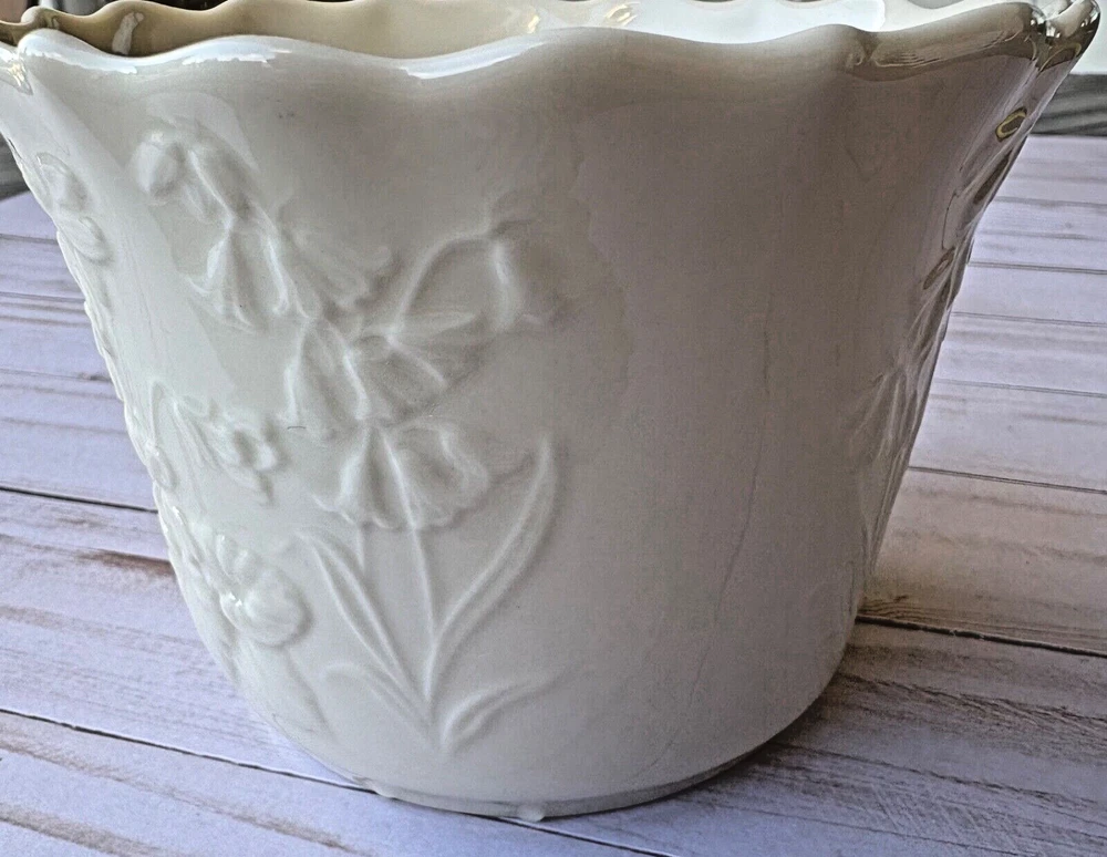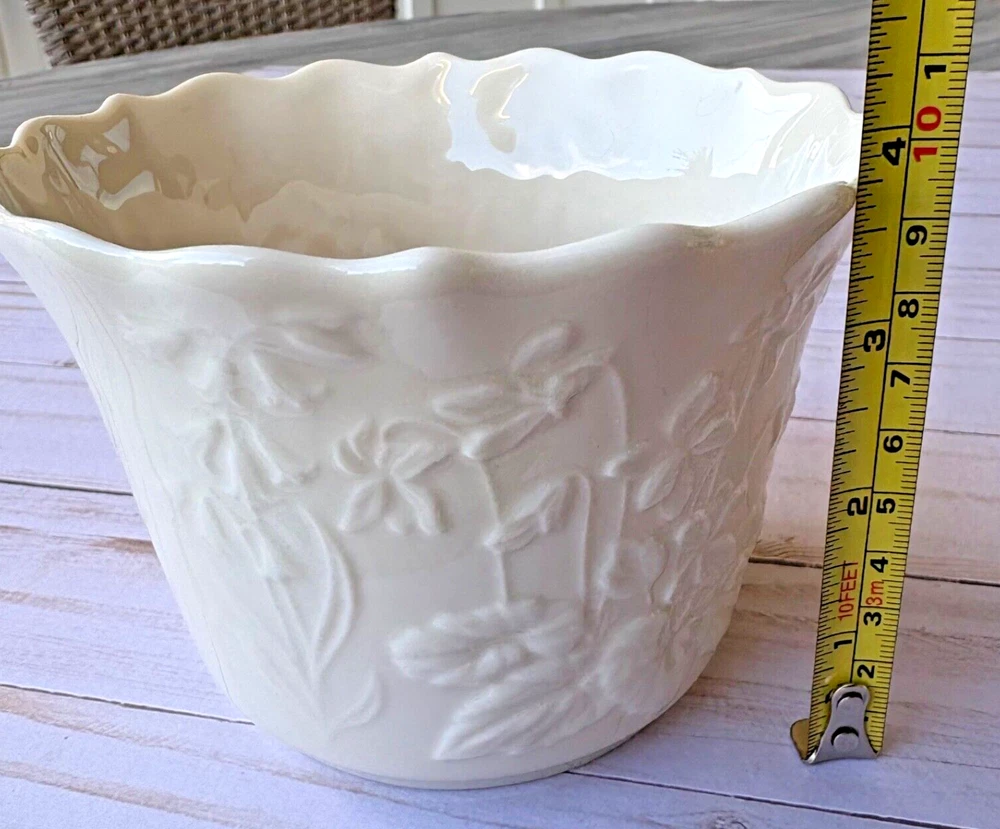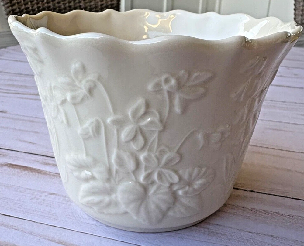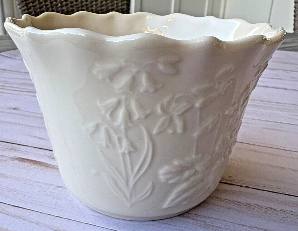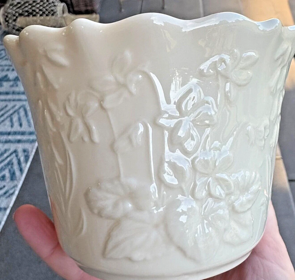 The Lenox Masterpiece Collection Small Cachepot Flower Pot is a medium-sized flower pot made of creamy ivory porcelain. It features a flower design, making it a decorative collectible piece for display.