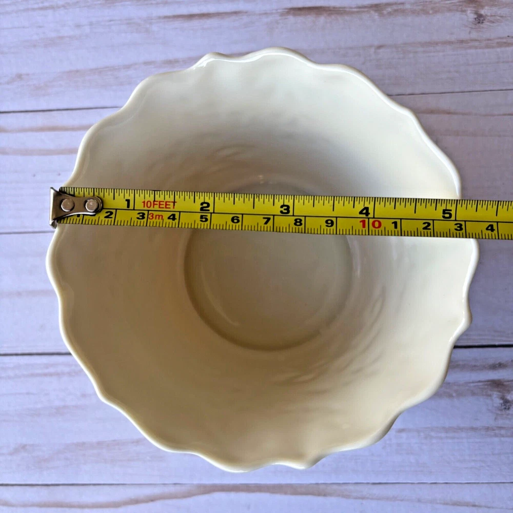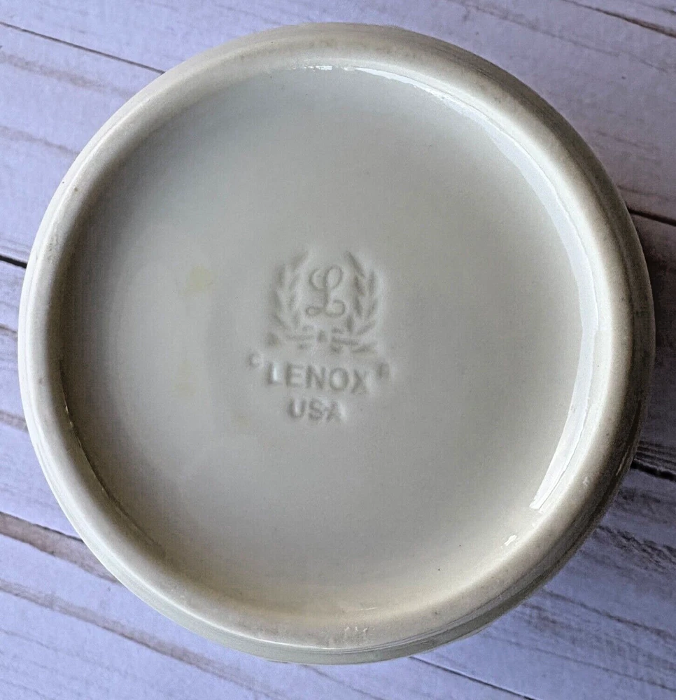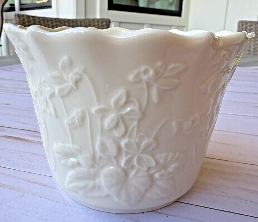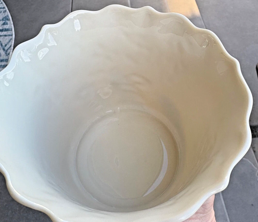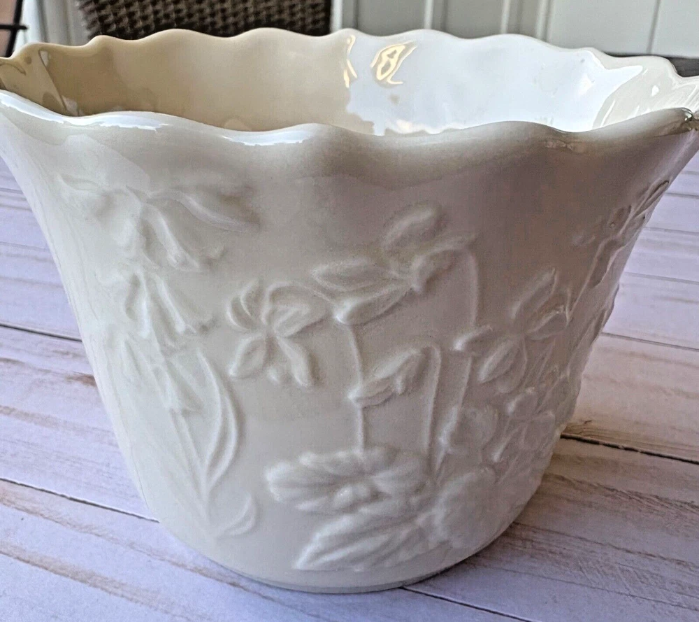 The Lenox Masterpiece Collection Small Cachepot Flower Pot is a medium-sized flower pot made of creamy ivory porcelain. It features a flower design, making it a decorative collectible piece for display.