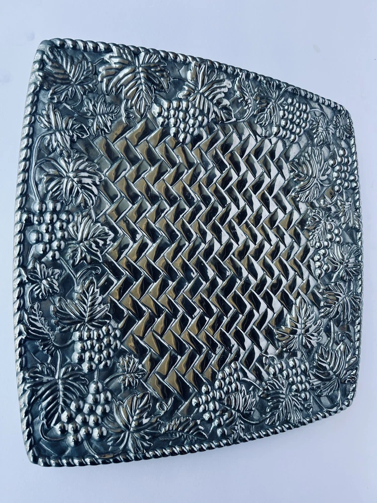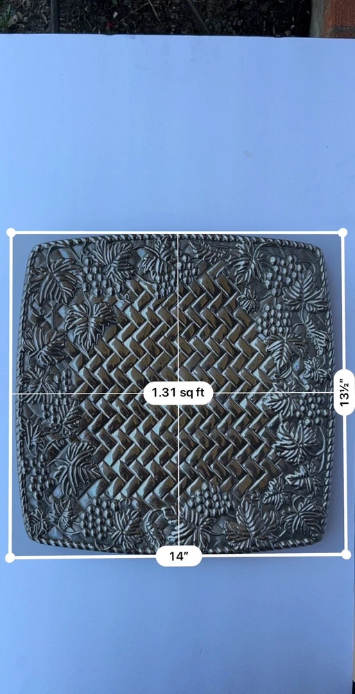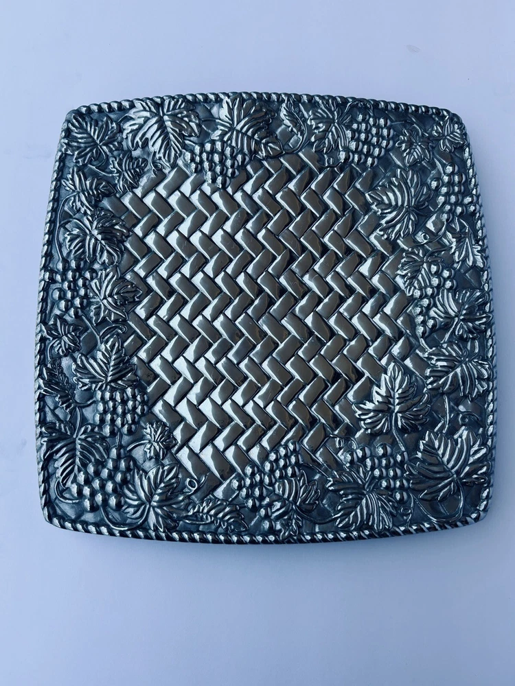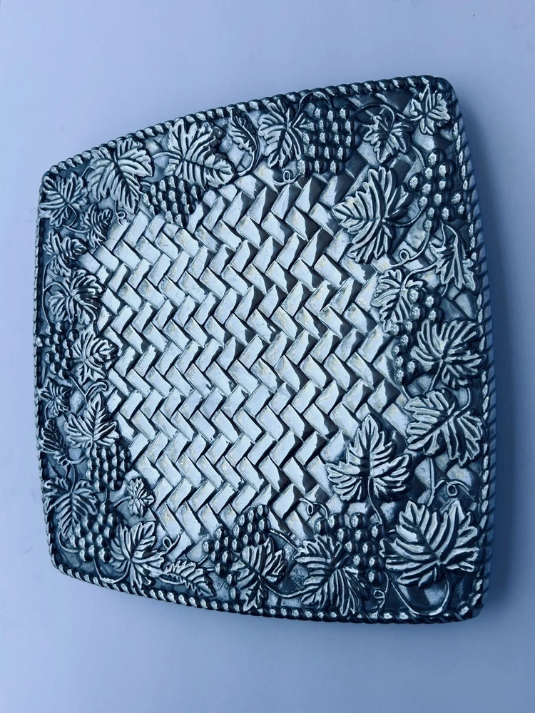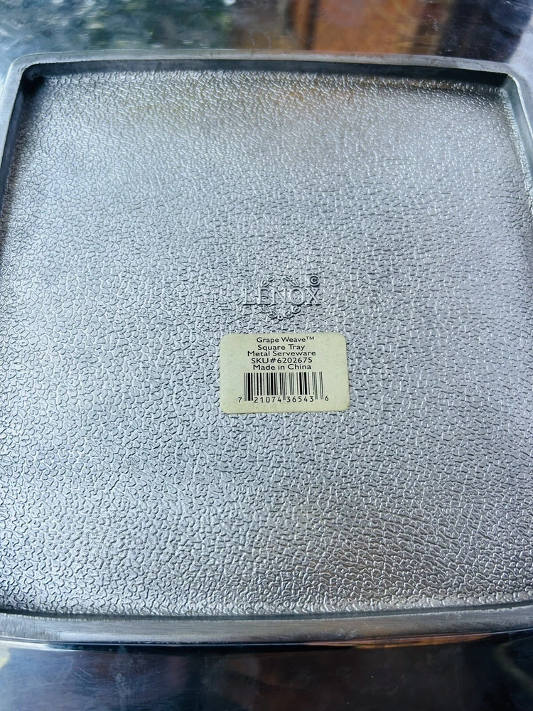 This Lenox metal serving platter is a stunning addition to any kitchen or dining room. The intricate weave pattern features a beautiful grape basket design, perfect for serving up your favorite meats or cheeses. Crafted from high-quality metal, this platter is both durable and stylish, with a sleek silver finish that will complement any table setting. Measuring in at XL size, this platter is perfect for serving up your guests with style and elegance. Whether you're hosting a formal dinner party or a casual family gathering, this Lenox platter is sure to impress. So why wait? Add this gorgeous piece to your collection today and elevate your dining experience! 9.5.24