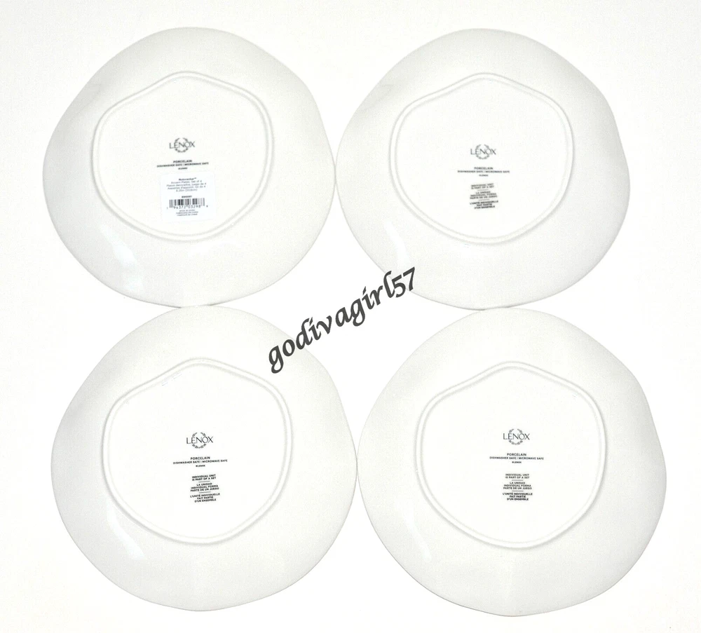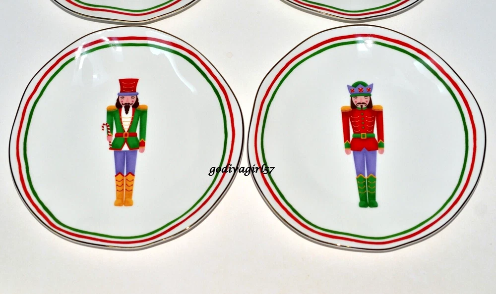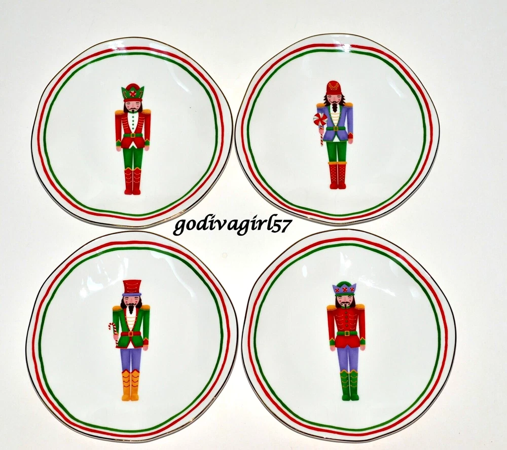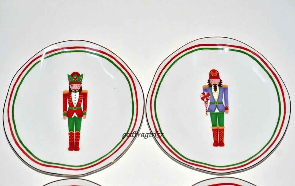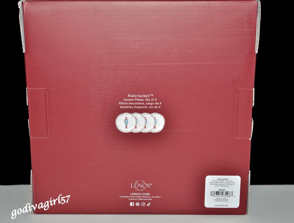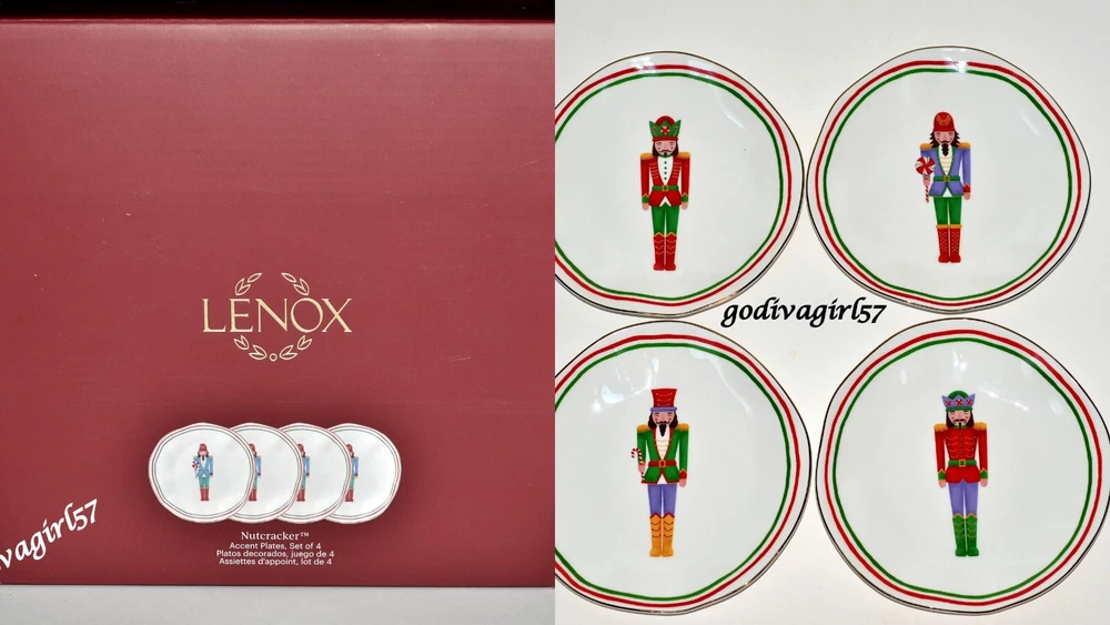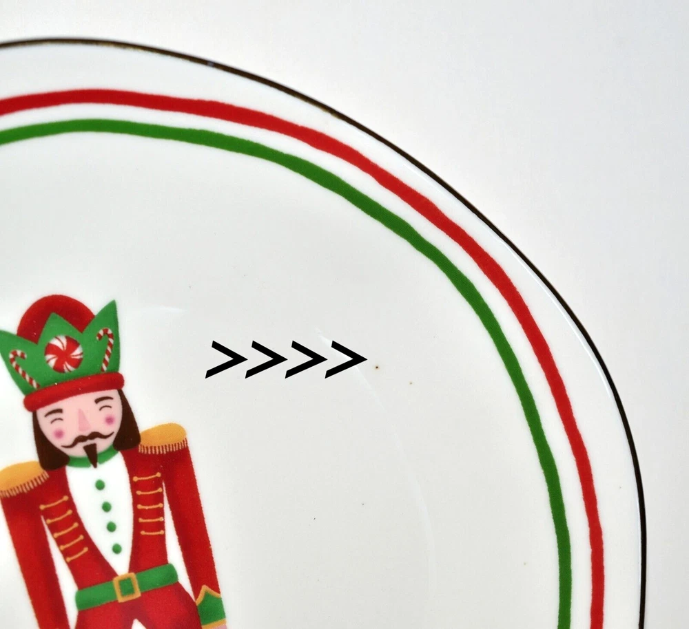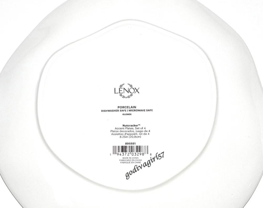 Lenox Nutcracker - Four accent / salad plates (each with a different design) - 8 1/4" diameter, gold edge, microwave and dishwasher safe - Brand new in the box, however I notice that one plate has a teeny dark speck in the glaze (see photo). SHIPPING: Your package will be sent within one business day and will be expertly packaged to ensure safe arrival.