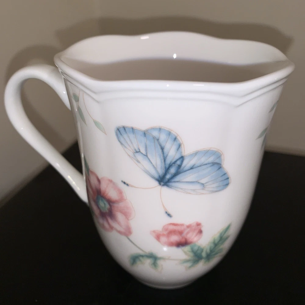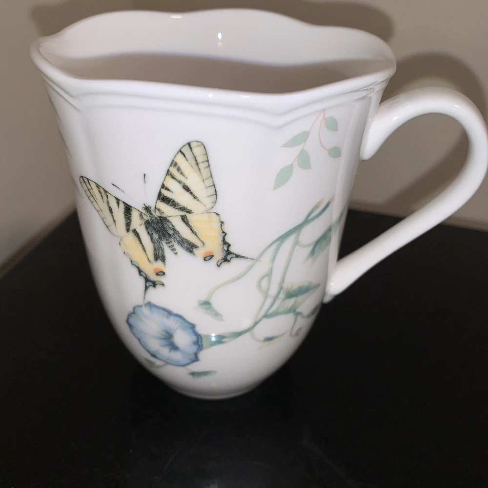 The Lenox Swallowtail Replacement Mug is part of the Butterfly Meadow Collection, featuring a round shape with a painted multicolor Swallowtail butterfly pattern on porcelain material. This small mug is suitable for hot beverages and has an item diameter of 3 and 1/4 inches, height of 4 and 1/4 inches, and width of 3.5 inches. It is designed for one person and comes as a single coffee cup/mug branded by Lenox, making it an elegant and artistic addition to any collection or table setting. Crafted in USA, Indonesia and China. New but has been rinsed off and dried.