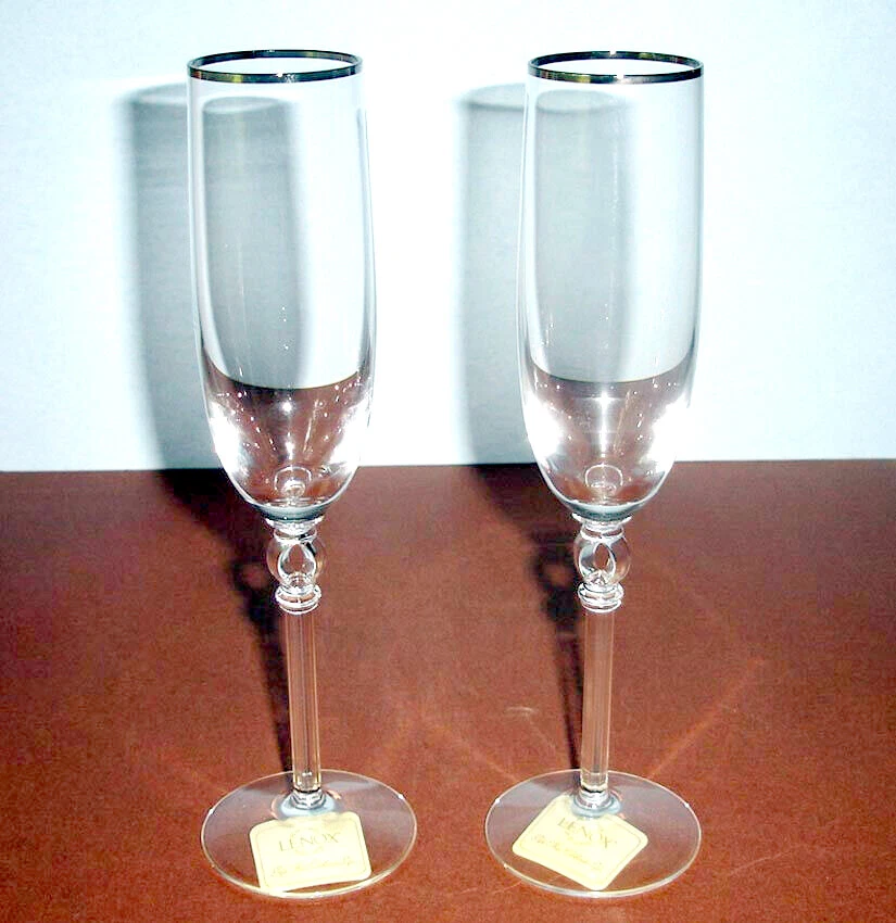 Lenox Platinum Innocence Crystal Champagne Flute Pair These unique elegant crystal flutes are adorned with a pierced ring in stem - an open oval shape at top of the multi- sided slender stem and the bowl is rimmed in a platinum band... perfect for any occasion. • Brand new with original stickers, never used. open stock-not in retail box, but will be carefully packed to ensure safe arrival • Expertly made in Germany of clear full lead crystal • Approx. 9-5/8" tall x 1-7/8" across top rim, 2" in diameter, hold-6 oz. • Etched with the "Lenox" hallmark on the base • Discontinued pattern - hard to find! ------------- Please closely examine the listing and submit any questions prior to purchase. Pictures may not reflect true colors due to various lighting conditions. Ships from a smoke-free, pet-free environment.