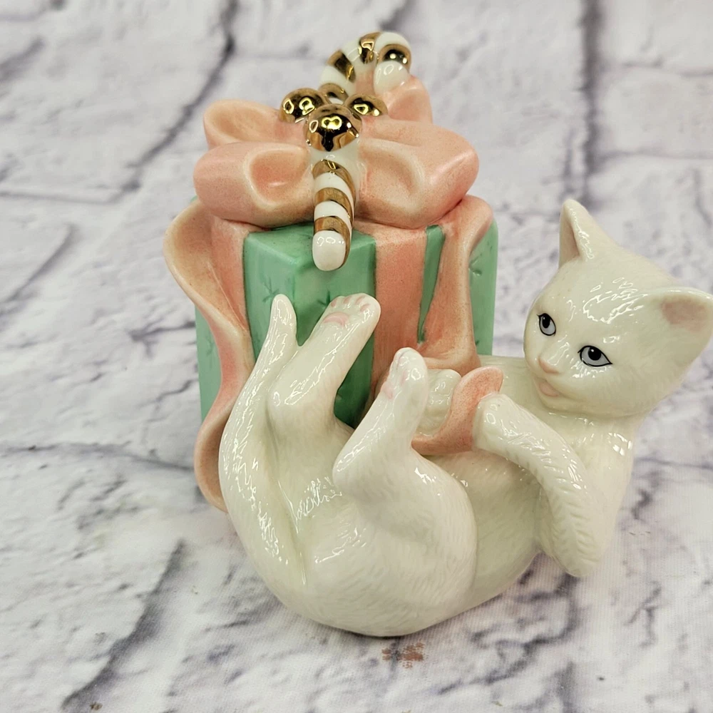 Lenox Porcelain Presently Curious Kitty Cat Figurine With Gift Golden Candy Cane ✨🎁 Celebrate the holiday spirit with this Lenox Presently Curious Kitty cat figurine, featuring a playful kitten exploring a wrapped gift adorned with a golden candy cane accent. This charming porcelain piece is perfect for cat lovers and Lenox collectors alike! 🌟 🎁 Why You’ll Love It: ✔ Authentic Lenox porcelain—renowned for its quality and timeless charm. 🏆✨ ✔ Holiday-themed design—perfect for festive décor or gifting. 🎄🐾 ✔ Hand-painted with gold accents, including a shimmering candy cane. 🌟💎 ✔ Adorable, playful kitty pose—a heartwarming addition to any collection. 🐱🎁 ✔ Great for holiday displays, keepsakes, or a thoughtful gift for cat lovers. 🎁❤️ 💚 Eco-Friendly Packaging: We carefully pack your Lenox figurine using recycled materials, ensuring safe and sustainable delivery. 🌍♻️ 🚚 Fast, Same-Day Shipping: Order today, and your Presently Curious Kitty figurine will ship the same day—ready to bring holiday cheer to your home! 📦✨ ✨ Don’t miss out—click Buy Now to own this festive Lenox kitty figurine today! 🐱🎄🌟