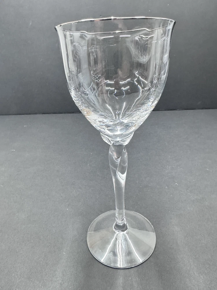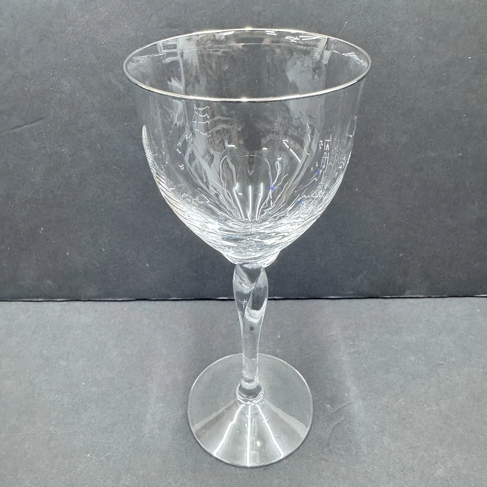 The Lenox Rhythm Platinum Water Goblet Glass is a vintage hand-blown piece from 1991, made in the USA. This elegant goblet features a contemporary style with a round shape and a twist stem etched with platinum trim. It has a 12 oz capacity and stands at 8.5" tall, making it suitable for various occasions. The swirl optic pattern adds a touch of sophistication to the glossy finish, making it a stylish addition to any drinkware collection.