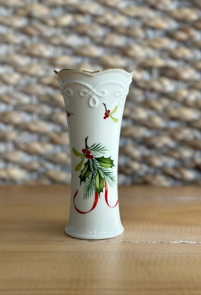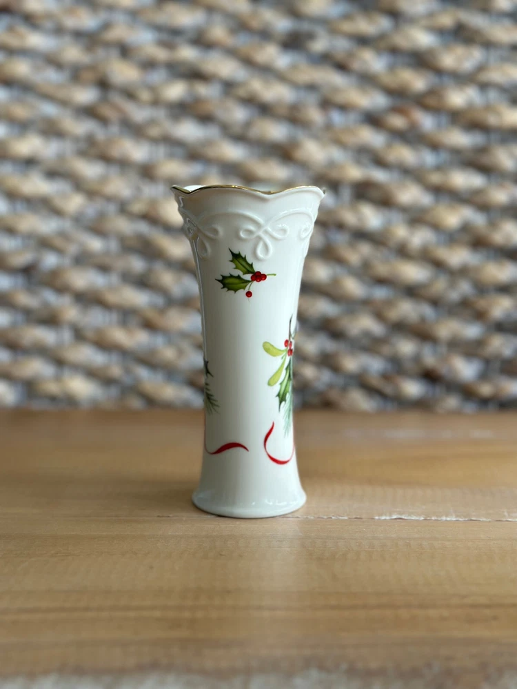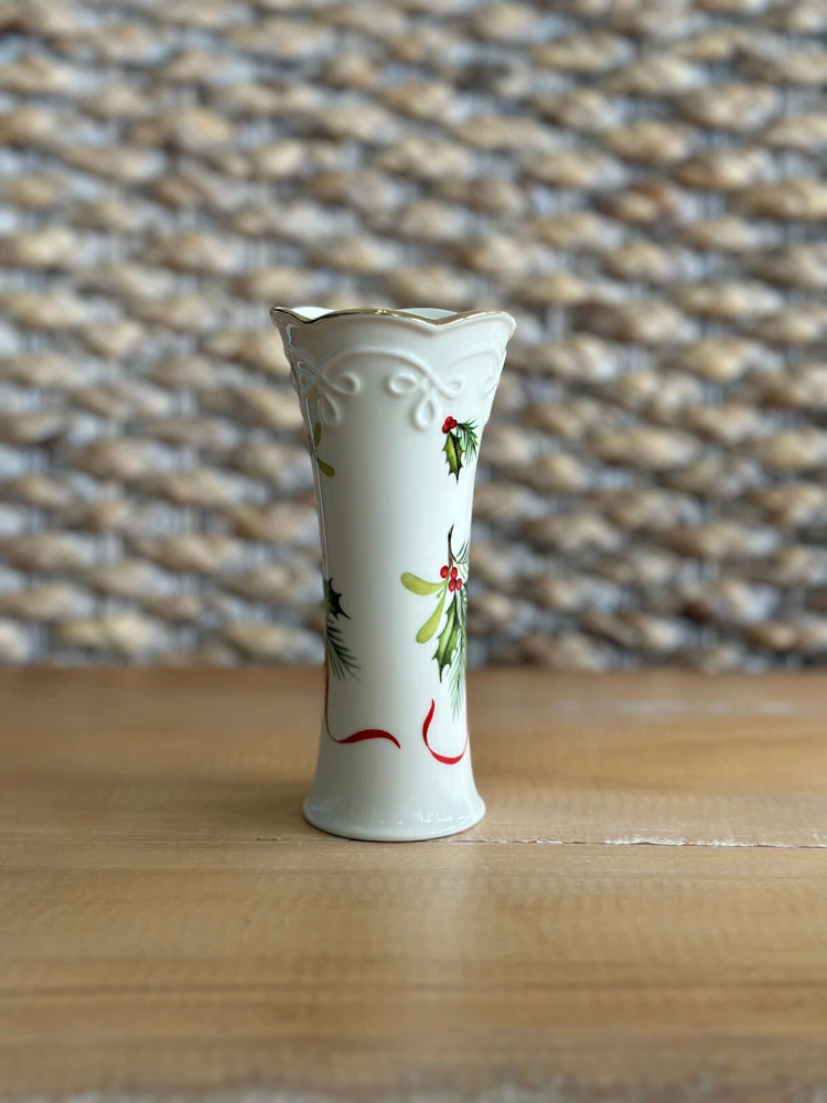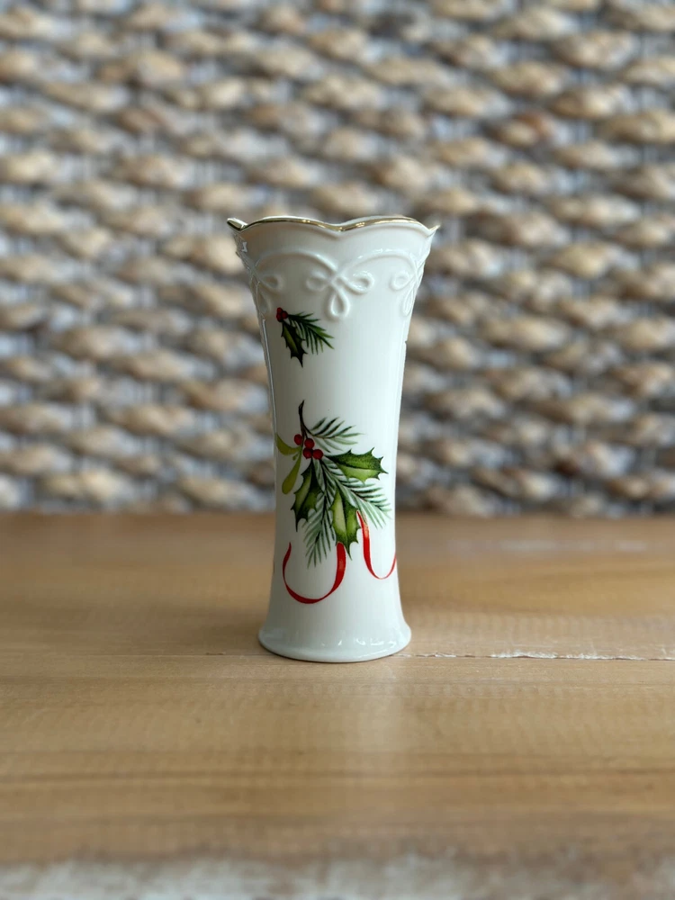 This Lenox Skinny Holiday Bud Vase features a beautiful Holly Design, making it the perfect addition to any collection of decorative vases. With a height of 5 inches and a width of 2.5 inches, this vase is perfect for displaying your favorite flowers or as a standalone decorative piece. The brand of this vase is Lenox, known for their high-quality collectibles. It has been gently used and is in great condition. Ideal for collectors or as a gift for someone special.
