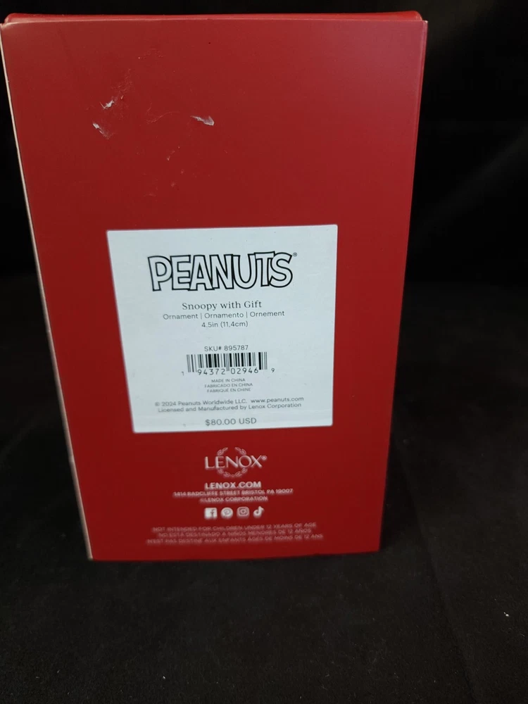 Character:SnoopyFranchise:PeanutsTheme:ChristmasNumber of Items:1Vintage:NoPersonalize:NoType:OrnamentOccasion:ChristmasCollection:OrnamentsSet Includes:OrnamentSize:SmallFeatures:Hanging, DecorativeColor:MulticolorBrand:LenoxCountry/Region of Manufacture:ChinaHandmade:NoAntique:NoOriginal/Licensed Reproduction:OriginalMaterial:Ceramic & Porcelain