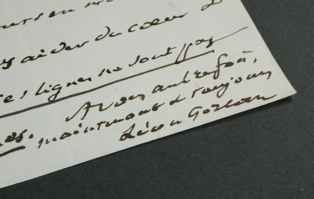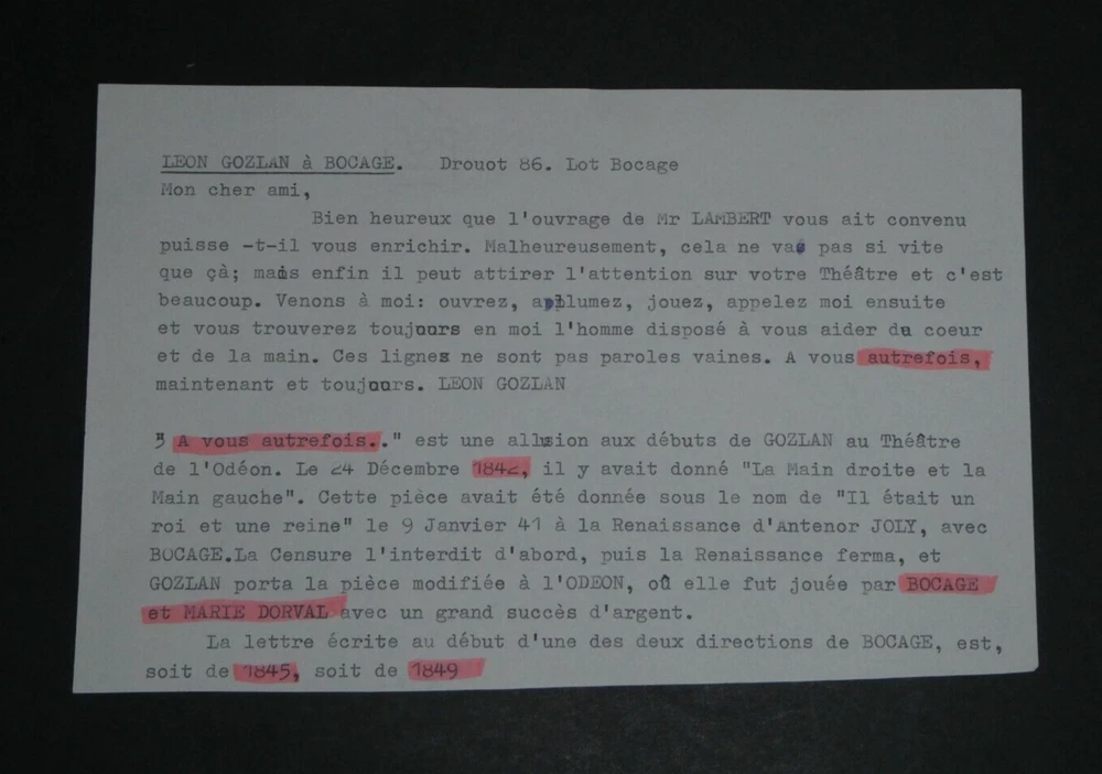 Free eBay listing template designed by dewiso.com Leon Gozlan, French Writer- Signed Autograph Letter to Bocage The description of this item has been automatically translated. If you have any questions, please feel free to contact us. Léon BOZLAN. Autograph letter signed in Bocage French writer Signed autograph letter written by Léon BOZLAN in Bocage. A transcription of the letter made by a former collector is attached. . "My dear friend, Very happy that Mr LAMBERT's work suited you, may it enrich you. Unfortunately, it doesn't happen that quickly; but finally it can attract attention to your theater and that's a lot. Let's come to me: open, light, play, then call me and you will always find in me the man willing to help you with his heart and his hand. These lines are not empty words. Yours once now and always. Leon GOZLAN." “To you once” is an allusion to GOZLAN’s debut at the Théâtre de l’Odéon. On December 24, he gave "the right hand and the left hand". this piece was given under the name "He was a king and a queen" on January 9, 41 at the Renaissance by Antênor JOLY, with BOCAGE. The Censorship banned it first, then the Renaissance closed, and GOZLAN took the modified piece to the ODEON? where it was played by BOCAGE and MARIE DORVAL with great silver success. The letter written at the beginning of one of the two directions of BOCAGE is either from 1845 or 1849. Dimensions: 21 x 13.3cm State : See photos for details. Number of pages: 1 Léon GOZLAN Léon Gozlan, born in Marseille on September 11, 1803 and died in Paris on September 14, 1866, is a French writer. Wikipedia Contact us Autograph letters, old papers, old books, photographs, engravings, stamps... We appraise and/or buy your letters, collections of letters and old books throughout France. Payment Payments by eBay, PayPal, transfer or check are accepted. Sending Careful delivery in rigid, waterproof packaging within three days. Allow for the usual postal delays in addition. Back Satisfaction guaranteed or your money back. If you are not completely satisfied, return at the seller's expense for Europe. At the buyer's expense for the rest of the world. Signed autograph letter written by Léon BOZLAN in Bocage. A transcription of the letter made by a former collector is attached.."My dear friend, Very happy that Mr LAMBERT's work suited you, may it enrich you. Unfortunately, it doesn't happen that quickly; but finally it can attract attention to your theater and that's a lot. Let's come to me: open, light, play, then call me and you will always find in me the man willing to help you with his heart and his hand. These lines are not empty words. Yours once now and always. Leon GOZLAN." “To you once” is an allusion to GOZLAN’s debut at the Théâtre de l’Odéon. On December 24, he gave "the right hand and the left hand". this piece was given under the name "He was a king and a queen" on January 9, 41 at the Renaissance by Antênor JOLY, with BOCA