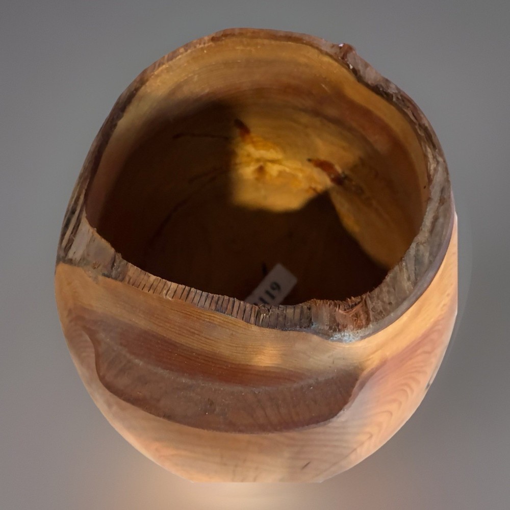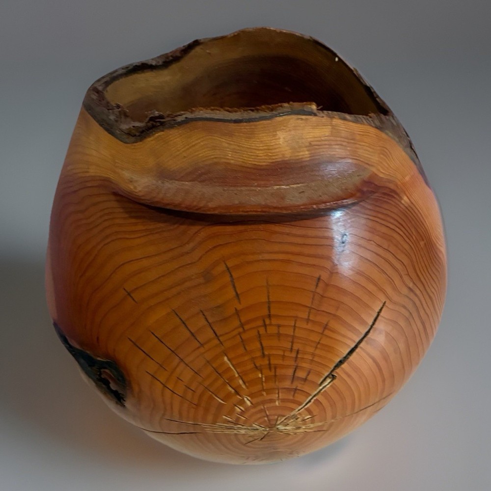 Large hand-turned solid cedar wood vessel by Len (Lenard) Mulqueen, signed and dated 3-97 on the base. Measures approximately 11 ½ ” high × 11 ½ ” wide. Sculptural hollow form with natural live-edge rim, visible growth rings, knots, and organic crack lines typical of studio woodturning. One-of-a-kind studio art piece. Len Mulqueen was a Long Island–based studio woodturner active in the late 20th century. His work includes hand-turned cedar vessels and hollow forms, typically signed and dated, many sold through galleries and craft shows in the region. 🏠 Helping special treasures find their way home… reasonable offers always welcome! ✨ I take pride in careful packaging to ensure your item arrives safely. Please buy with confidence – I maintain 100% positive feedback.