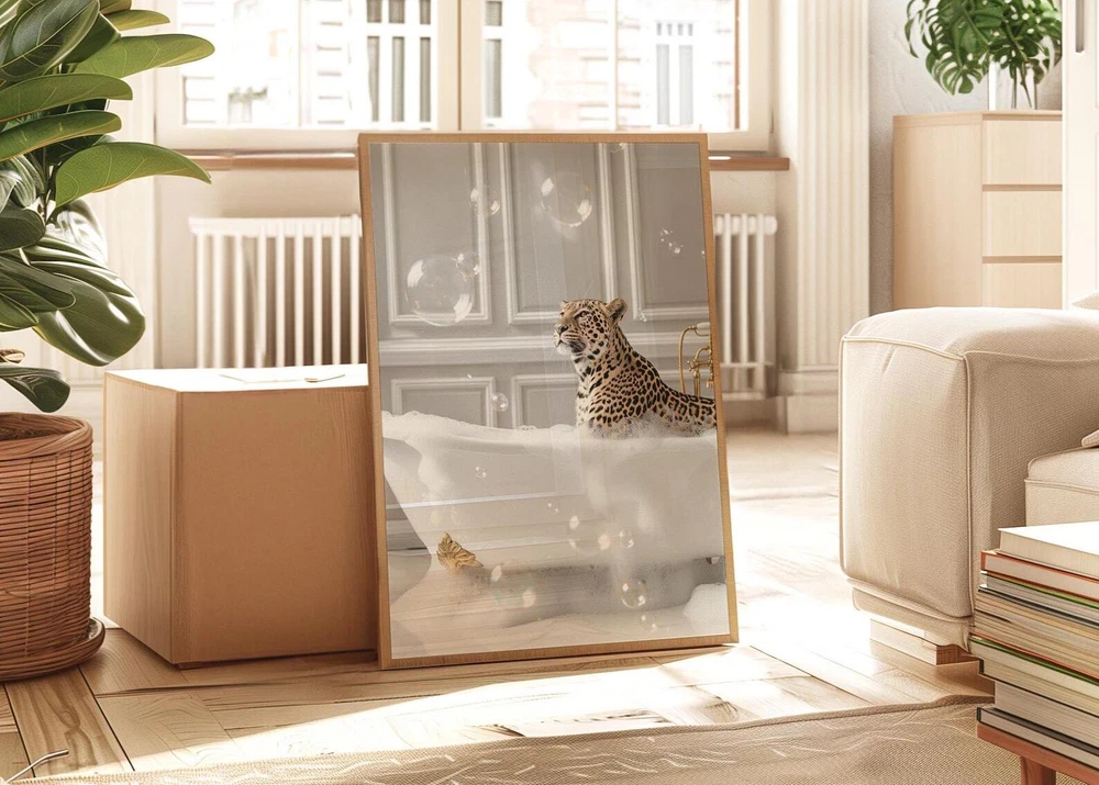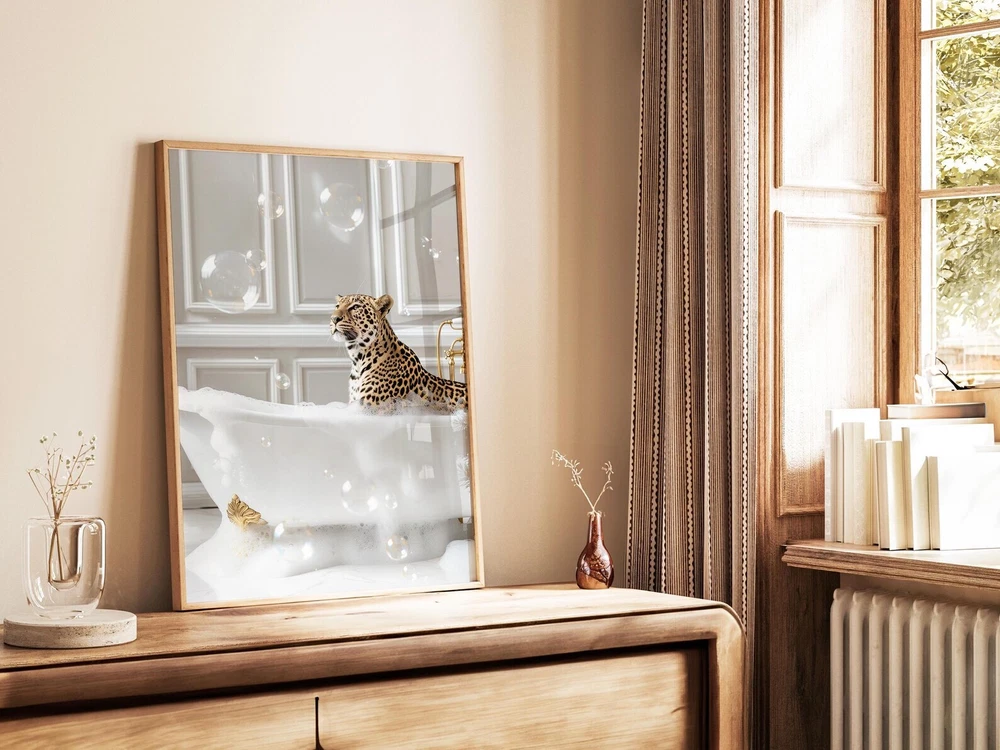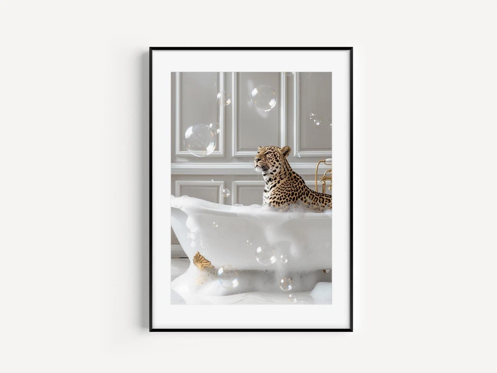 Leopard In Bathtub Art Print Leopard Print Decor Cheetah Poster Bathroom Wall Decor Bathroom Wall Art Leopard Wall Art Maximalist Wall Art Material: Premium luster photo paper Print type: Inkjet printing One side printed + The finish provides the highest possible resolution and color saturation + Lasts up to 200 years in color and 400 years in black-and-white + Printed on high-quality resin-coated photo base paper medium + Posters can be hung with double-sided tape, tacks, or framed + Hand washing with a gentle cry cloth is recommended for extended durability I will hand select the best choice of paper for your chosen design to ensure top quality results for a beautiful, bright and luxurious print. All prints are sealed in cellophane slips for protection during transportation, and are shipped in a protective cardboard envelope.