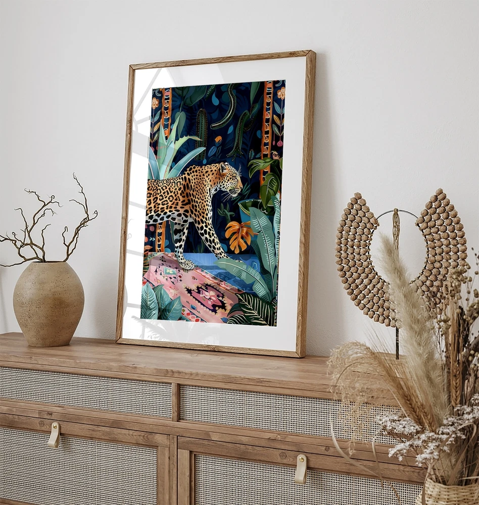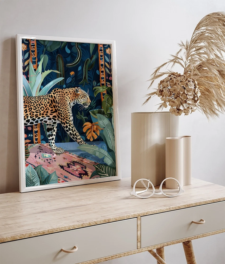 Leopard In Forest Painting Boho Maximalist Art Blue Home Decor Big Cat Wall Art Maximalist Boho Home Decor Material: Premium luster photo paper Print type: Inkjet printing One side printed + The finish provides the highest possible resolution and color saturation + Lasts up to 200 years in color and 400 years in black-and-white + Printed on high-quality resin-coated photo base paper medium + Posters can be hung with double-sided tape, tacks, or framed + Hand washing with a gentle cry cloth is recommended for extended durability I will hand select the best choice of paper for your chosen design to ensure top quality results for a beautiful, bright and luxurious print. All prints are sealed in cellophane slips for protection during transportation, and are shipped in a protective cardboard envelope.