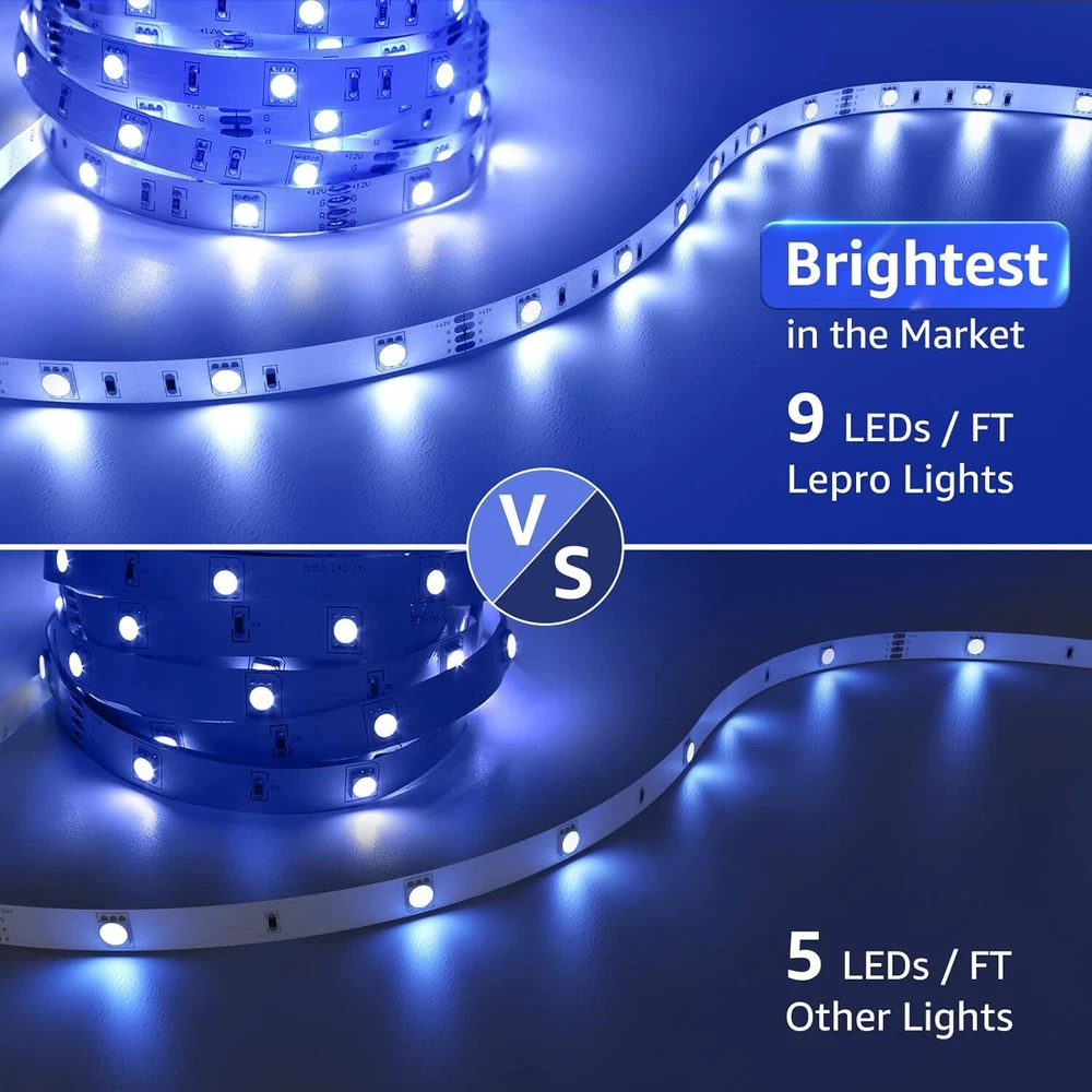 Lepro 65.6ft LED Strip Lights, Ultra-Long RGB 5050 Strips 65.6ft, White Product Details Product Dimensions : 6.1 x 3.15 x 6.18 inches; 14.82 ounces Item model number : 410086-RGB-US Batteries : 3 A batteries required. Manufacturer : Lepro Color: White Brand: Lepro Indoor/Outdoor Usage: Indoor Special Feature: color_changing, waterproof, dimmable Light Source Type: LED Power Source: Corded Electric Light Color: Multicolor Theme: Christmas,Halloween Occasion: Christmas, Halloween, Party Style: Modern Ultra-high Brightness: Lepro strips have 9 LEDs per FT while other strips only have 5 LEDs. With a significantly higher brightness than others, Lepro strips can instantly light up your room. Color Changing Strip Lights: The LED Strip Lights provide the primary Red, Green, Blue (RGB) colors and white, and 16 multicolored options. With 6 DIY colors, 8 modes, and adjustable brightness, you can DIY your favorite color to decorate your room. Easy Installation & Sticky Tape: We use professional and strong 3M adhesive. We now include extra mounting brackets/fixing clips. Use together and never worry about the strip's falling down. All in One Kit: This LED Light strip kit includes 2pcs 300 LEDs 32.8ft/10m RGB strip, 1pc 44 key IR remote control, and 1pc 3A 12V power adapter (US Plug). You do not need to spend extra time and money buying other accessories. Widely Used Strip Lights: The Lepro RGB LED strip lights can be used for your living room, bedroom, dining room, kitchen, desk, cabinet, and even on your Christmas tree. Especially suitable for holiday parties like Christmas, Halloween, and more.