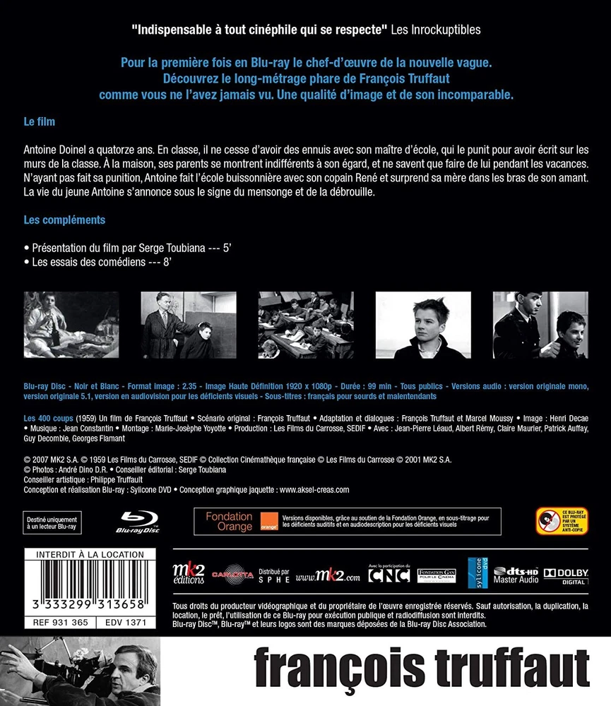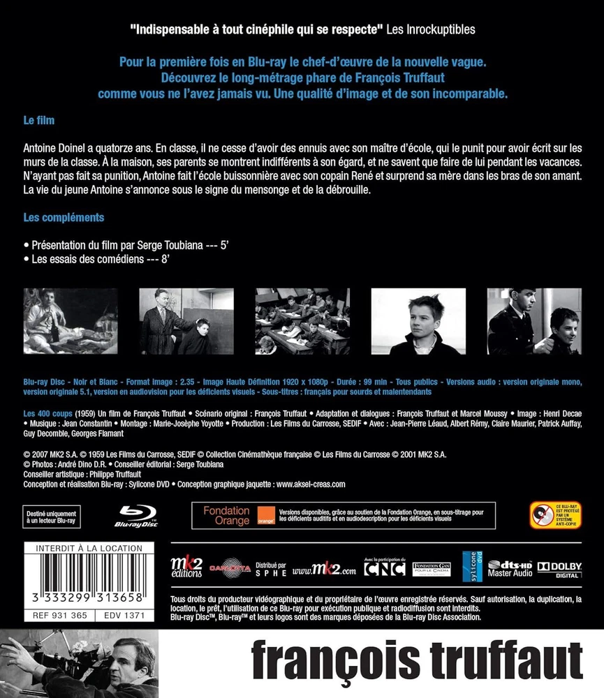 Further Details Title: Les 400 coups Condition: New Format: Blu-ray EAN: 3333299313658 Release Date: 09/08/2020 Type: Filme Director: Truffaut, François Rating: Unrated No Of Discs: 1 Run Time: 1 Stunde und 33 Minuten Studio: Carlotta Subtitle Language: English Region Code: Blu-ray: B (Europe, AU, NZ, Africa...) Actor: Jean-Pierre Leaud, Claire Maurier, François Truffaut, Jean-Pierre Léaud Language: French Release Year: 2020 Missing Information? Please contact us if any details are missing and where possible we will add the information to our listing.