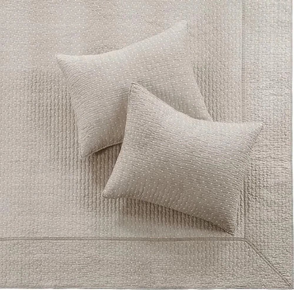 The LevTex Home Cross Stitch Taupe Bedspread Set is a modern and stylish addition to any bedroom, featuring a solid beige color with a quilted design. Made of cotton with 100% blended fiber batting, this Queen-sized set includes a bedspread and pillow shams, perfect for teens and adults alike. Easy to care for with machine wash instructions, this rectangular bedspread set adds a touch of elegance to your room with its standard certification and unique stitch character.