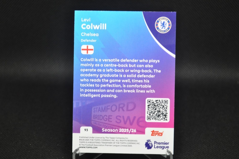 The Levi Colwill 2025-26 Topps Premier League Soccer #93 Base trading card is an original card made of card stock with a thickness of 35 Pt. It features the athlete Levi Colwill from Chelsea in the 2025-26 season of the Premier League. This sports trading card, part of the Topps English Premier League Soccer set, is not autographed and is an part of the base set. The card is manufactured by Topps in the United States and is a part of the UEFA European Football Championship event. It is a standard-sized card in English language.