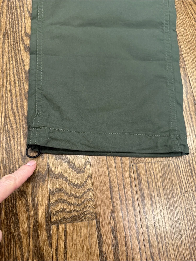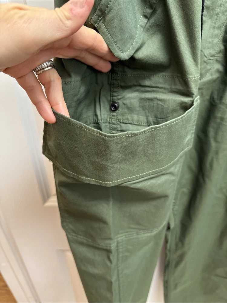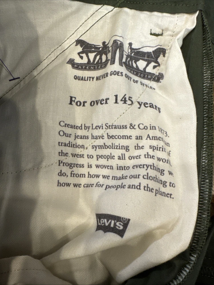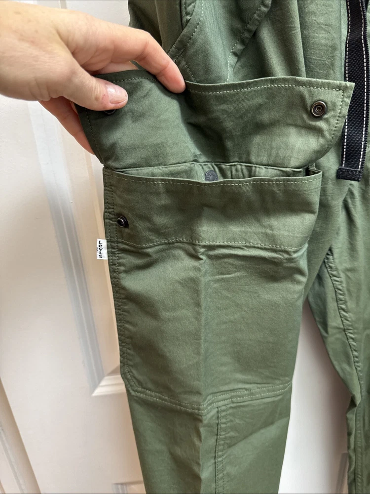 Elevate your wardrobe with these stylish Levi Strauss & Co premium cargo utility pants. Featuring a high rise waist and stretch for ultimate comfort, these pants come in a trendy green color with a straight leg style with optional cinch at ankle. The pants are made of a cotton and stretch blend material and have a zip and snap closure with accents of the brand's logo. The pants have a regular fit and are designed for women with a waist size of 34 inches and inseam of 27 inches. The pants are perfect for those who want to add a touch of style to their wardrobe.