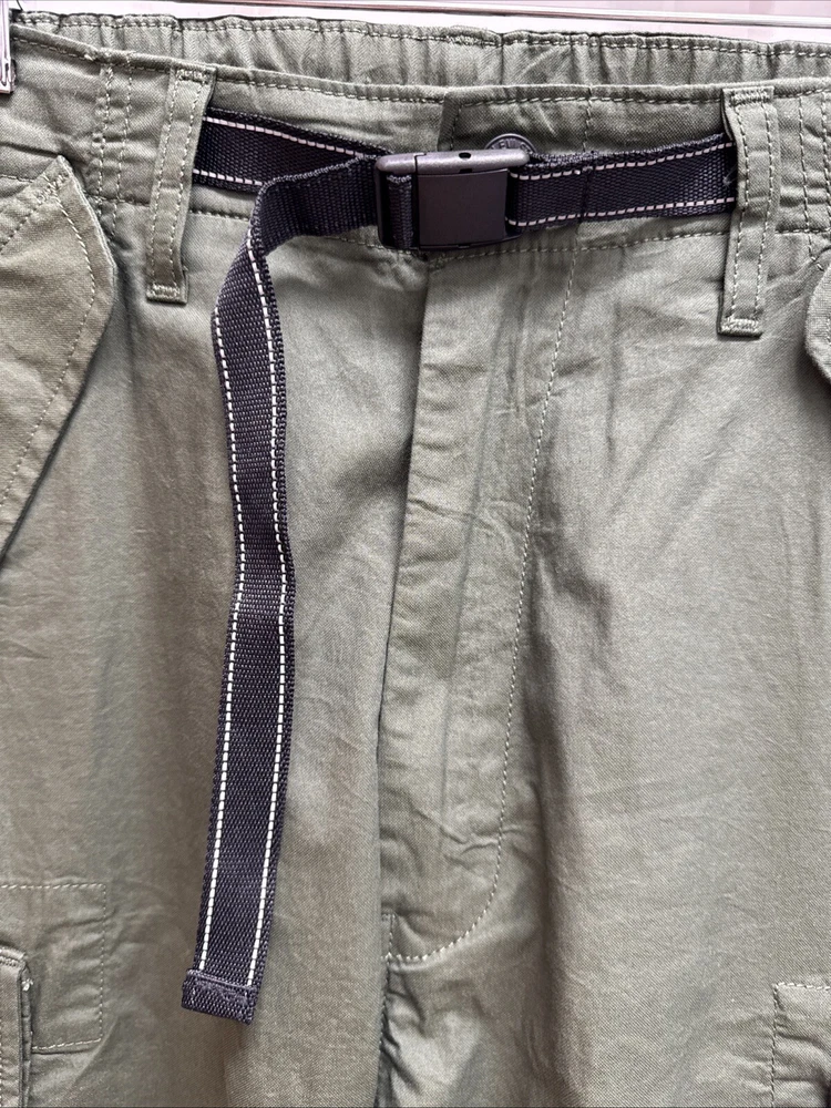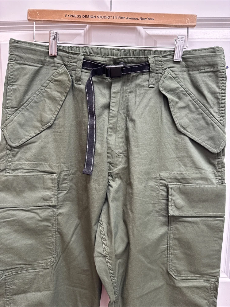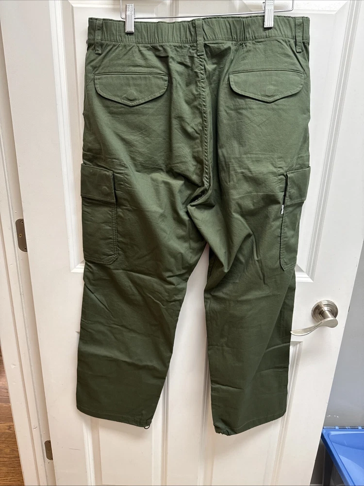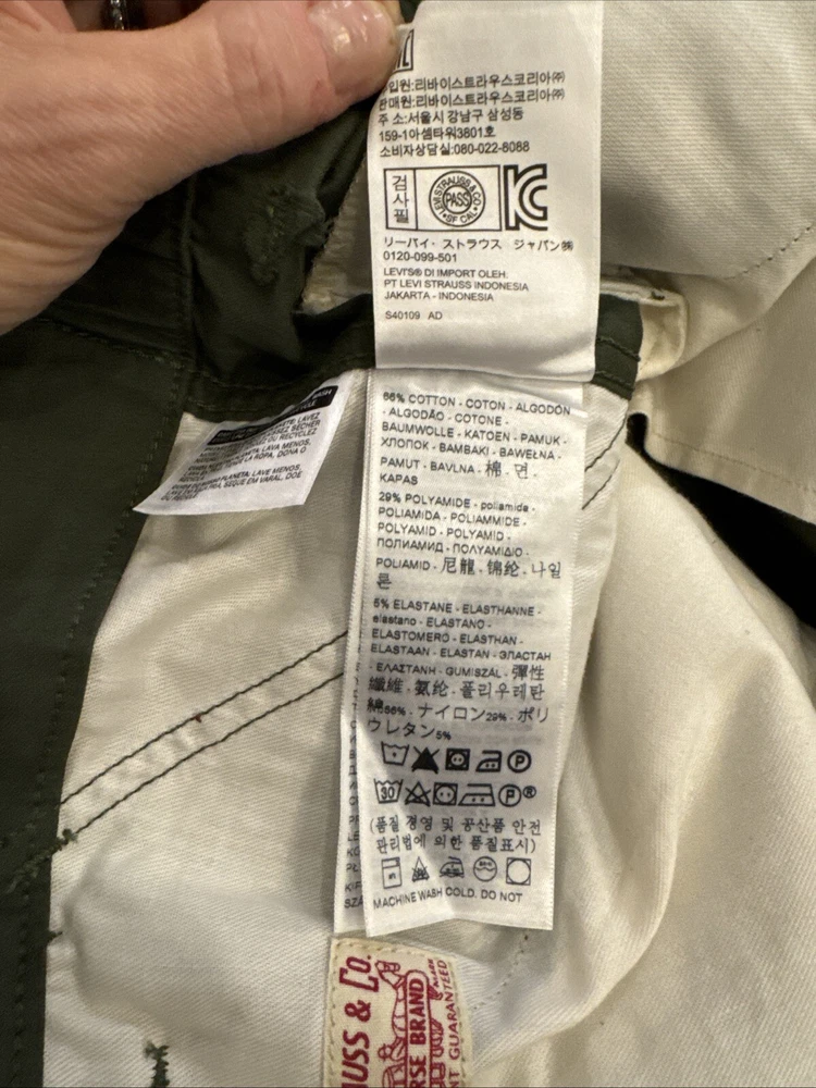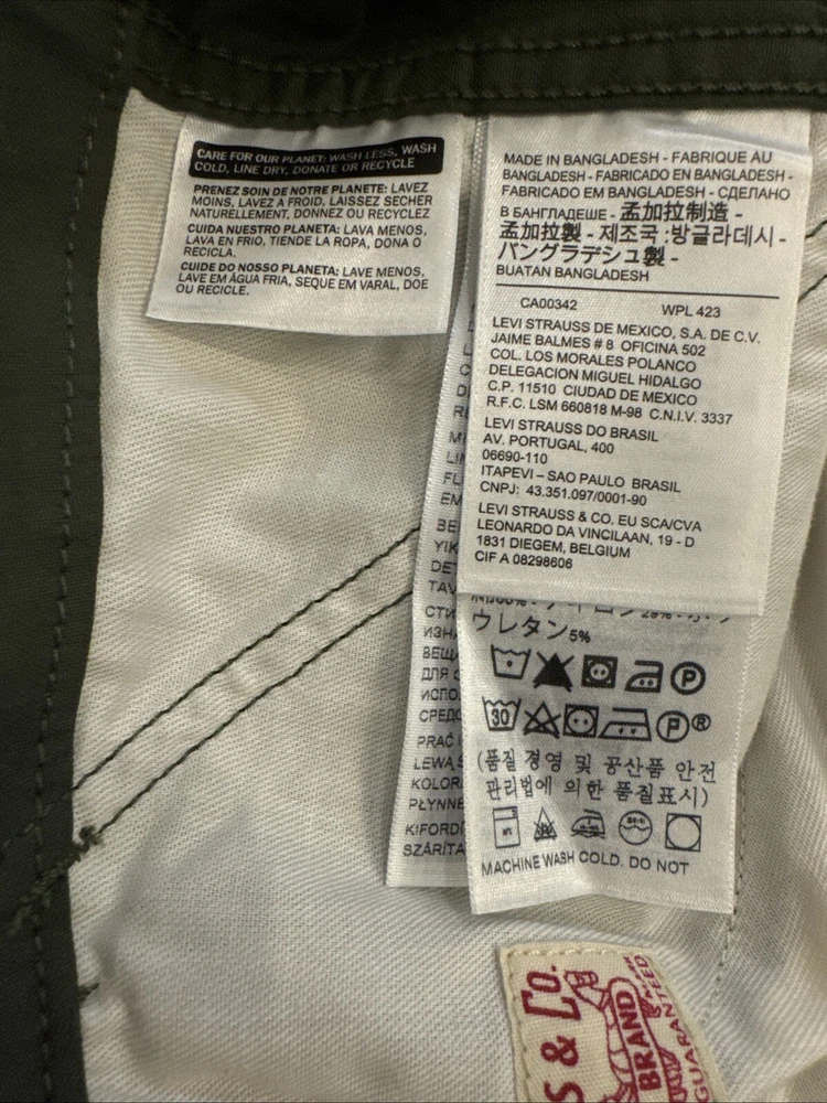 Elevate your wardrobe with these stylish Levi Strauss & Co premium cargo utility pants. Featuring a high rise waist and stretch for ultimate comfort, these pants come in a trendy green color with a straight leg style with optional cinch at ankle. The pants are made of a cotton and stretch blend material and have a zip and snap closure with accents of the brand's logo. The pants have a regular fit and are designed for women with a waist size of 34 inches and inseam of 27 inches. The pants are perfect for those who want to add a touch of style to their wardrobe.