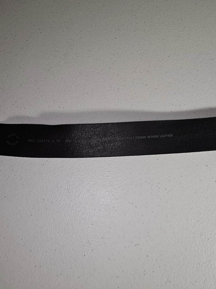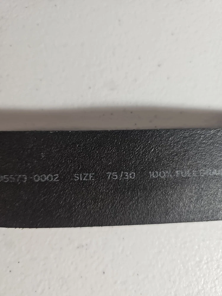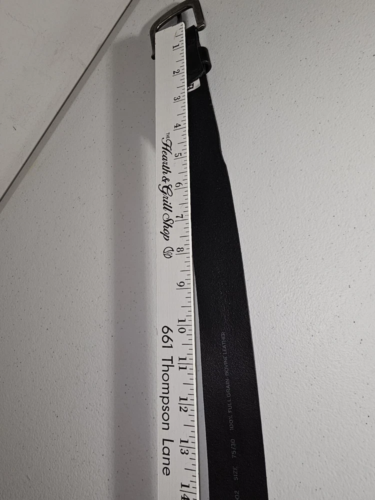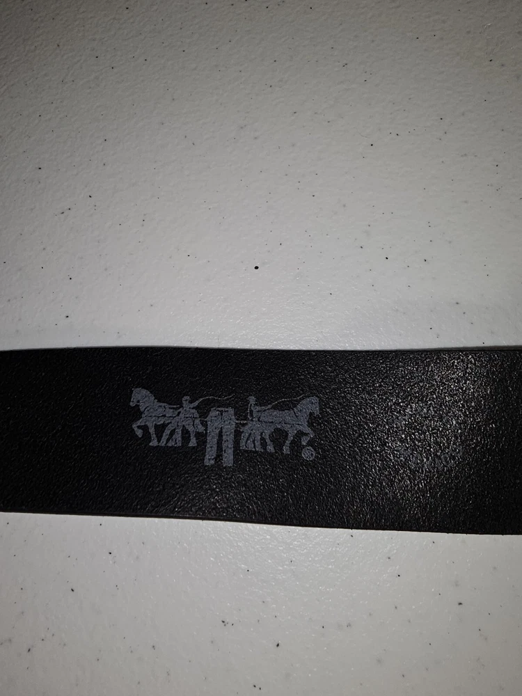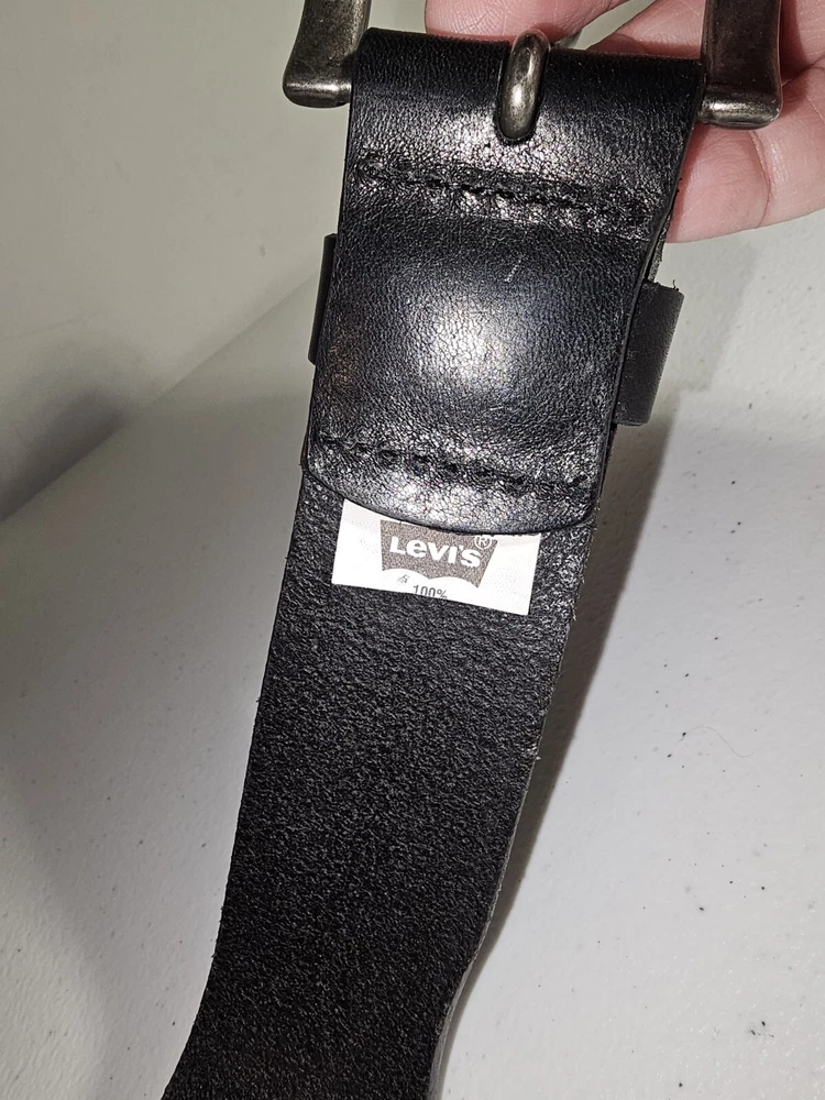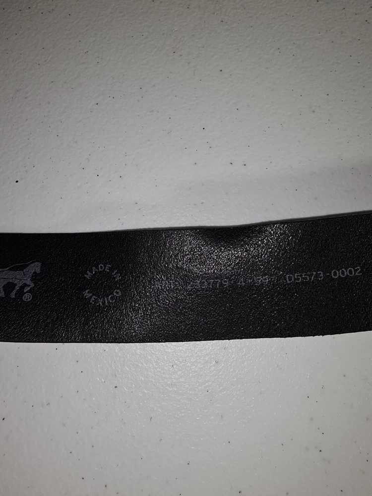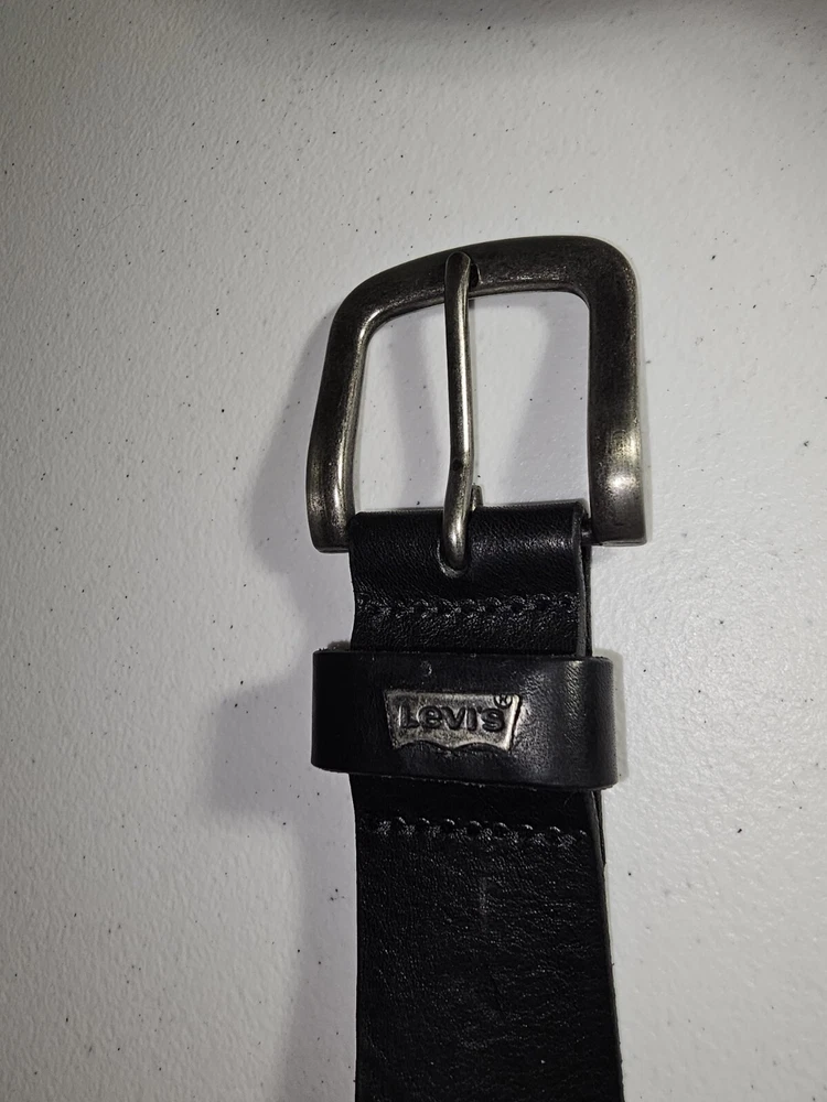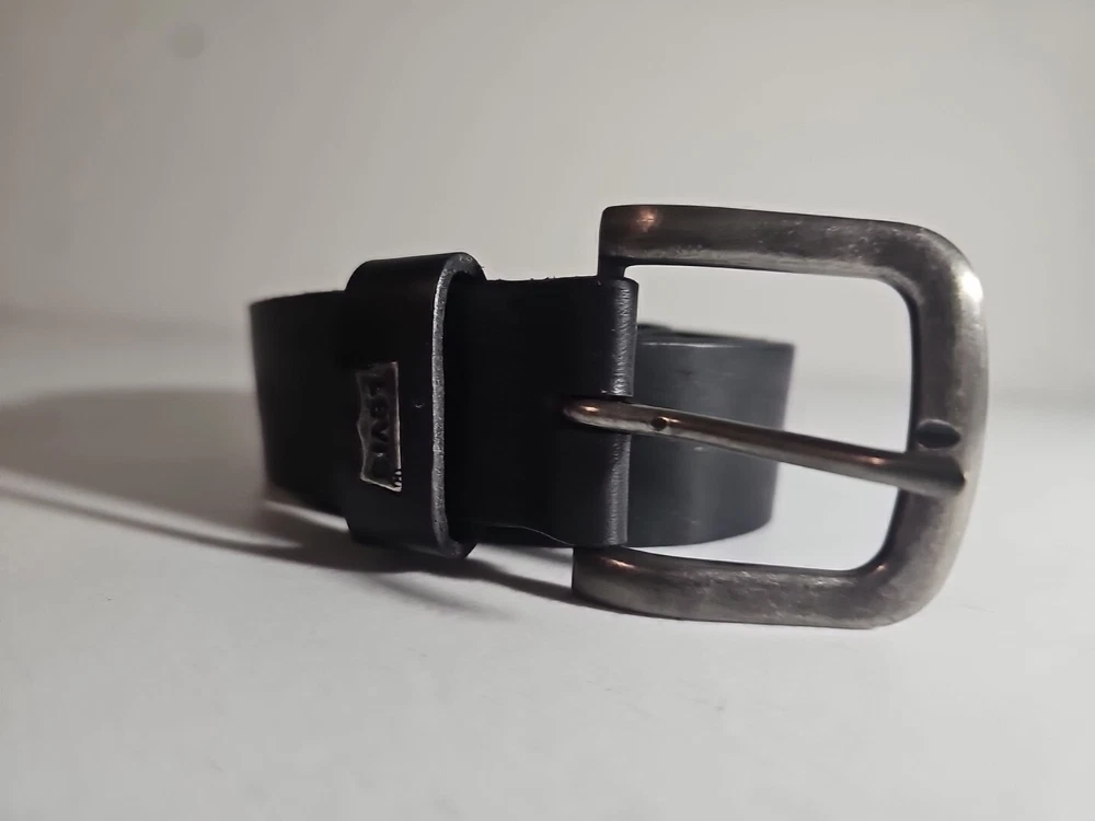 The product is a Levi's belt made from 100% full grain bovine leather in a size 75/30, with a burnished metal buckle in black color. This classic dress belt is designed for unisex adults and features an adjustable fit. The belt is of regular size type and is branded by Levi's, known for its quality and style. Crafted in Mexico, this genuine leather belt adds a touch of sophistication to any outfit with its timeless design and durable material. 5 holes, Great condition