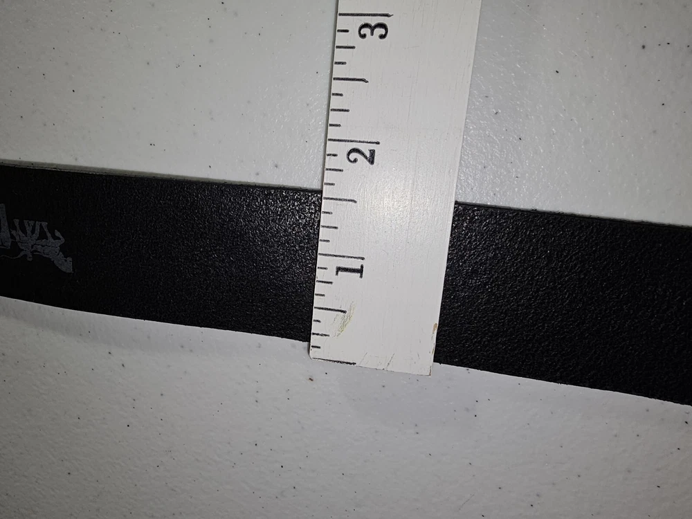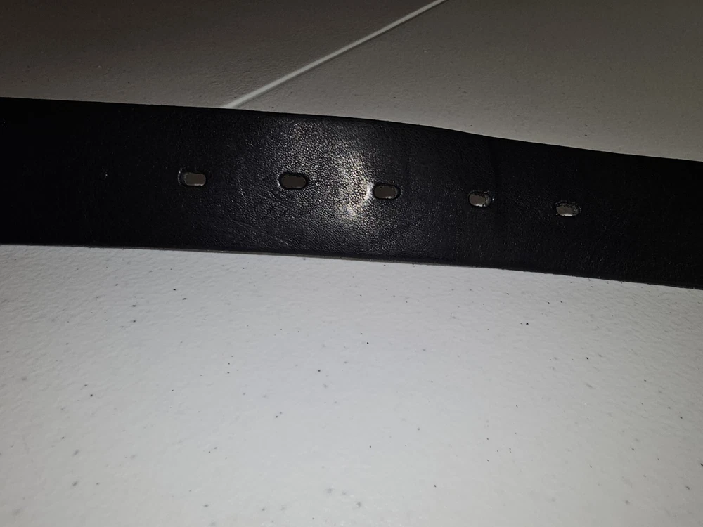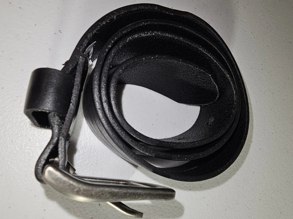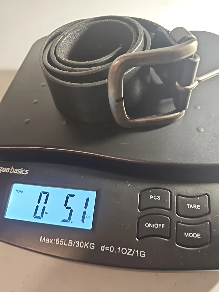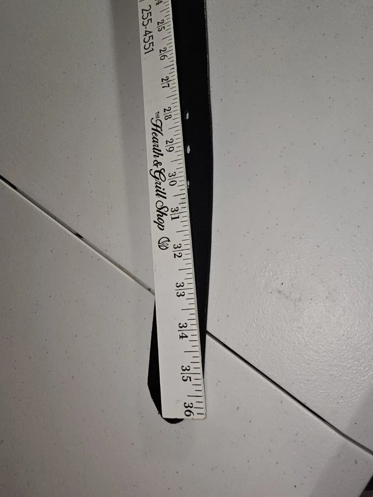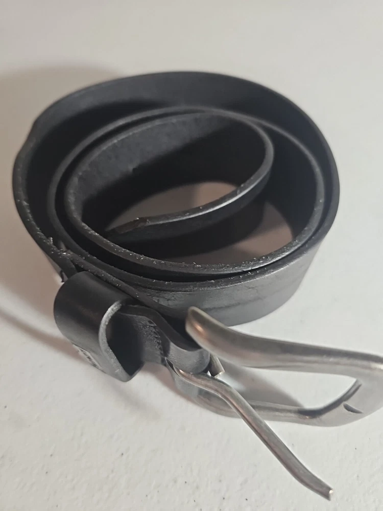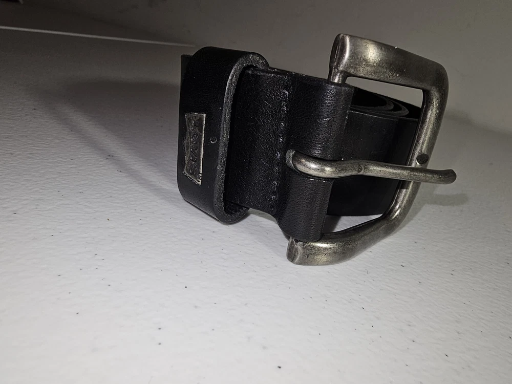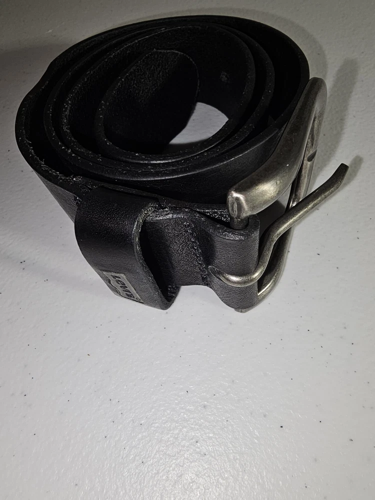 The product is a Levi's belt made from 100% full grain bovine leather in a size 75/30, with a burnished metal buckle in black color. This classic dress belt is designed for unisex adults and features an adjustable fit. The belt is of regular size type and is branded by Levi's, known for its quality and style. Crafted in Mexico, this genuine leather belt adds a touch of sophistication to any outfit with its timeless design and durable material. 5 holes, Great condition