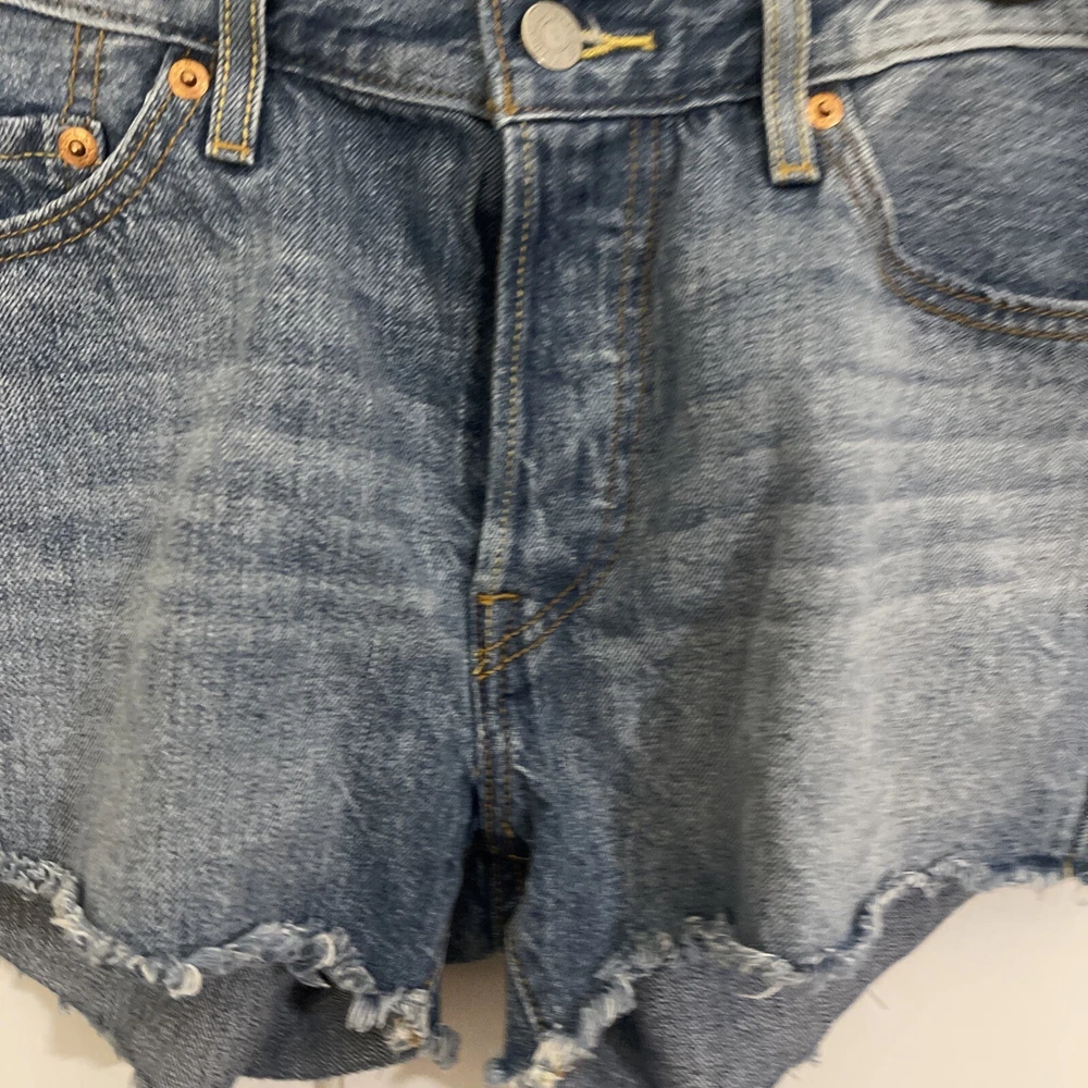 Womens Levi's 501 Jean Shorts. Size 28 Blue Dots. Button Fly/Raw Hem.. Condition is Pre-owned. Shipped with USPS Ground Advantage.