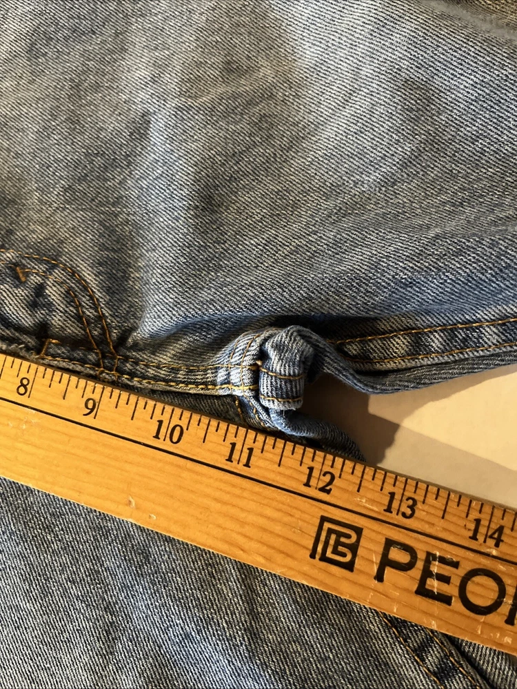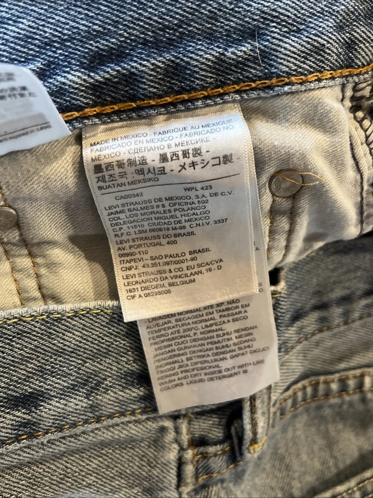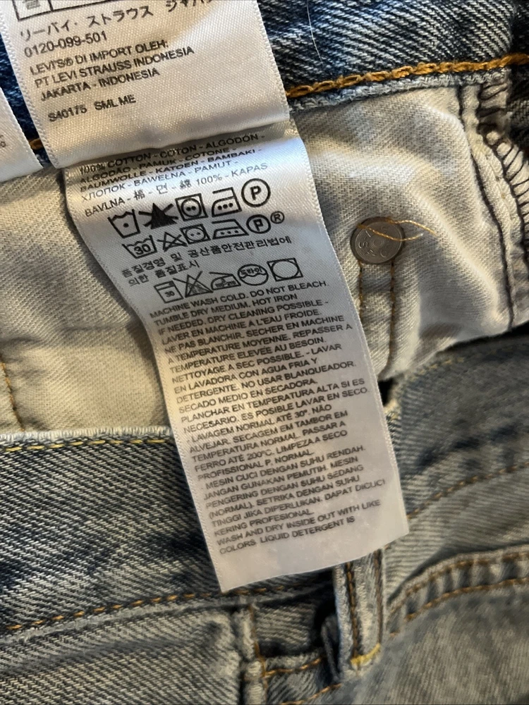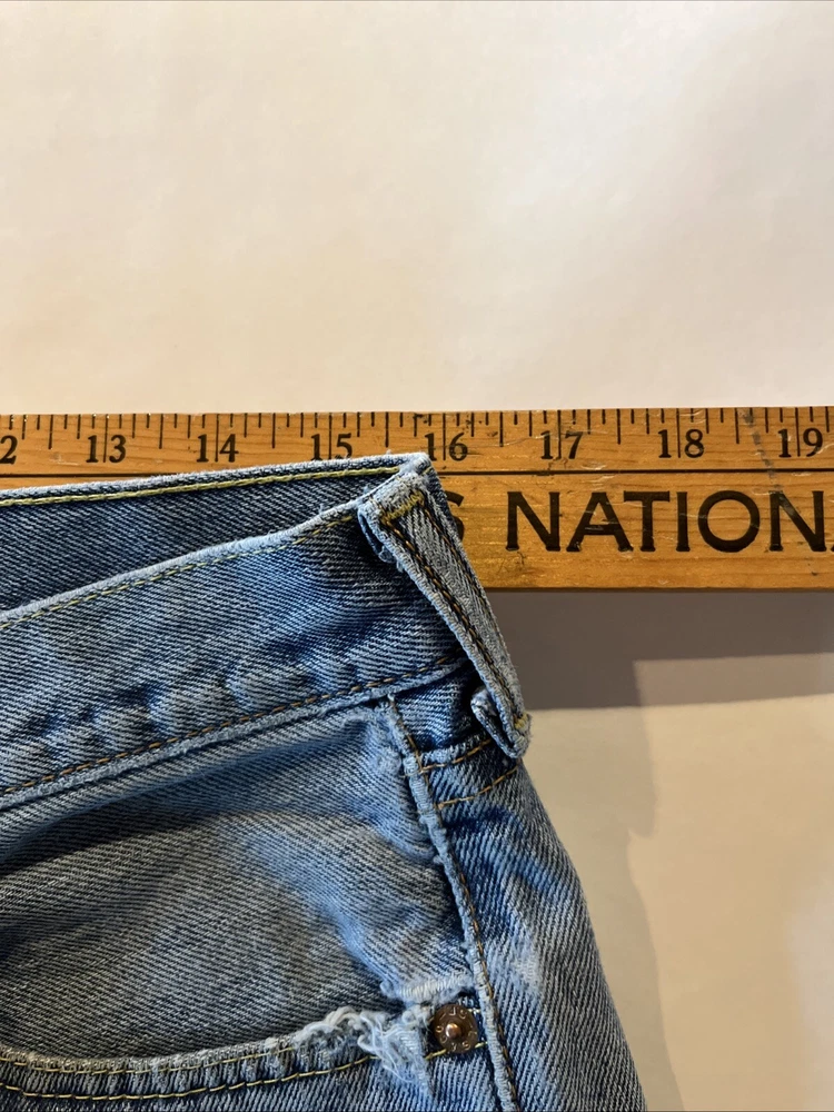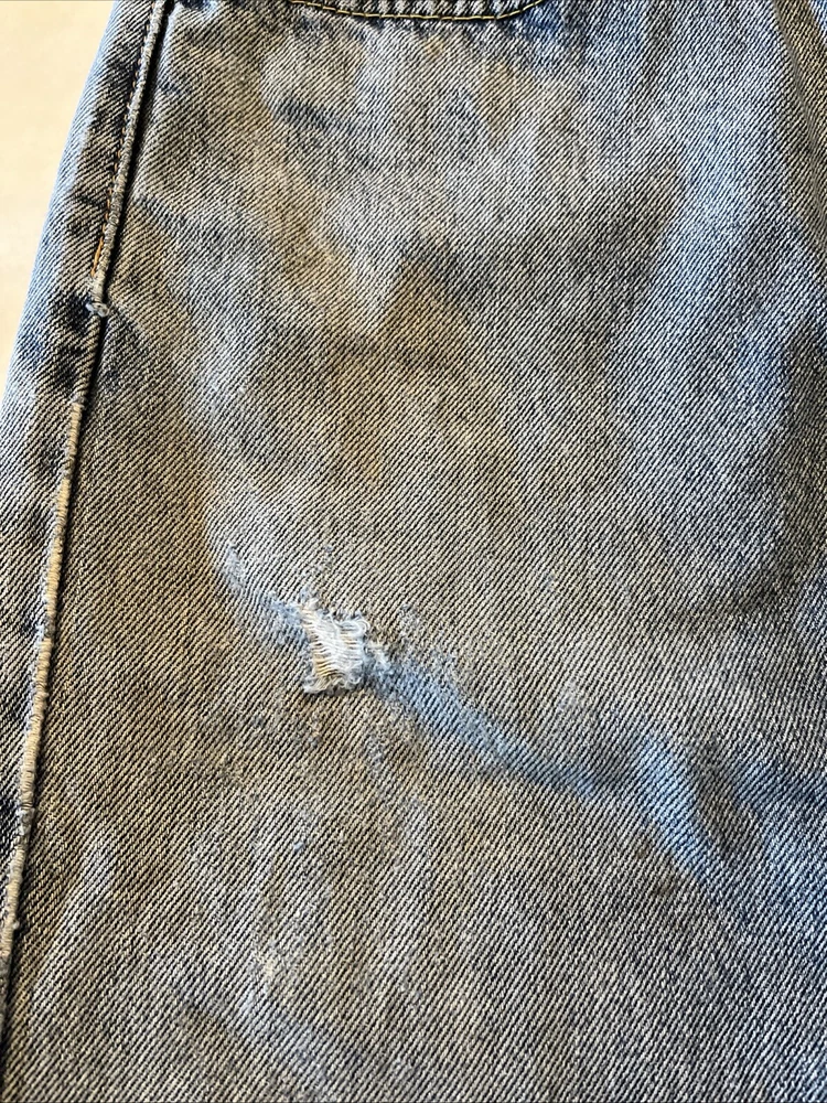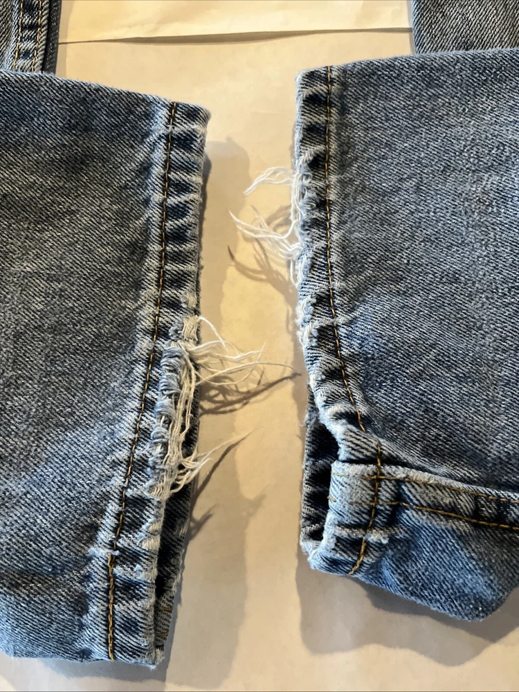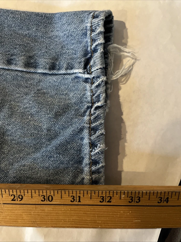32in waist 32in inseam Has staining/hole on legs. Fraying on leg cuffs