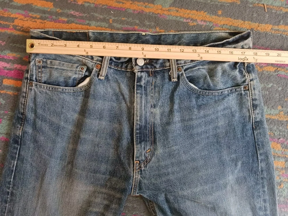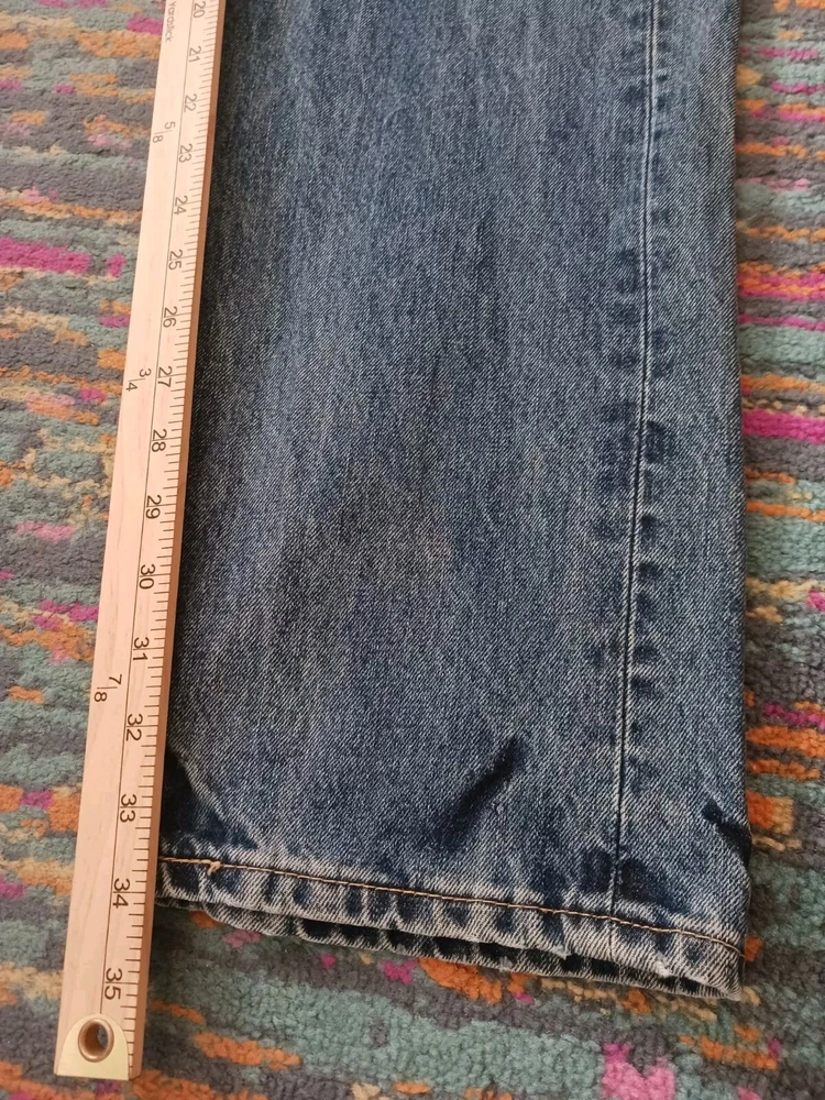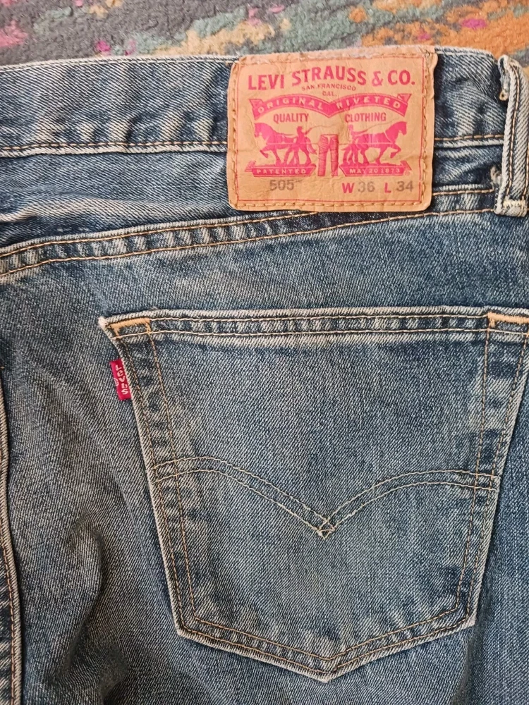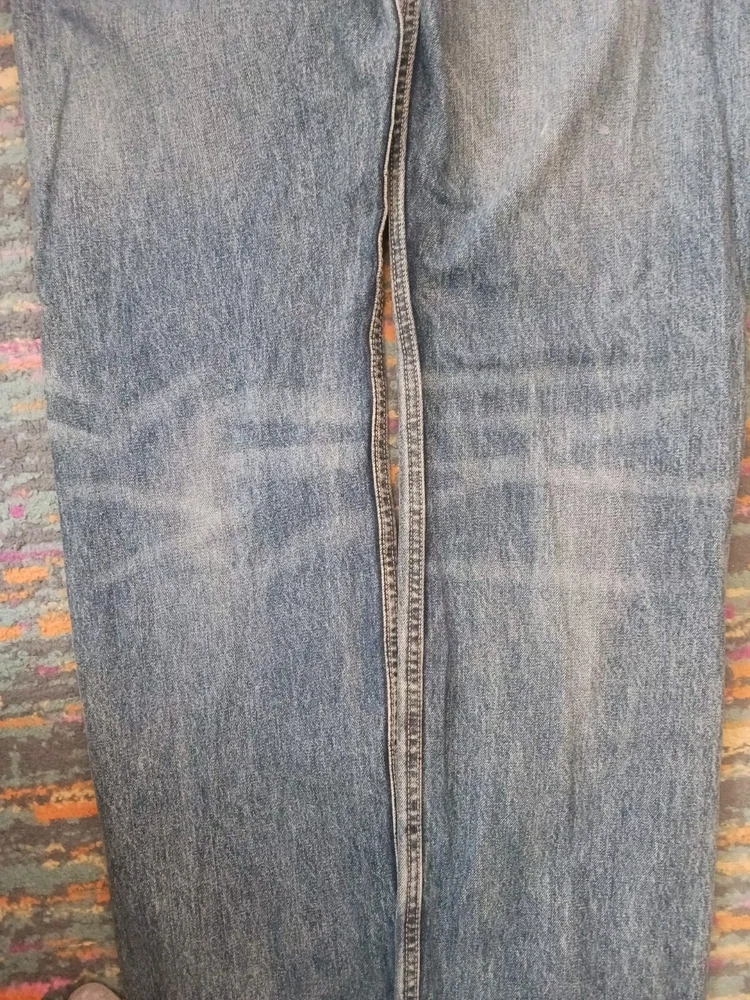 Pre-owned Levi's 505 mens regular straight leg jeans size 36x34 blue denim , has Whiskering, Feathering on back knees & on front. Great condition! Thanks for looking.