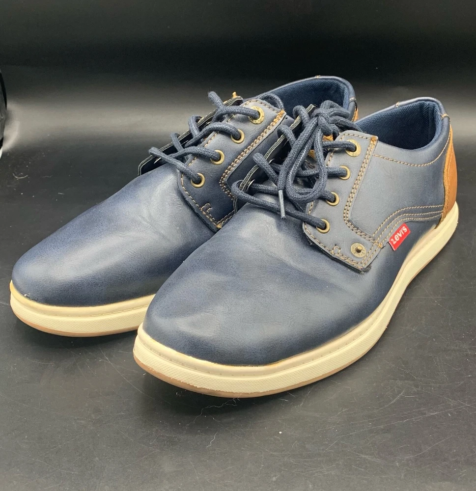 Elevate your style with these Levi's Arnold BRNSH Men's Casual Shoes. Featuring a navy and tan color combination, these sneakers are perfect for travel, workwear, and casual occasions. The round toe shape and standard shoe width ensure comfort while the rubber outsole provides durability. The blended fabric, synthetic lining, and synthetic insole material make these shoes not only stylish but also comfortable. With accents of the Levi's logo and a solid pattern, these shoes are a classic addition to any wardrobe. Available in US Shoe Size 9.5, UK Shoe Size 8.5, and EU Shoe Size 43.