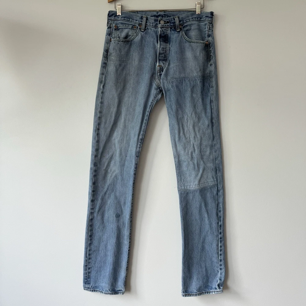 Elevate your style with these Levi's 501 Button Fly Jeans in a light blue wash. The classic, straight-leg style is complemented by accents of a button and Levi's logo. The denim fabric is easy to care for, stretchy for comfort, and even has reflective features for added safety. With 5-pocket design and a waist size of 32 inches, these jeans are perfect for men looking for a regular fit. The vintage-inspired jeans have a solid pattern and are machine washable for easy care. With a country of origin in Egypt, these Levi's 501s are a part of the USA, 80s, and 90s-themed product line. Perfect for any season, these handmade jeans have a rise of mid, inseam of 36 inches, and feature a classic, straight-leg style. Full measurements: Waist flat: 16" Hips flat: 20.5" Front rise: 10.5" Thigh flat: 11" Inseam: 36" Leg opening flat: 7.5"