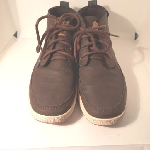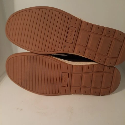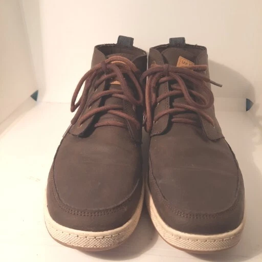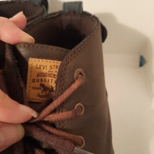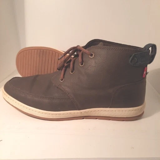 Elevate your shoe game with these stylish Levi's ankle boots. The brown leather upper and round toe shape give these shoes a classic look, while the lace-up closure ensures a secure and comfortable fit. The rubber outsole provides durability and traction, making these boots suitable for any casual occasion during the summer, fall, or spring seasons. Featuring the Levi's logo accents and cushioned insole, these boots offer both style and comfort. With a regular calf width and ankle shaft style, these boots are perfect for men who love the chukka style. Available in size US 9, these pre-owned boots are a great addition to any shoe collection. Shoes strings are slightly faded.