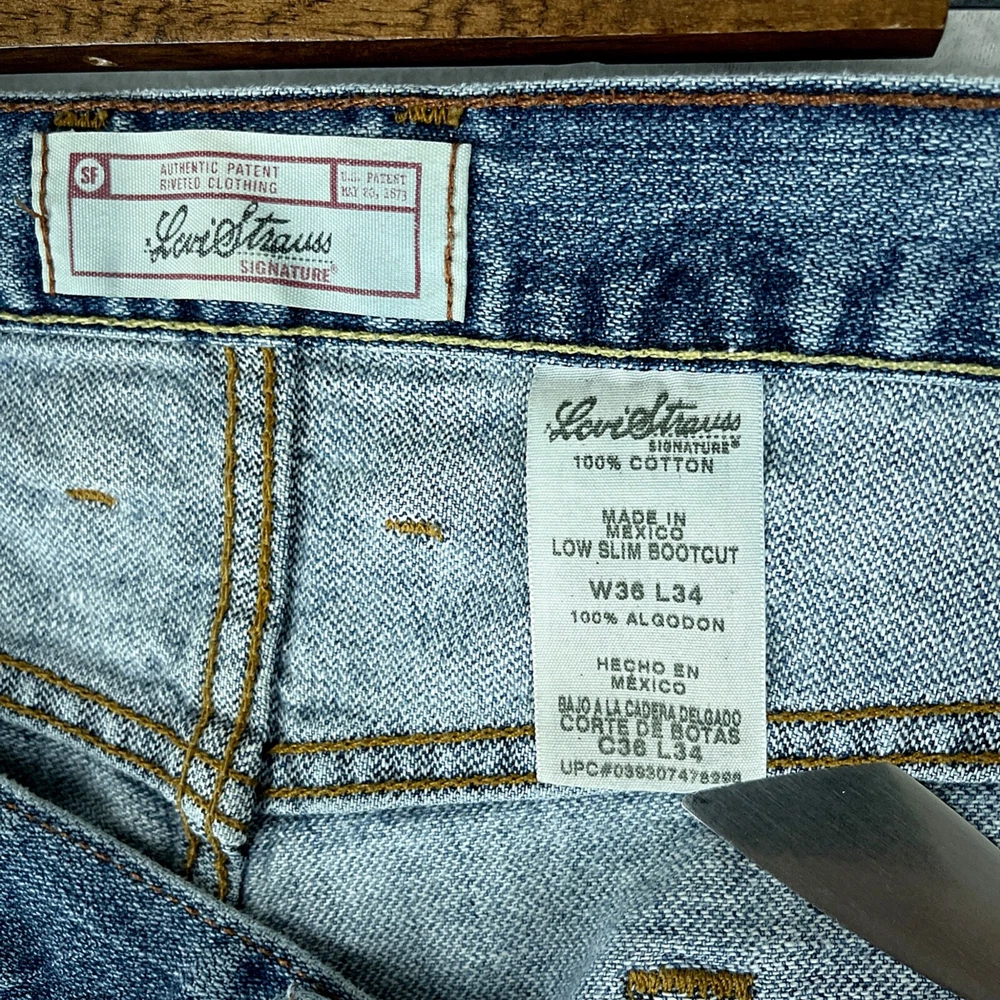 Levi's Strauss Mens Jeans Blue Tag Size 36 (36x27.5) Low Slim Bootcut Denim -------> PLEASE NOTE: TAKE A SPECIAL LOOK AT THE WHITE ARROWS ON THE PHOTO SECTION SHOWING THE FLAWS<------- -------> PLEASE NOTE: THE ORIGINAL INSEAM LENGTH HAS BEEN MODIFIED <------- Made in: Mexico TRUE SIZE * The measurements we made with a ruler of THE ACTUAL SIZE OF THE PANTS are on photos.* Genre: Male Condition: Pre-Owned Some things to consider: * All our items are inspected several times before we ship to you. If there is an issue, you will find it photographed and described in the condition overview . Please review this very closely to ensure that this item is exactly what you are looking for. * All items are cleaned and stored in a pet-free / smoke-free environment. * Please take a special look to all the measurements we took using a ruler and also the measurements that comes in the item tag for an accurate fit. This saves you the headache of returning an Item that does not fit. we offer 30 day free returns on unused/unworn items. Please compare our measurement photos to your favorite garments to ensure fit. Note, item measurements are approximate and in the photos. Feel free to ask any question about this item. "We ship as soon as possible after the payment has been made"