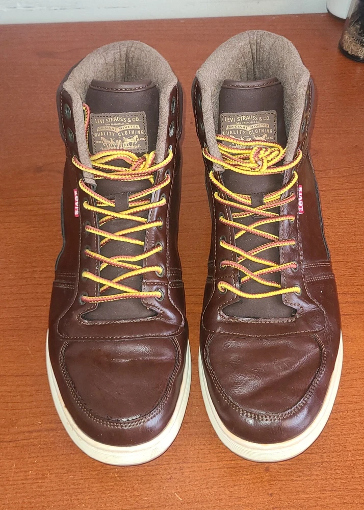 Elevate your style with these brown high top sneakers from Levi's Strauss. Designed with a solid pattern and faux leather fabric, these shoes feature a lace-up closure and logo accents for a touch of sophistication. Perfect for travel, sports, or casual occasions, these sneakers offer comfort and versatility for any season. With a UK shoe size of 11, US shoe size of 12, and EU shoe size of 46.5, these Levi's sneakers are a great addition to any men's shoe collection. The synthetic lining material and insole provide a comfortable fit, while the medium shoe width ensures a snug and secure fit. Whether you're dressing up or dressing down, these shoes are a must-have for any fashion-forward individual.