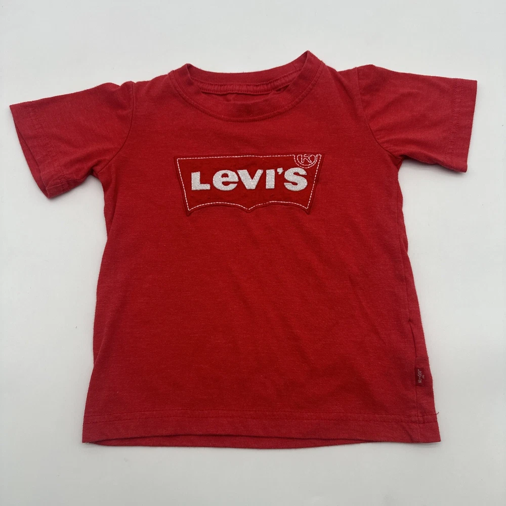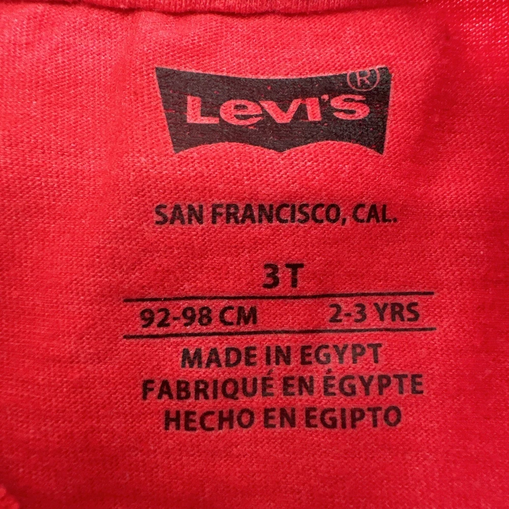 Dress up your little boy in this stylish Levi's T-shirt, featuring a red color with an embroidered logo. The shirt is made of a comfortable blend of polyester and cotton, ensuring a relaxed fit for your child. This short-sleeved crew neck tee is perfect for casual occasions, whether it's a day at the beach or just hanging out. The shirt is available in size 3T, suitable for boys aged 2-3 years. It has a pullover closure and is designed with solid patterns. This T-shirt is a great addition to your child's wardrobe, representing the Levi's brand and style. Check pictures for flaws and measurements