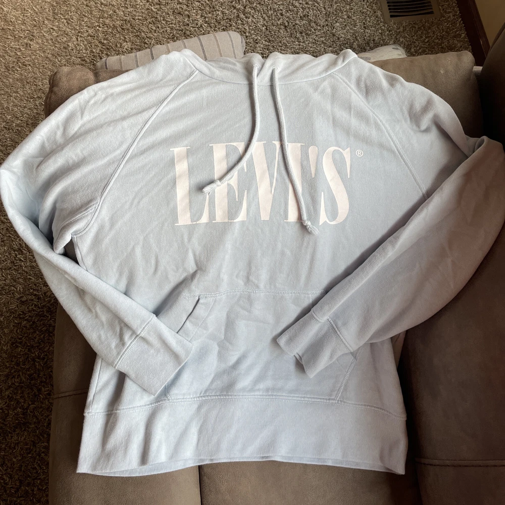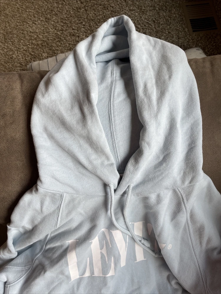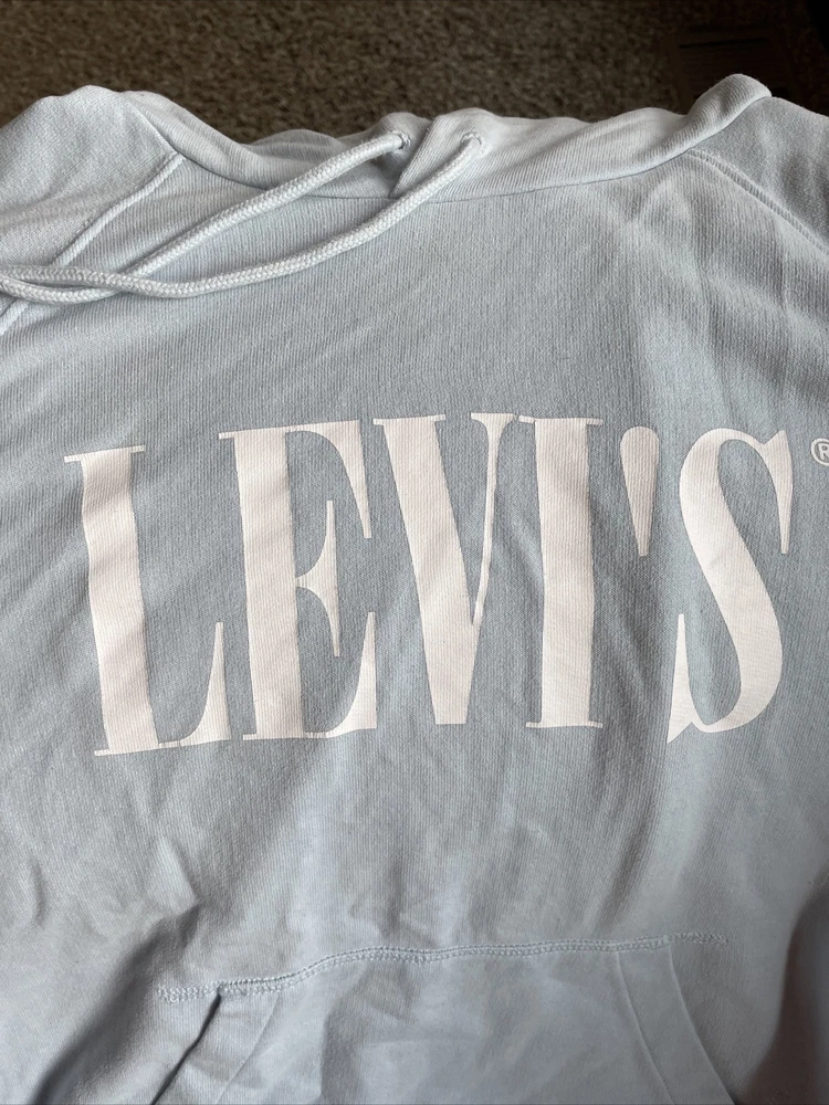 Levi's Women's Retro Graphic Hoodie Size Small Light Blue NWT. Chest is 42”, length is 26”, and sleeves are 27.5” from hood to wrist.