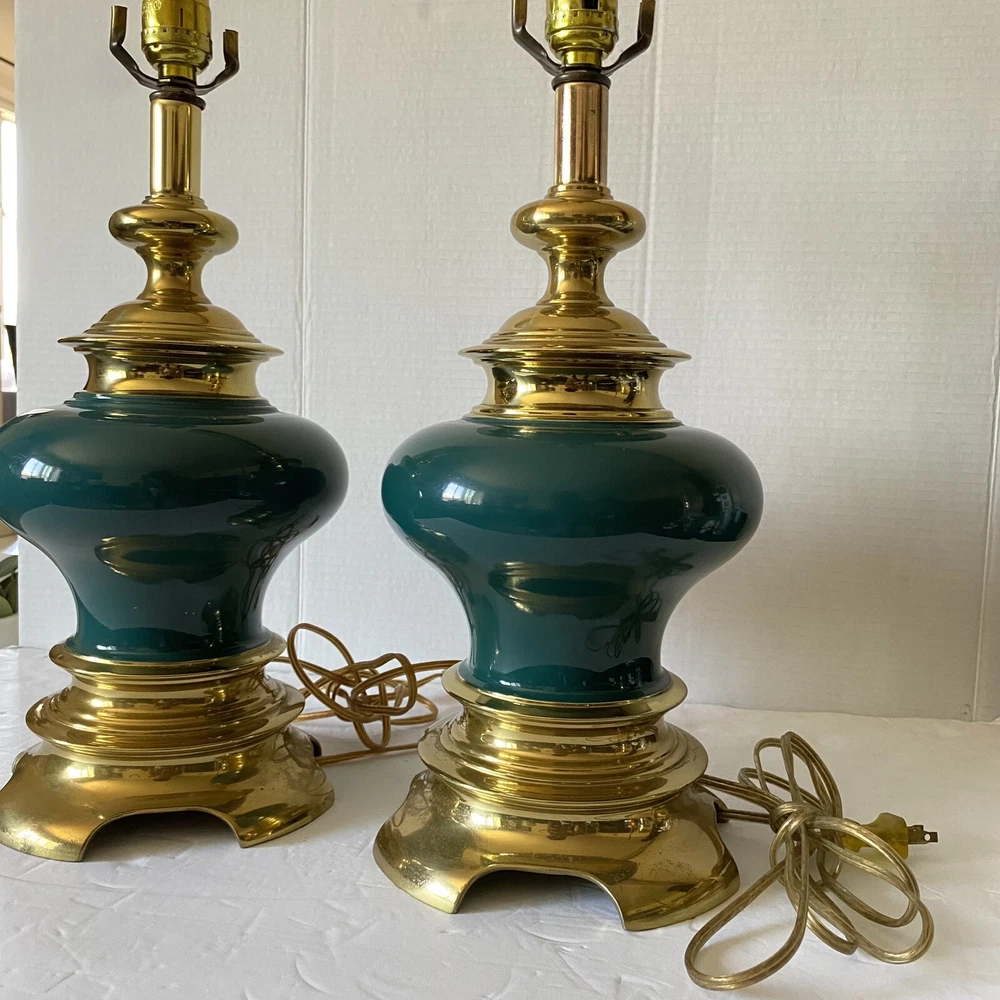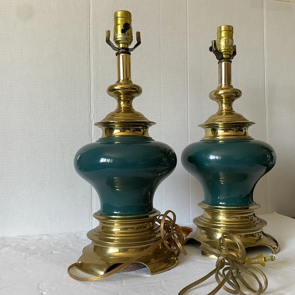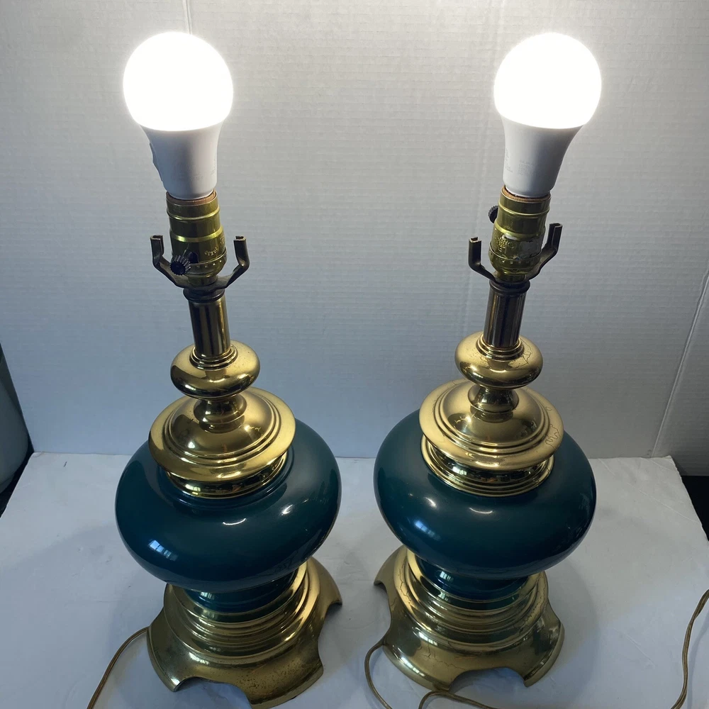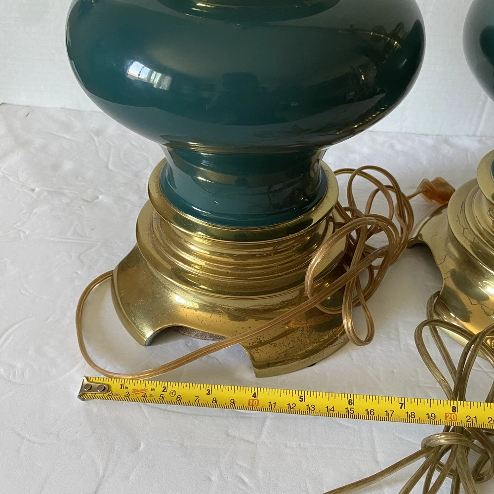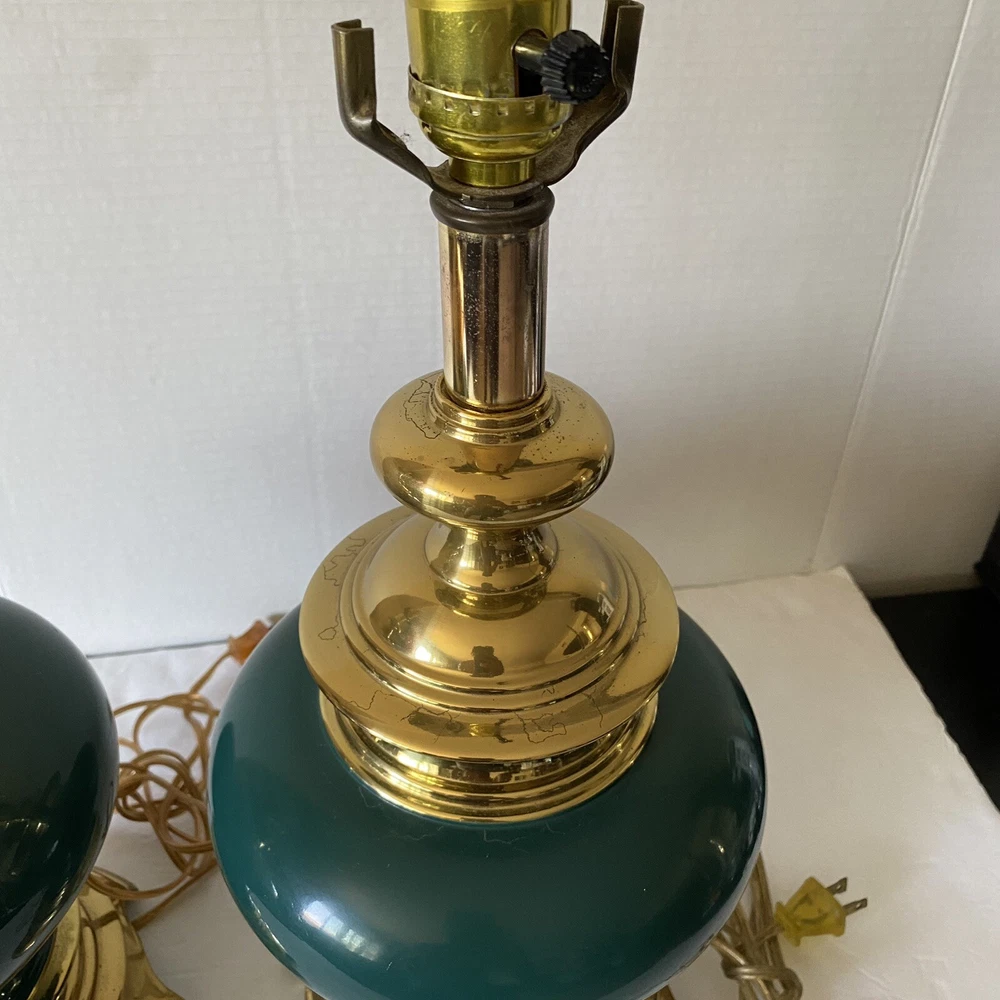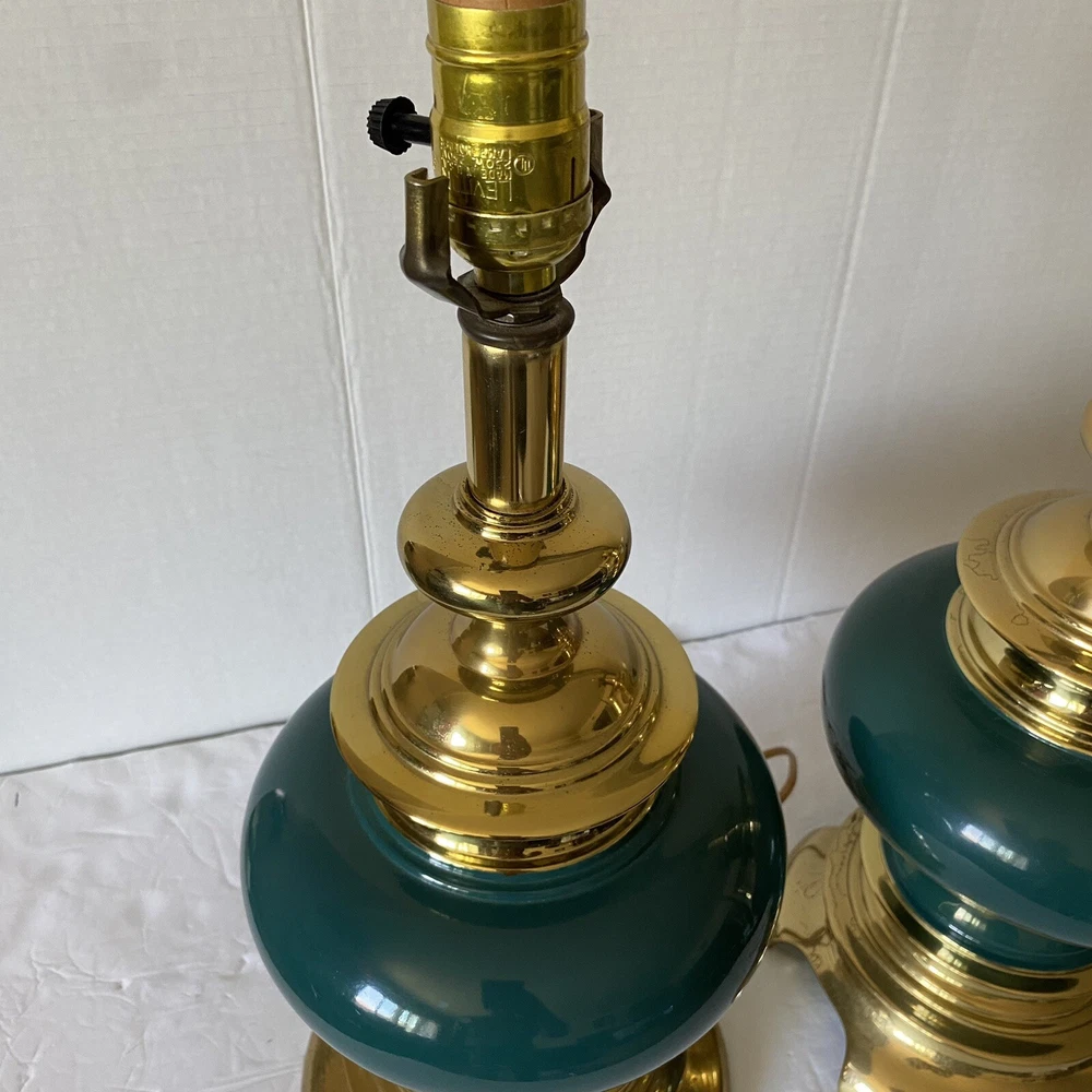 Add a touch of vintage charm to your living space with this Leviton Made In USA Big Turquoise Ceramic Brass Table Lamp. Crafted in 1992, this antique piece boasts a solid color pattern and is control by a switch. The lamp is made of brass and glass materials, with a green ceramic finish that gives it a unique appearance. Measuring 17 inches in height and 6.5 inches in width, this table lamp is corded and has a power source that is switch-controlled. The lamp is in the original and authentic Leviton brand, with no shade shape and a vintage style that is perfect for collectors. This piece is a must-have for anyone looking to add a touch of elegance and retro charm to their home decor. They both work good They don’t have the shade They do have wear and cracking on the base but are still very beautiful