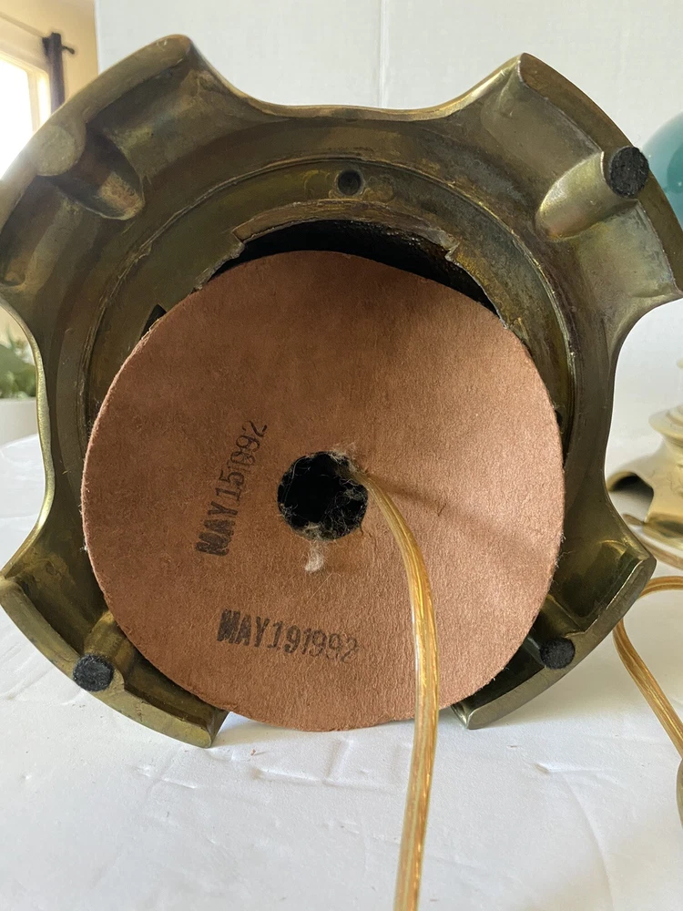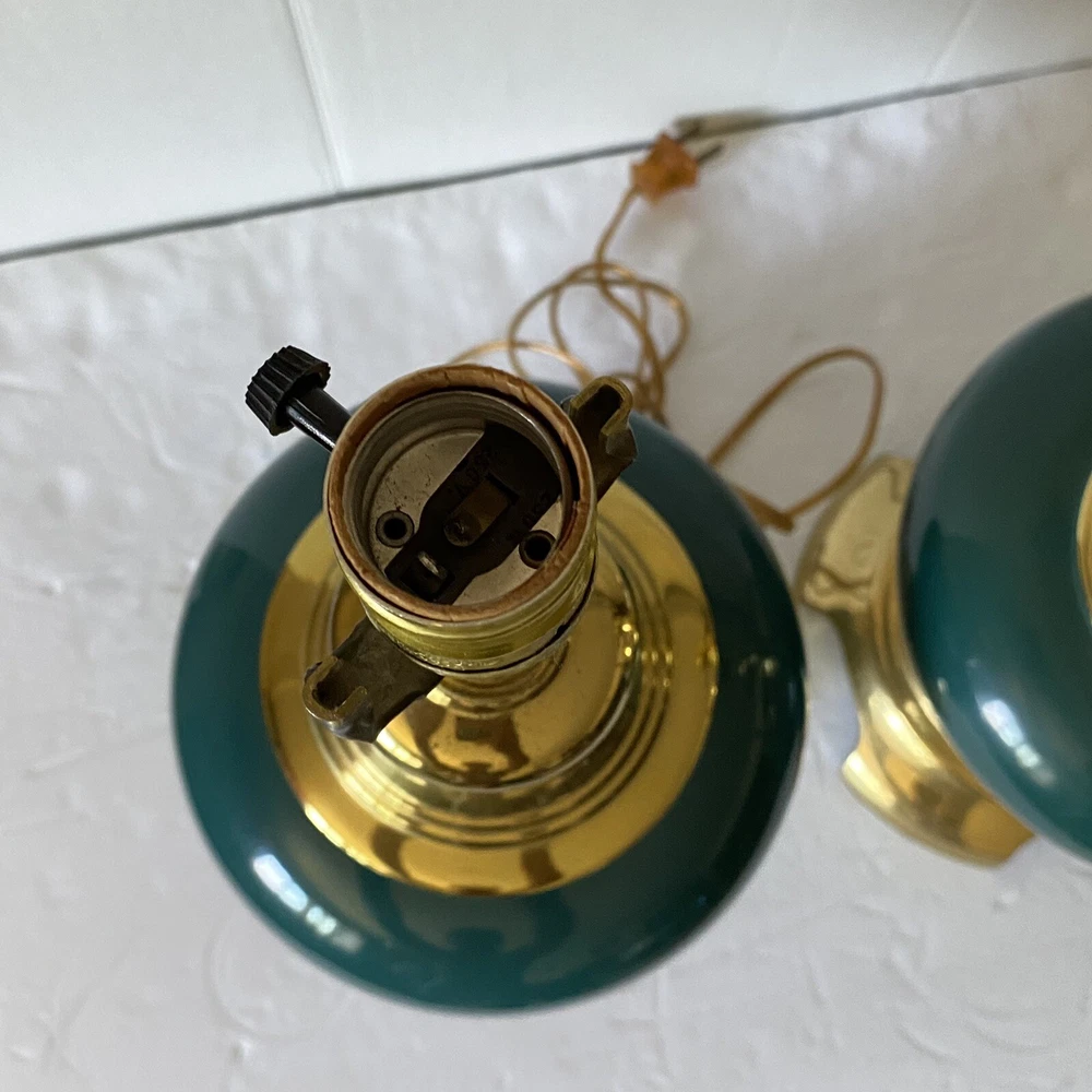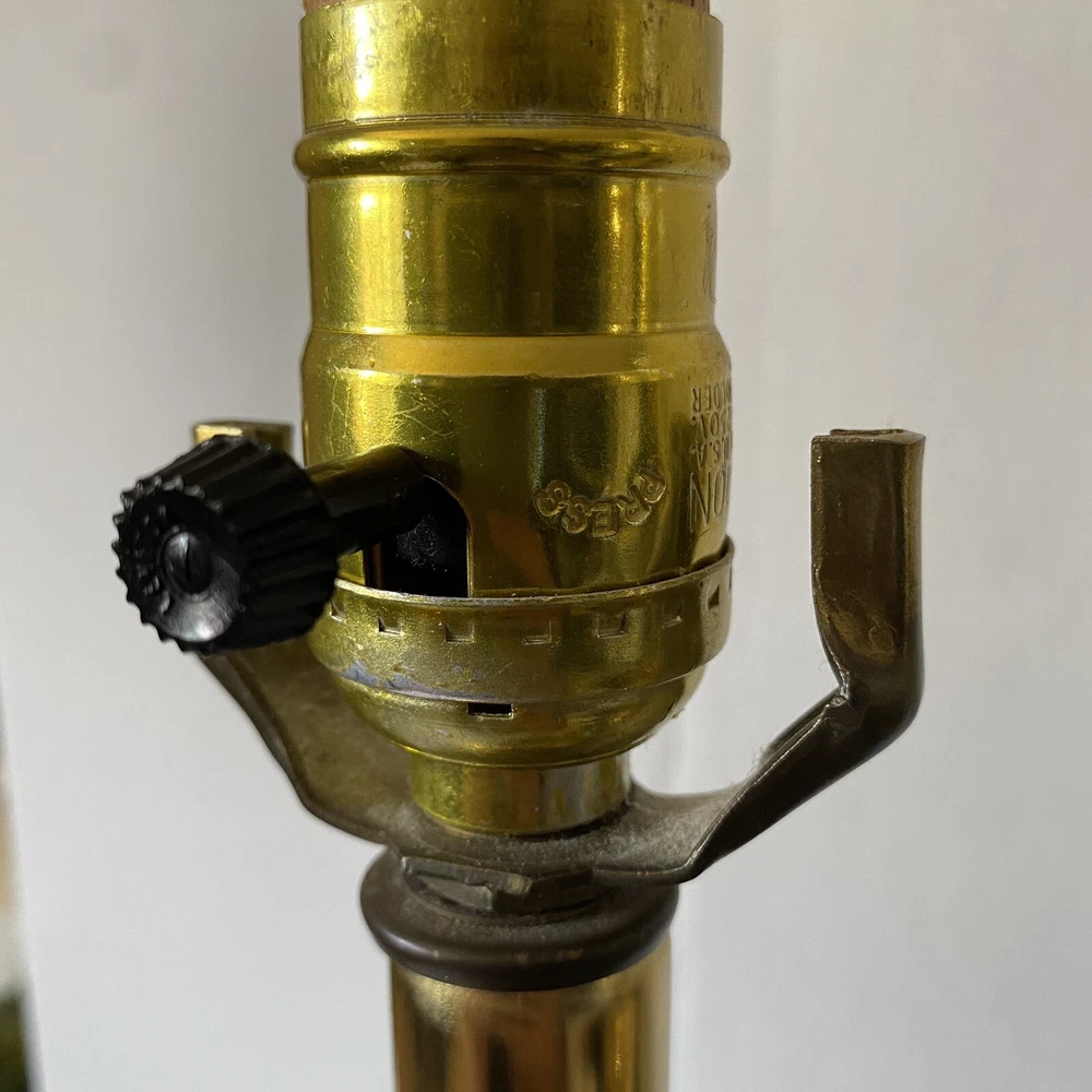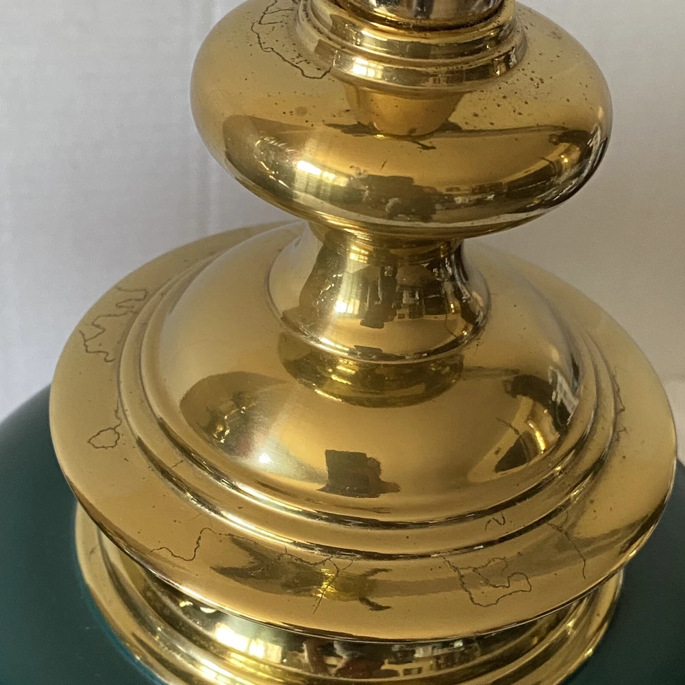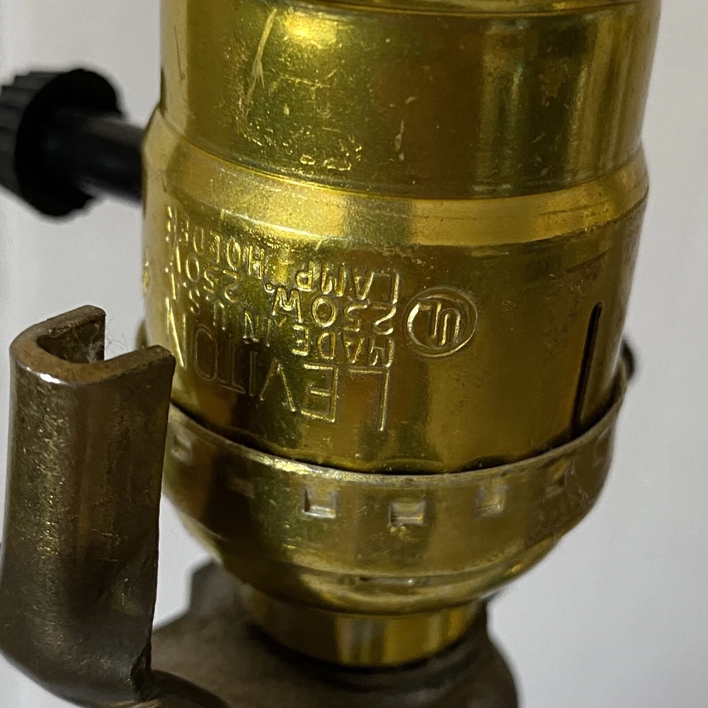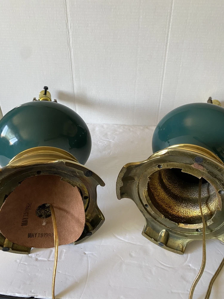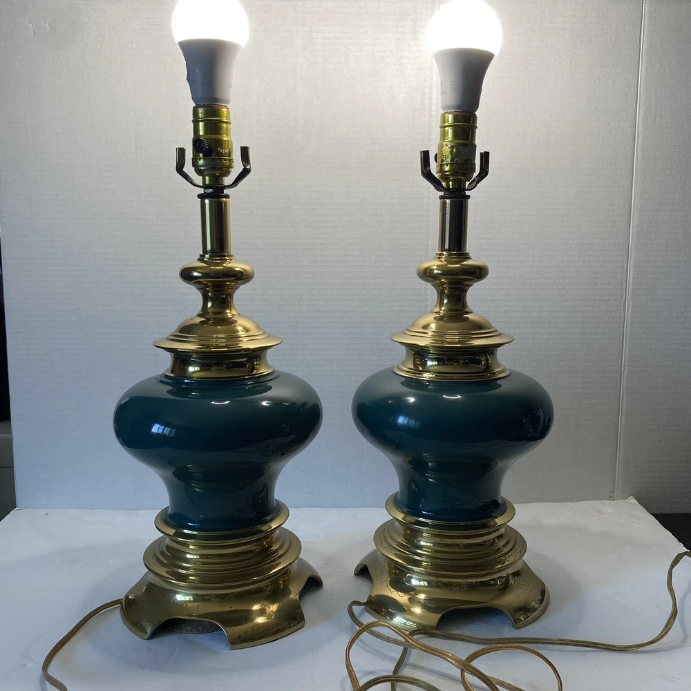 Add a touch of vintage charm to your living space with this Leviton Made In USA Big Turquoise Ceramic Brass Table Lamp. Crafted in 1992, this antique piece boasts a solid color pattern and is control by a switch. The lamp is made of brass and glass materials, with a green ceramic finish that gives it a unique appearance. Measuring 17 inches in height and 6.5 inches in width, this table lamp is corded and has a power source that is switch-controlled. The lamp is in the original and authentic Leviton brand, with no shade shape and a vintage style that is perfect for collectors. This piece is a must-have for anyone looking to add a touch of elegance and retro charm to their home decor. They both work good They don’t have the shade They do have wear and cracking on the base but are still very beautiful