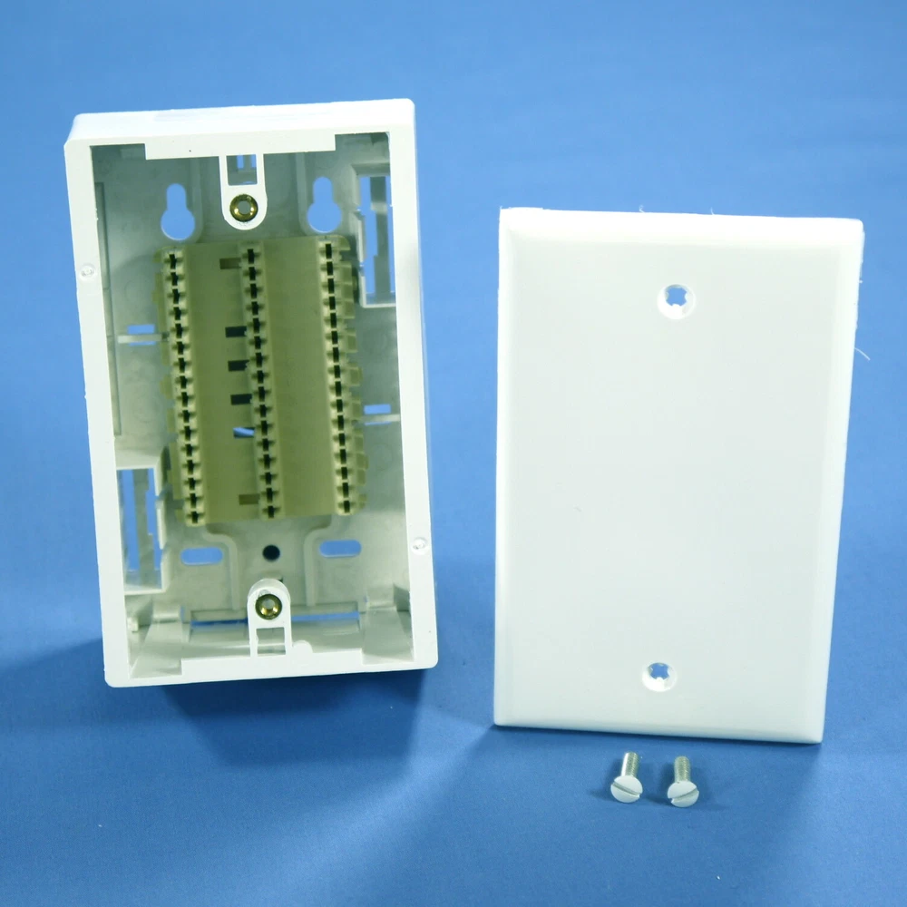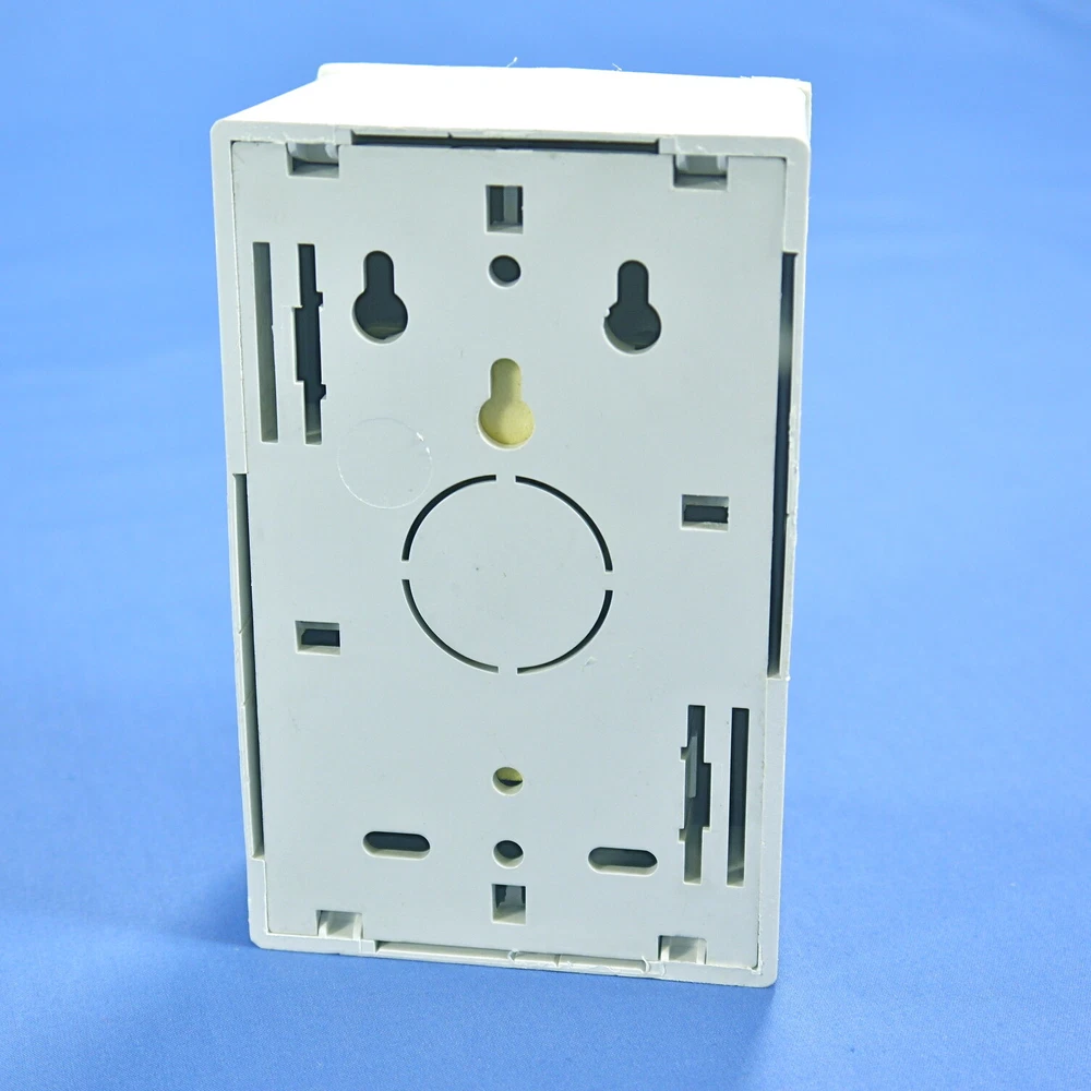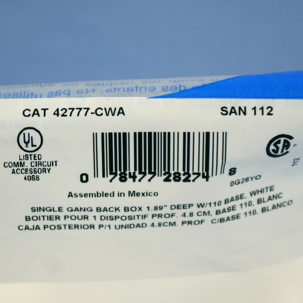 Fruit Ridge Tools, LLC Our eBay Store Contact Us Add to Favorite Sellers Leviton White Quickport Surface Mount Back Box 1.89" Deep w/ 110 Base 42777-CWA Product Details Quantity in Lot: 1 Brand: Leviton Part Number: 42777-CWA Color: White Type: Switch Configuration: Additional Features (if applicable): Voltage: Grade: Terminal Type(s): Ground: Leviton 42777-CWA white surface mount Quickport single gang backbox with a 110 base. Intended for use with Quickport face plates (both snap-in and Decora styles) for surface mounting on walls, dividers, cabinets, desks, and modular furniture. Features include: For use with low voltage wiring only(Class 2 and Class 3) Includes screw-mounted blank white cover plate Knockouts on all sides for cable entry Measures 1.89" deep for applications requiring a deeper wallbox such as: Leviton Duplex 106, Quad 106 and TR Plus covers or to accommodate an application that requires a more ample bend radius This is New Old Stock and is returnable for any reason. (SKU # L42777-CWA-EA; Weight: 0.3000 lbs.)