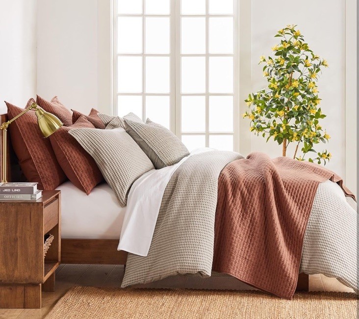 Complete Bedding Set. The Levtex Home Cross Stitch Full / Queen Quilt Set includes an 88x92 inch quilt and two standard shams (26x20). Crafted from 100% cotton and designed for all-season comfort, this lightweight full / queen quilt bedding set is ideal for guest rooms, shared bedrooms, or primary suites and perfect for daily relaxation or hosting overnight guests. Available in multiple colors. 100% Cotton Comfort. Made with a 100% cotton fabric and filled with a cotton-rich blend (cotton, polyester, and other fibers), this full / queen bedding set is breathable, soft, and pre-washed for extra comfort. Perfect for a comfortable sleep or layering throughout the year. Refined Cross-Stitch Detailing. This quilt queen size bedding set features a subtle vertical stitched texture inspired by intricate cross-stitching techniques. The tonal adobe-on-adobe stitching adds delicate depth and a handcrafted feel. Designed to bring tactile dimension and understated elegance to your space—ideal for contemporary, minimalist, or transitional bedrooms.