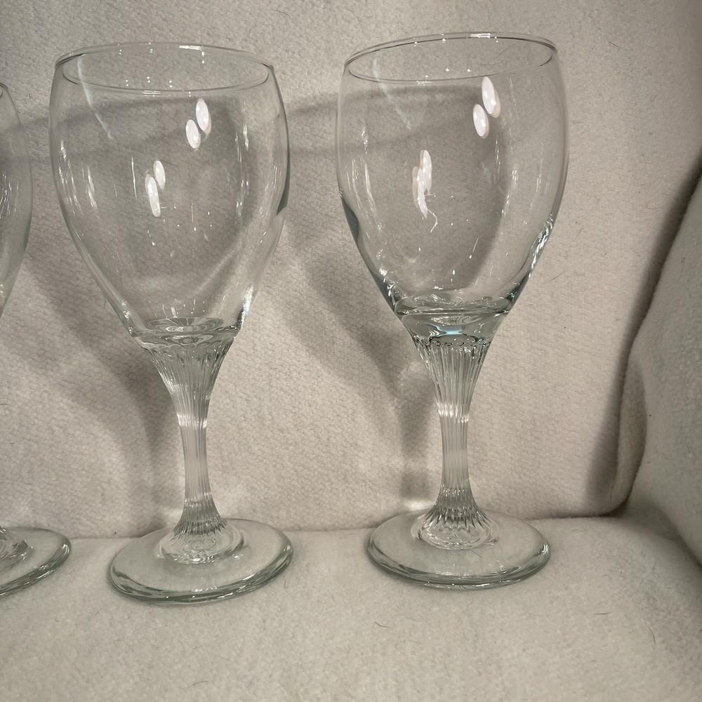 This set includes four-piece Libbey Audrey water goblets made of clear glass with a ribbed stem design. These round goblets have a capacity of 12 oz and measure 3" in diameter and 7.25" in height. They are vintage pieces from the 1970s, featuring a mid-century modern style and elegant hand-blown glass production. Each goblet weighs 3.2 lbs and bears the Libbey brand. Perfect for all occasions, these decorative goblets add a touch of sophistication to any table setting. Excellent condition. No chips or cracks.